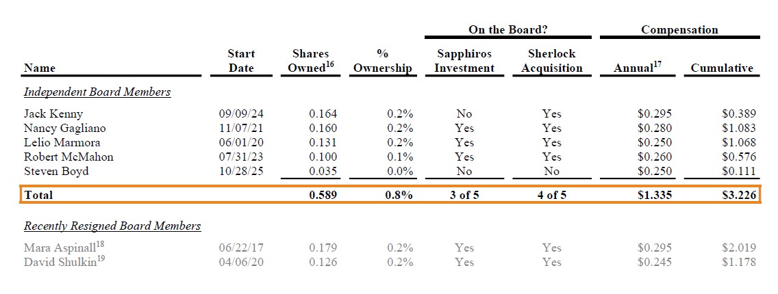 Despite this track record, the Board in 2025 increased its own annual stock-based awards by over 75%, from $105,000 to $185,000. Board members now earn annual compensation exceeding $250,000. Lelio Marmora and Nancy Gagliano have each earned over $1 million for their half-decade of service—a period during which shareholders have watched the value of their investment evaporate. The Board has been richly compensated for overseeing the destruction of shareholder value. That is not governance; it is a misalignment of interests that demands correction.