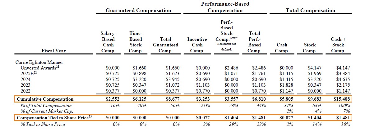 | 3. | Pay Without Performance. Over 90% of CEO Carrie Eglinton Manner’s compensation is not tied to share price performance. She has earned an estimated $15 million over her tenure while shareholders have lost 60% of their investment since 2023. Her incentives are plainly misaligned with shareholder interests. |