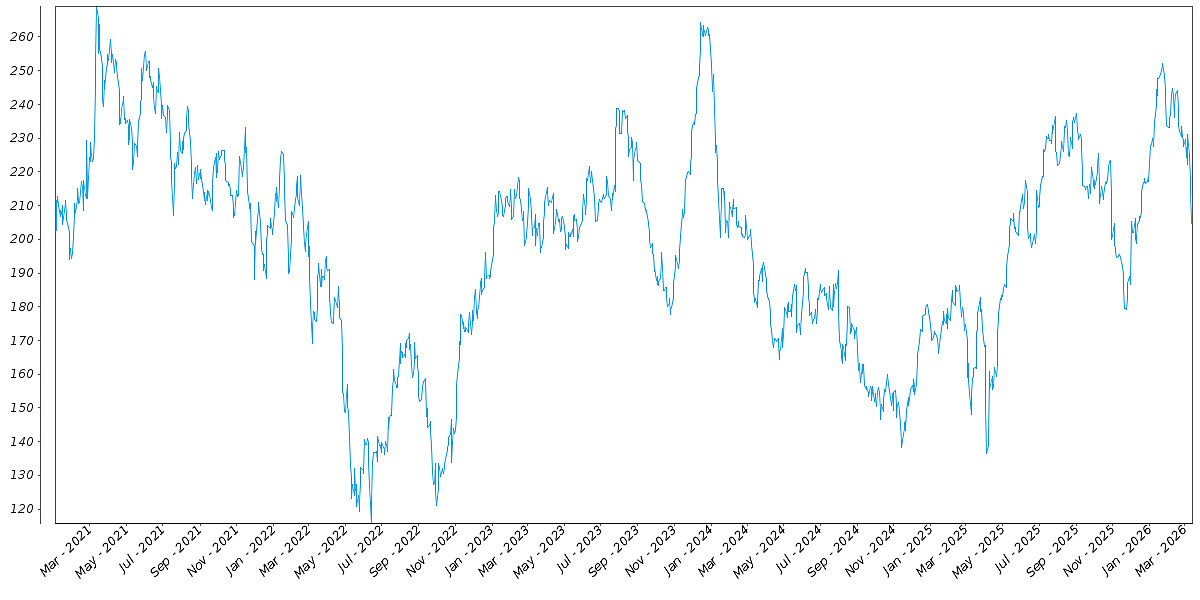 The following graph sets forth the daily historical performance of BA in the period from January 2, 2021 through the pricing date. We obtained this historical data from Bloomberg L.P. We have not independently verified the accuracy or completeness of the information obtained from Bloomberg L.P. The Closing Market Prices reflected in the graph below may have been adjusted to reflect certain corporate actions, such as stock splits and reverse stock splits. On the pricing date, the Closing Market Price of BA was $209.89.