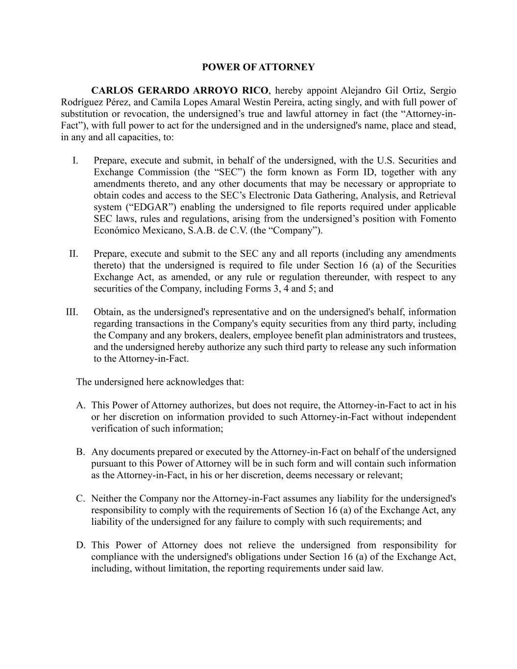 POWER OF ATTORNEY CARLOS GERARDO ARROYO RICO, hereby appoint Alejandro Gil Ortiz, Sergio Rodríguez Pérez, and Camila Lopes Amaral Westin Pereira, acting singly, and with full power of substitution or revocation, the undersigned’s true and lawful attorney in fact (the “Attorney-in- Fact”), with full power to act for the undersigned and in the undersigned's name, place and stead, in any and all capacities, to: I. Prepare, execute and submit, in behalf of the undersigned, with the U.S. Securities and Exchange Commission (the “SEC”) the form known as Form ID, together with any amendments thereto, and any other documents that may be necessary or appropriate to obtain codes and access to the SEC’s Electronic Data Gathering, Analysis, and Retrieval system (“EDGAR”) enabling the undersigned to file reports required under applicable SEC laws, rules and regulations, arising from the undersigned’s position with Fomento Económico Mexicano, S.A.B. de C.V. (the “Company”). II. Prepare, execute and submit to the SEC any and all reports (including any amendments thereto) that the undersigned is required to file under Section 16 (a) of the Securities Exchange Act, as amended, or any rule or regulation thereunder, with respect to any securities of the Company, including Forms 3, 4 and 5; and III. Obtain, as the undersigned's representative and on the undersigned's behalf, information regarding transactions in the Company's equity securities from any third party, including the Company and any brokers, dealers, employee benefit plan administrators and trustees, and the undersigned hereby authorize any such third party to release any such information to the Attorney-in-Fact. The undersigned here acknowledges that: A. This Power of Attorney authorizes, but does not require, the Attorney-in-Fact to act in his or her discretion on information provided to such Attorney-in-Fact without independent verification of such information; B. Any documents prepared or executed by the Attorney-in-Fact on behalf of the undersigned pursuant to this Power of Attorney will be in such form and will contain such information as the Attorney-in-Fact, in his or her discretion, deems necessary or relevant; C. Neither the Company nor the Attorney-in-Fact assumes any liability for the undersigned's responsibility to comply with the requirements of Section 16 (a) of the Exchange Act, any liability of the undersigned for any failure to comply with such requirements; and D. This Power of Attorney does not relieve the undersigned from responsibility for compliance with the undersigned's obligations under Section 16 (a) of the Exchange Act, including, without limitation, the reporting requirements under said law.
