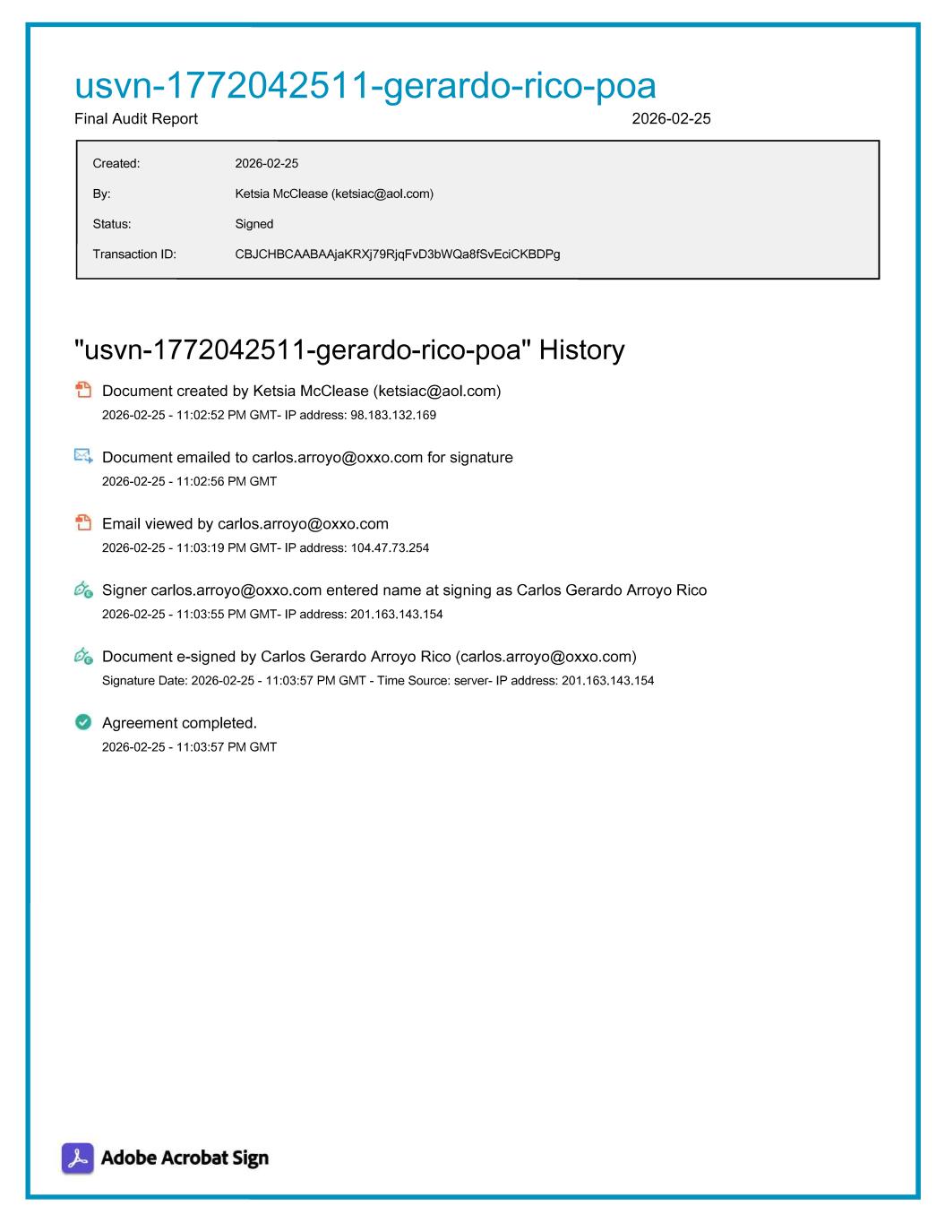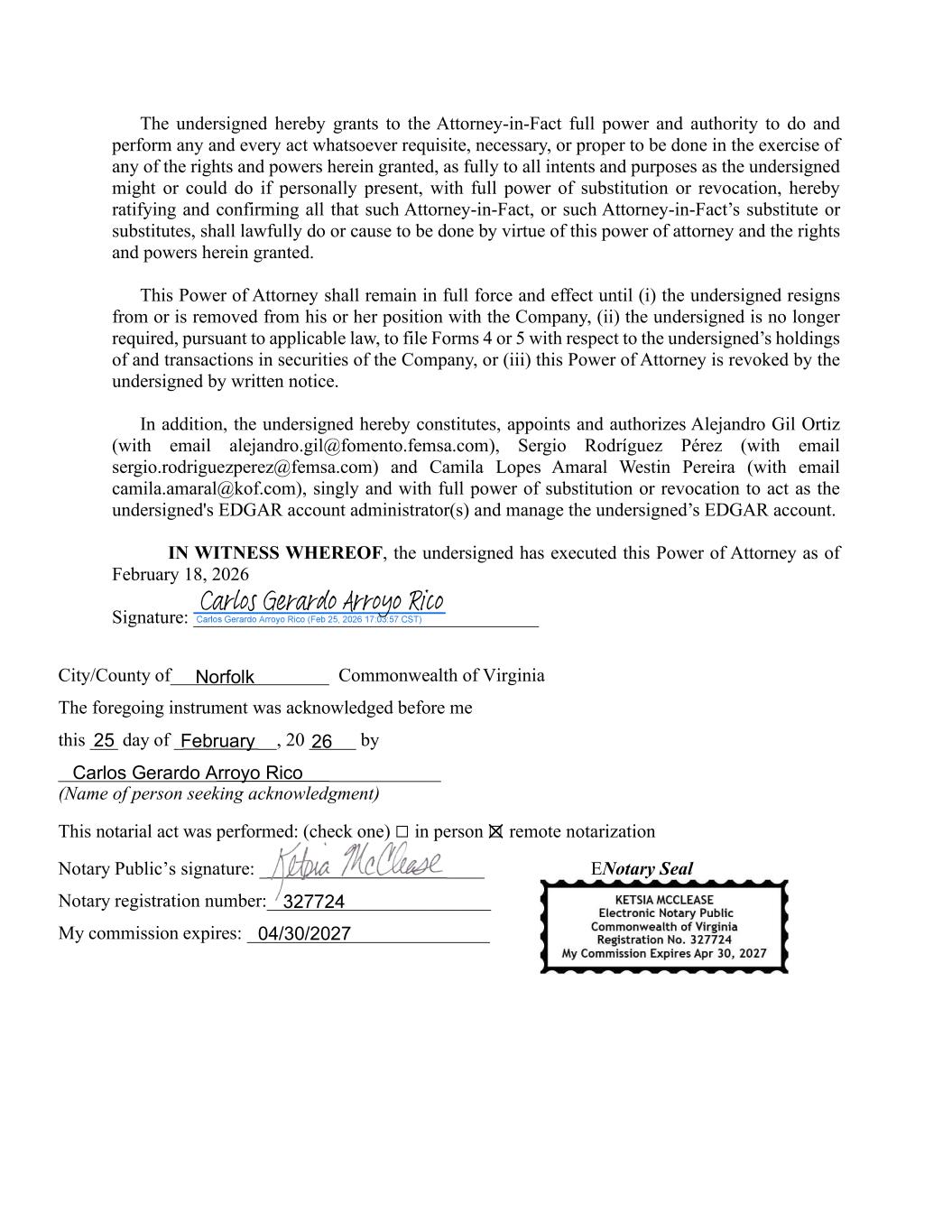 The undersigned hereby grants to the Attorney-in-Fact full power and authority to do and perform any and every act whatsoever requisite, necessary, or proper to be done in the exercise of any of the rights and powers herein granted, as fully to all intents and purposes as the undersigned might or could do if personally present, with full power of substitution or revocation, hereby ratifying and confirming all that such Attorney-in-Fact, or such Attorney-in-Fact’s substitute or substitutes, shall lawfully do or cause to be done by virtue of this power of attorney and the rights and powers herein granted. This Power of Attorney shall remain in full force and effect until (i) the undersigned resigns from or is removed from his or her position with the Company, (ii) the undersigned is no longer required, pursuant to applicable law, to file Forms 4 or 5 with respect to the undersigned’s holdings of and transactions in securities of the Company, or (iii) this Power of Attorney is revoked by the undersigned by written notice. In addition, the undersigned hereby constitutes, appoints and authorizes Alejandro Gil Ortiz (with email alejandro.gil@fomento.femsa.com), Sergio Rodríguez Pérez (with email sergio.rodriguezperez@femsa.com) and Camila Lopes Amaral Westin Pereira (with email camila.amaral@kof.com), singly and with full power of substitution or revocation to act as the undersigned's EDGAR account administrator(s) and manage the undersigned’s EDGAR account. IN WITNESS WHEREOF, the undersigned has executed this Power of Attorney as of February 18, 2026 Signature: _____________________________________ City/County of_________________ Commonwealth of Virginia The foregoing instrument was acknowledged before me this ___ day of _ __, 20 _____ by _________________ ____________ (Name of person seeking acknowledgment) This notarial act was performed: (check one) in person remote notarization Notary Public’s signature: ________________________ ENotary Seal Notary registration number:________________________ My commission expires: __________________________ Carlos Gerardo Arroyo Rico 327724 04/30/2027 Norfolk 25 26February