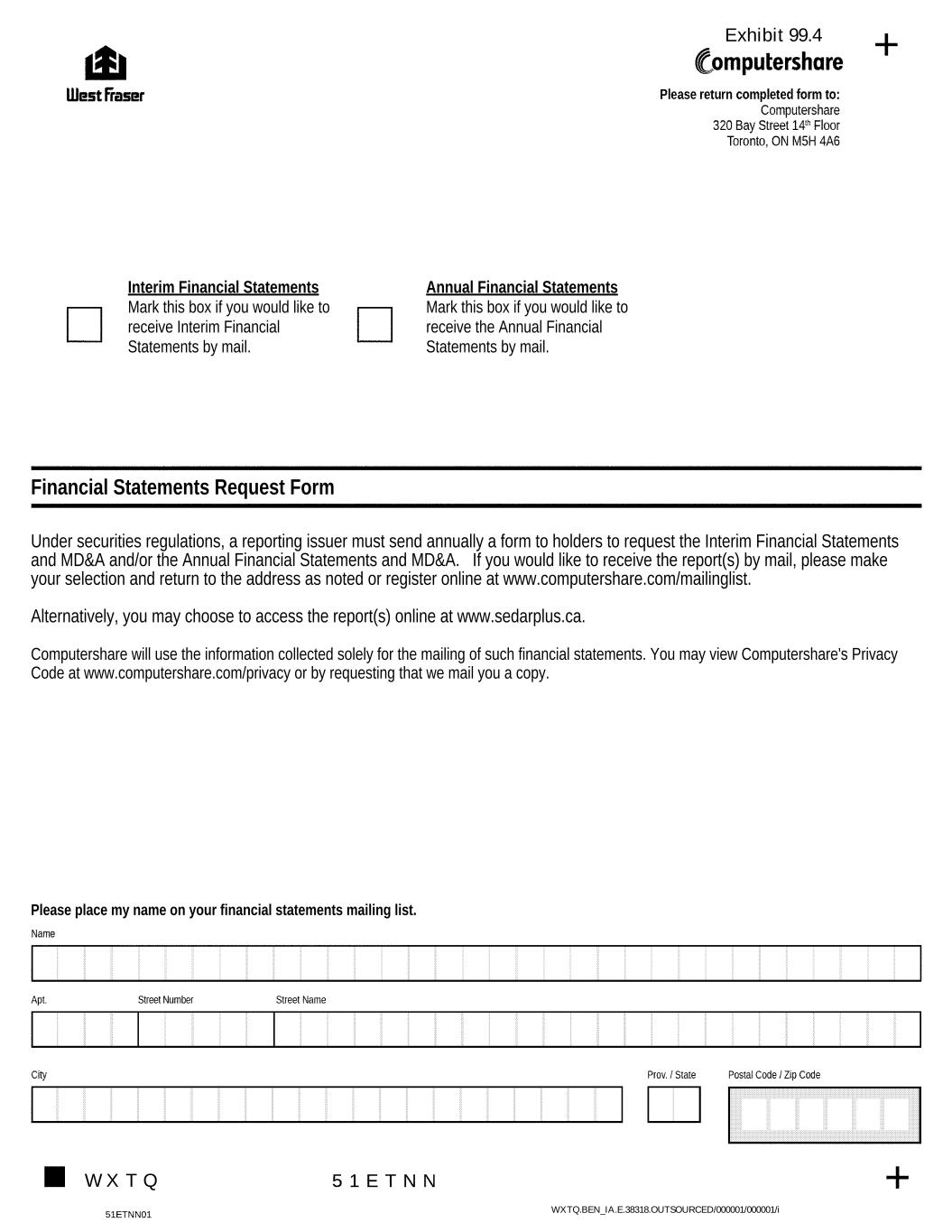 Under securities regulations, a reporting issuer must send annually a form to holders to request the Interim Financial Statements and MD&A and/or the Annual Financial Statements and MD&A. If you would like to receive the report(s) by mail, please make your selection and return to the address as noted or register online at www.computershare.com/mailinglist. Alternatively, you may choose to access the report(s) online at www.sedarplus.ca. Computershare will use the information collected solely for the mailing of such financial statements. You may view Computershare's Privacy Code at www.computershare.com/privacy or by requesting that we mail you a copy. WXTQ.BEN_IA.E.38318.OUTSOURCED/000001/000001/i WX T Q Annual Financial Statements Mark this box if you would like to receive the Annual Financial Statements by mail. Financial Statements Request Form Interim Financial Statements Mark this box if you would like to receive Interim Financial Statements by mail. Please place my name on your financial statements mailing list. Exhibit 99.4