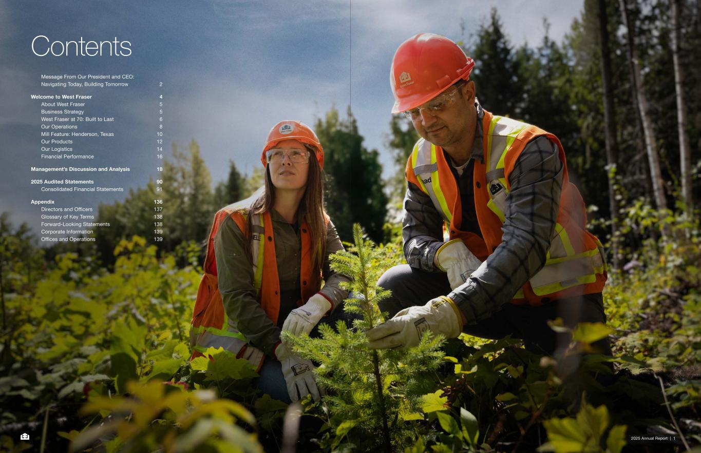 2025 Annual Report | 1 Contents Message From Our President and CEO: Navigating Today, Building Tomorrow 2 Welcome to West Fraser 4 About West Fraser 5 Business Strategy 5 West Fraser at 70: Built to Last 6 Our Operations 8 Mill Feature: Henderson, Texas 10 Our Products 12 Our Logistics 14 Financial Performance 16 Management’s Discussion and Analysis 18 2025 Audited Statements 90 Consolidated Financial Statements 91 Appendix 136 Directors and Officers 137 Glossary of Key Terms 138 Forward-Looking Statements 138 Corporate Information 139 Offices and Operations 139