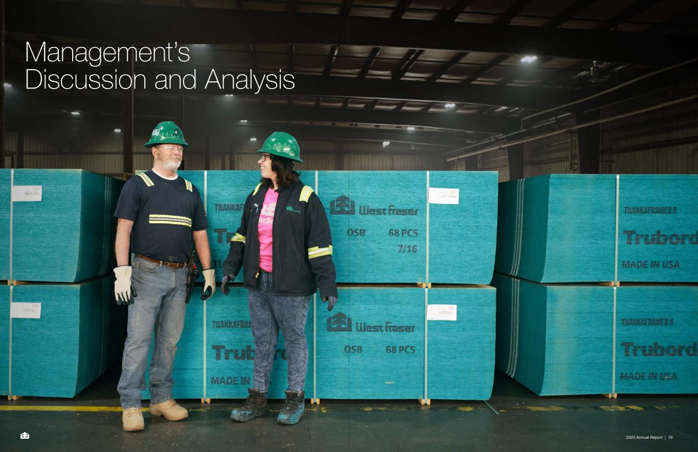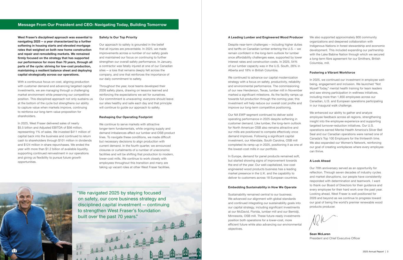 2025 Annual Report | 3 A Leading Lumber and Engineered Wood Producer Despite near-term challenges — including higher duties and tariffs on Canadian lumber entering the U.S. — we remain confident in the long-term outlook for lumber once affordability challenges ease, supported by lower interest rates and construction costs. In 2025, 54% of our lumber capacity was in the U.S. South, 28% in Alberta and 18% in British Columbia. We continued to advance our capital modernization strategy with a focus on safety, productivity, reliability and environmental performance. The commissioning of our new Henderson, Texas, lumber mill in November marked a significant milestone. As the facility ramps up towards full production through the coming year, this investment will help reduce our overall cost profile and improve our long-term competitive positioning. Our NA EWP segment continued to deliver solid operating performance in 2025 despite softening in customer demand. Like lumber, the long-term outlook for North American OSB also remains attractive and our mills are positioned to compete effectively once demand improves. Following a significant capital investment, our Allendale, South Carolina, OSB mill completed its ramp-up in 2025, positioning it as one of the lowest-cost mills in our portfolio. In Europe, demand for panel products remained soft, but started showing signs of improvement towards the end of the year. Our well-capitalized, low‑cost engineered wood products business has a leading market presence in the U.K. and the capability to deliver to customers across 18 European countries. Embedding Sustainability in How We Operate Sustainability remained central to our business. We advanced our alignment with global standards and continued integrating our sustainability goals into our capital strategy, including significant investments at our McDavid, Florida, lumber mill and our Bemidji, Minnesota, OSB mill. These future-ready investments position both operations for a lower-cost, more efficient future while also advancing our environmental objectives. We also supported approximately 800 community organizations and deepened collaboration with Indigenous Nations in forest stewardship and economic development. This included expanding our partnership with the Lake Babine Nation through which we secured a long-term fibre agreement for our Smithers, British Columbia, mill. Fostering a Vibrant Workforce In 2025, we continued our investment in employee well- being, engagement and inclusion. We launched “Not Myself Today,” mental health training for team leaders and saw strong participation in wellness initiatives, including more than 1,850 employees across our Canadian, U.S. and European operations participating in our inaugural walk challenge. We enhanced our ability to gather and analyze employee feedback across all regions, strengthening insight into the employee experience and supporting targeted turnover-reduction initiatives. Our U.S. operations earned Mental Health America’s Silver Bell Seal and our Canadian operations were named one of Canada’s Top 100 Employers for the thirteenth time. We also expanded our Women’s Network, reinforcing our goal of creating workplaces where every employee can thrive. A Look Ahead Our 70th anniversary served as an opportunity for reflection. Through seven decades of industry cycles and market disruptions, our people have consistently responded with determination and teamwork. I want to thank our Board of Directors for their guidance and every employee for their hard work over the past year. Looking ahead, West Fraser is well positioned for 2026 and beyond as we continue to progress toward our goal of being the world’s premier renewable wood products producer. Sean McLaren President and Chief Executive Officer West Fraser’s disciplined approach was essential to navigating 2025 — a year characterized by a further softening in housing starts and elevated mortgage rates that weighed on both new home construction and repair and remodelling markets. We remained firmly focused on the strategy that has supported our performance for more than 70 years, through all parts of the cycle: striving for low-cost production, maintaining a resilient balance sheet and deploying capital strategically across our operations. With a continuous focus on cost, aligning production with customer demand and advancing targeted capital investments, we are managing through a challenging market environment while preserving our competitive position. This disciplined approach not only sustains us at the bottom of the cycle but strengthens our ability to capture value when markets improve, continuing to reinforce our long-term value proposition for shareholders. In 2025, West Fraser delivered sales of nearly $5.5 billion and Adjusted EBITDA of $56 million, representing 1% of sales. We invested $411 million of capital back into the business and continued to return cash to shareholders through $101 million in dividends and $124 million in share repurchases. We ended the year with more than $1.2 billion of available liquidity, supporting continued reinvestment in our operations and giving us flexibility to pursue future growth opportunities. Safety Is Our Top Priority Our approach to safety is grounded in the belief that all injuries are preventable. In 2025, we made improvements across a number of our safety goals and maintained our focus on continuing to further strengthen our overall safety performance. In January, a contractor was fatally injured at one of our Canadian sites — a loss that remains deeply felt across the company, and one that reinforces the importance of our daily commitment to safety. Throughout the year, local teams developed their 2026 safety plans, drawing on lessons learned and reinforcing the expectations we set for ourselves. Our commitment is unwavering: everyone should leave our sites healthy and safe each day and that principle will continue to guid