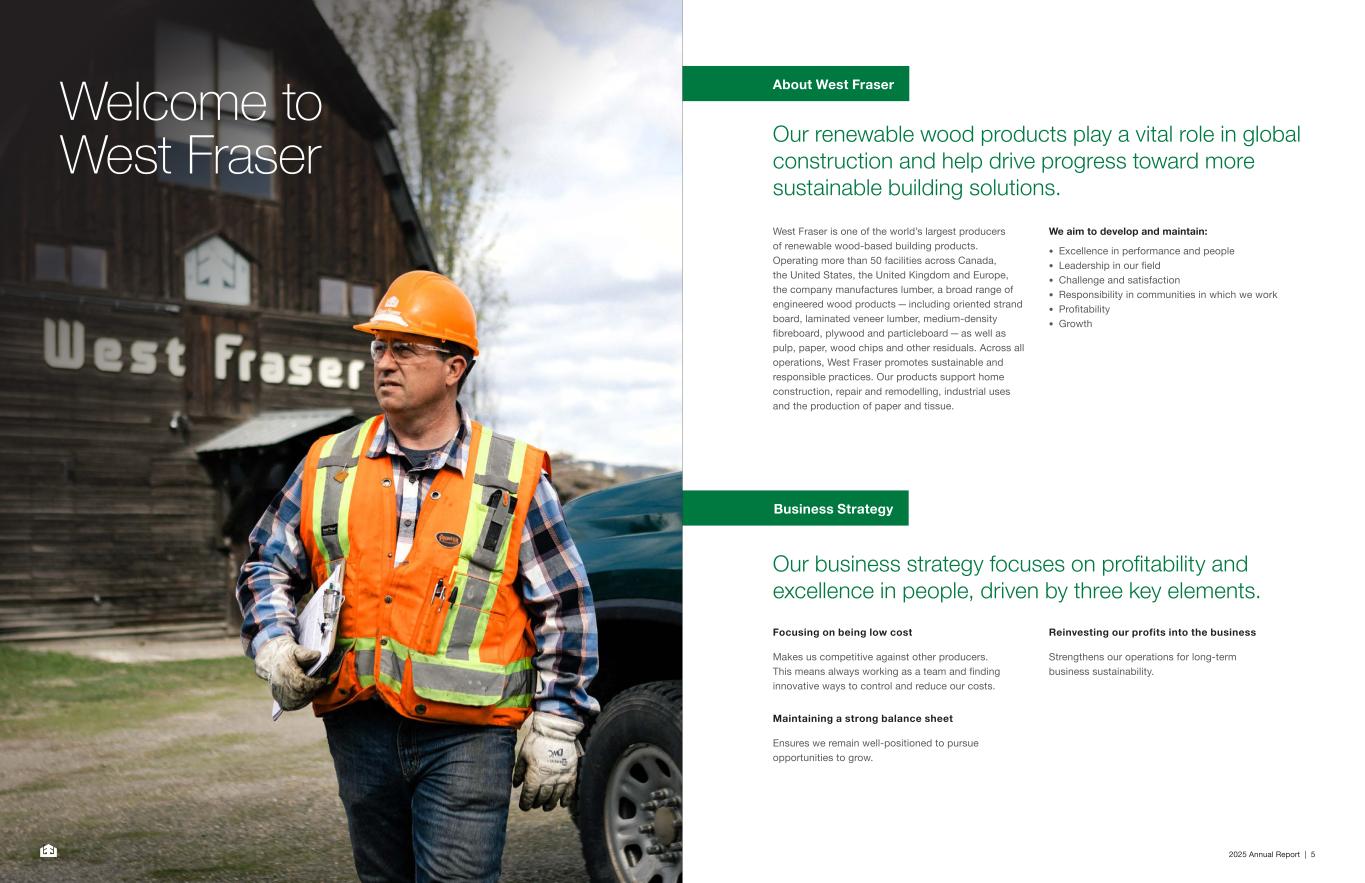 2025 Annual Report | 5 Our renewable wood products play a vital role in global construction and help drive progress toward more sustainable building solutions. West Fraser is one of the world’s largest producers of renewable wood-based building products. Operating more than 50 facilities across Canada, the United States, the United Kingdom and Europe, the company manufactures lumber, a broad range of engineered wood products — including oriented strand board, laminated veneer lumber, medium-density fibreboard, plywood and particleboard — as well as pulp, paper, wood chips and other residuals. Across all operations, West Fraser promotes sustainable and responsible practices. Our products support home construction, repair and remodelling, industrial uses and the production of paper and tissue. We aim to develop and maintain: • Excellence in performance and people • Leadership in our field • Challenge and satisfaction • Responsibility in communities in which we work • Profitability • Growth Our business strategy focuses on profitability and excellence in people, driven by three key elements. Focusing on being low cost Makes us competitive against other producers. This means always working as a team and finding innovative ways to control and reduce our costs. Maintaining a strong balance sheet Ensures we remain well‑positioned to pursue opportunities to grow. Reinvesting our profits into the business Strengthens our operations for long-term business sustainability. About West FraserWelcome to West Fraser Business Strategy