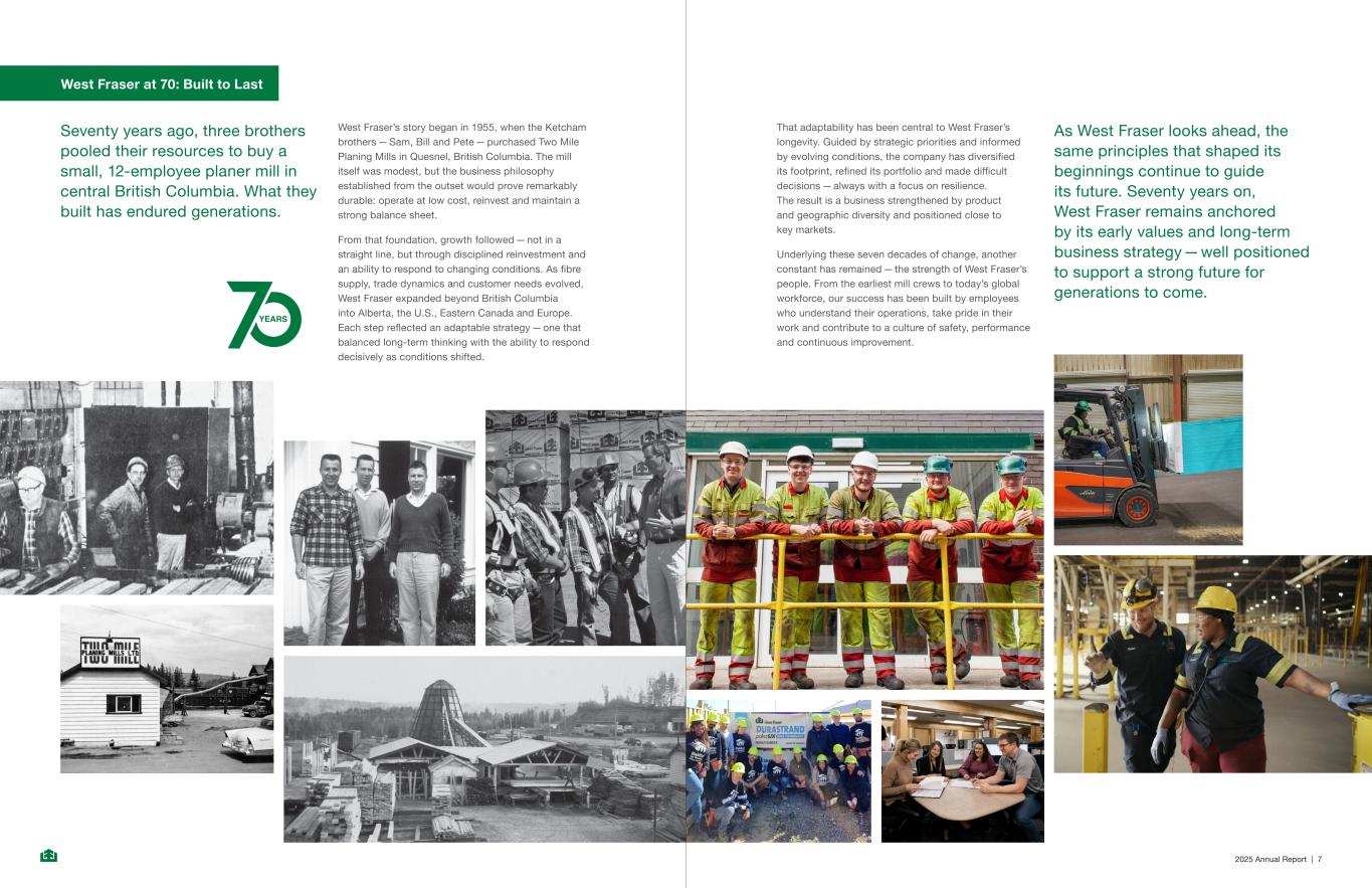 YEARS 2025 Annual Report | 7 West Fraser at 70: Built to Last Seventy years ago, three brothers pooled their resources to buy a small, 12-employee planer mill in central British Columbia. What they built has endured generations. West Fraser’s story began in 1955, when the Ketcham brothers — Sam, Bill and Pete — purchased Two Mile Planing Mills in Quesnel, British Columbia. The mill itself was modest, but the business philosophy established from the outset would prove remarkably durable: operate at low cost, reinvest and maintain a strong balance sheet. From that foundation, growth followed — not in a straight line, but through disciplined reinvestment and an ability to respond to changing conditions. As fibre supply, trade dynamics and customer needs evolved, West Fraser expanded beyond British Columbia into Alberta, the U.S., Eastern Canada and Europe. Each step reflected an adaptable strategy — one that balanced long-term thinking with the ability to respond decisively as conditions shifted. That adaptability has been central to West Fraser’s longevity. Guided by strategic priorities and informed by evolving conditions, the company has diversified its footprint, refined its portfolio and made difficult decisions — always with a focus on resilience. The result is a business strengthened by product and geographic diversity and positioned close to key markets. Underlying these seven decades of change, another constant has remained — the strength of West Fraser’s people. From the earliest mill crews to today’s global workforce, our success has been built by employees who understand their operations, take pride in their work and contribute to a culture of safety, performance and continuous improvement. As West Fraser looks ahead, the same principles that shaped its beginnings continue to guide its future. Seventy years on, West Fraser remains anchored by its early values and long‑term business strategy — well positioned to support a strong future for generations to come.