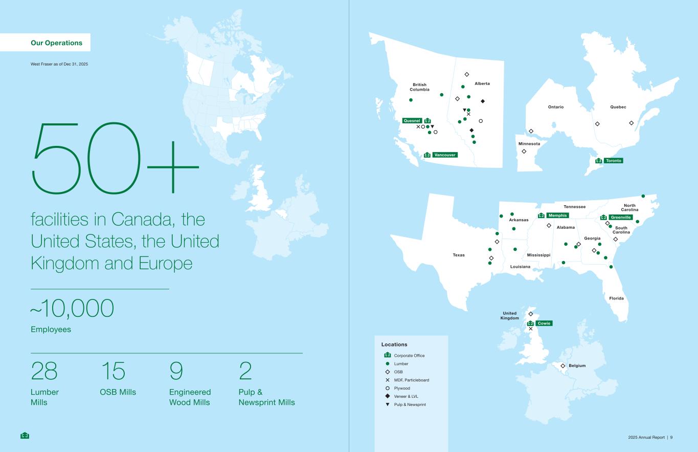 2025 Annual Report | 9 Quesnel Vancouver British Columbia Alberta Toronto Ontario Minnesota Quebec Memphis Greenville Texas Arkansas Louisiana Mississippi Tennessee Alabama Florida Georgia South Carolina North Carolina Cowie United Kingdom Belgium Locations Corporate Office Lumber OSB MDF, Particleboard Plywood Veneer & LVL Pulp & Newsprint 28 Lumber Mills 15 OSB Mills 9 Engineered Wood Mills 2 Pulp & Newsprint Mills ~10,000 Employees Our Operations 50+ facilities in Canada, the United States, the United Kingdom and Europe West Fraser as of Dec 31, 2025