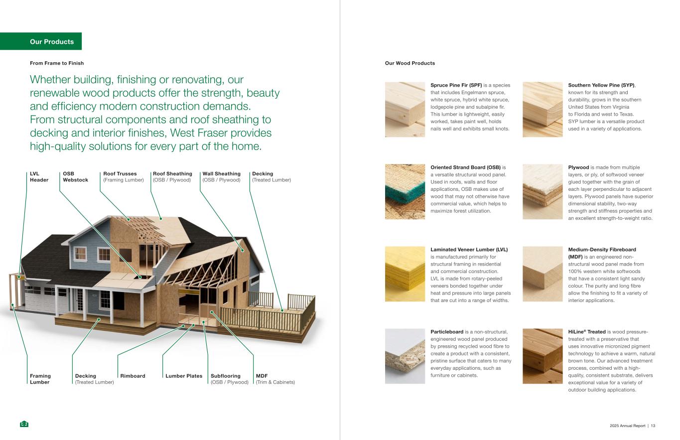 LVL Header Framing Lumber OSB Webstock Decking (Treated Lumber) Roof Trusses (Framing Lumber) Rimboard Roof Sheathing (OSB / Plywood) Lumber Plates Wall Sheathing (OSB / Plywood) Decking (Treated Lumber) Subflooring (OSB / Plywood) MDF (Trim & Cabinets) 2025 Annual Report | 13 Our Wood Products Spruce Pine Fir (SPF) is a species that includes Engelmann spruce, white spruce, hybrid white spruce, lodgepole pine and subalpine fir. This lumber is lightweight, easily worked, takes paint well, holds nails well and exhibits small knots. Plywood is made from multiple layers, or ply, of softwood veneer glued together with the grain of each layer perpendicular to adjacent layers. Plywood panels have superior dimensional stability, two-way strength and stiffness properties and an excellent strength-to-weight ratio. Particleboard is a non-structural, engineered wood panel produced by pressing recycled wood fibre to create a product with a consistent, pristine surface that caters to many everyday applications, such as furniture or cabinets. HiLine® Treated is wood pressure- treated with a preservative that uses innovative micronized pigment technology to achieve a warm, natural brown tone. Our advanced treatment process, combined with a high- quality, consistent substrate, delivers exceptional value for a variety of outdoor building applications. Oriented Strand Board (OSB) is a versatile structural wood panel. Used in roofs, walls and floor applications, OSB makes use of wood that may not otherwise have commercial value, which helps to maximize forest utilization. Medium-Density Fibreboard (MDF) is an engineered non- structural wood panel made from 100% western white softwoods that have a consistent light sandy colour. The purity and long fibre allow the finishing to fit a variety of interior applications. Southern Yellow Pine (SYP), known for its strength and durability, grows in the southern United States from Virginia to Florida and west to Texas. SYP lumber is a versatile product used in a variety of applications. Laminated Veneer Lumber (LVL) is manufactured primarily for structural framing in residential and commercial construction. LVL is made from rotary-peeled veneers bonded together under heat and pressure into large panels that are cut into a range of widths. From Frame to Finish Whether building, finishing or renovating, our renewable wood products offer the strength, beauty and efficiency modern construction demands. From structural components and roof sheathing to decking and interior finishes, West Fraser provides high‑quality solutions for every part of the home. Our Products