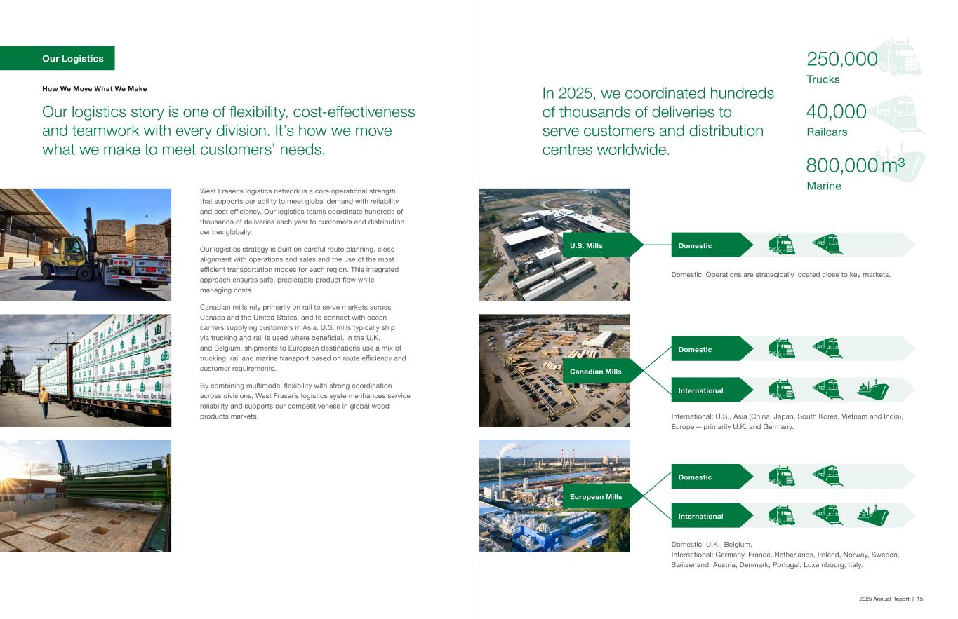 2025 Annual Report | 15 How We Move What We Make Our logistics story is one of flexibility, cost‑effectiveness and teamwork with every division. It’s how we move what we make to meet customers’ needs. In 2025, we coordinated hundreds of thousands of deliveries to serve customers and distribution centres worldwide. West Fraser’s logistics network is a core operational strength that supports our ability to meet global demand with reliability and cost efficiency. Our logistics teams coordinate hundreds of thousands of deliveries each year to customers and distribution centres globally. Our logistics strategy is built on careful route planning, close alignment with operations and sales and the use of the most efficient transportation modes for each region. This integrated approach ensures safe, predictable product flow while managing costs. Canadian mills rely primarily on rail to serve markets across Canada and the United States, and to connect with ocean carriers supplying customers in Asia. U.S. mills typically ship via trucking and rail is used where beneficial. In the U.K. and Belgium, shipments to European destinations use a mix of trucking, rail and marine transport based on route efficiency and customer requirements. By combining multimodal flexibility with strong coordination across divisions, West Fraser’s logistics system enhances service reliability and supports our competitiveness in global wood products markets. 250,000 Trucks 40,000 Railcars 800,000 m³ Marine Domestic International Domestic International Domestic Domestic: Operations are strategically located close to key markets. International: U.S., Asia (China, Japan, South Korea, Vietnam and India), Europe — primarily U.K. and Germany. Domestic: U.K., Belgium. International: Germany, France, Netherlands, Ireland, Norway, Sweden, Switzerland, Austria, Denmark, Portugal, Luxembourg, Italy. Our Logistics U.S. Mills Canadian Mills European Mills