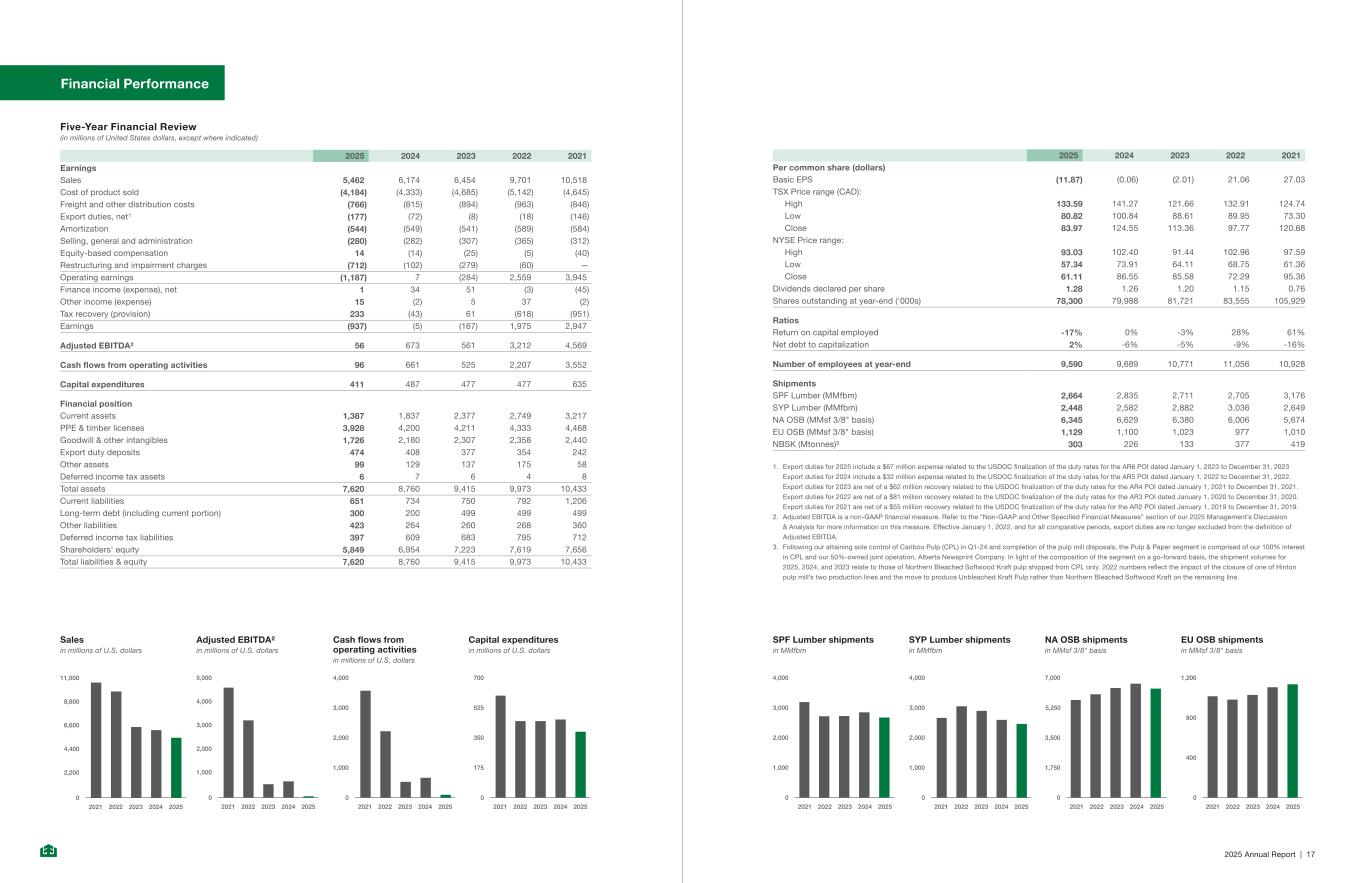 2025 Annual Report | 17 2025 2024 2023 2022 2021 Per common share (dollars) Basic EPS (11.87) (0.06) (2.01) 21.06 27.03 TSX Price range (CAD): High 133.59 141.27 121.66 132.91 124.74 Low 80.82 100.84 88.61 89.95 73.30 Close 83.97 124.55 113.36 97.77 120.68 NYSE Price range: High 93.03 102.40 91.44 102.96 97.59 Low 57.34 73.91 64.11 68.75 61.36 Close 61.11 86.55 85.58 72.29 95.36 Dividends declared per share 1.28 1.26 1.20 1.15 0.76 Shares outstanding at year-end ('000s) 78,300 79,988 81,721 83,555 105,929 Ratios Return on capital employed -17% 0% -3% 28% 61% Net debt to capitalization 2% -6% -5% -9% -16% Number of employees at year-end 9,590 9,689 10,771 11,056 10,928 Shipments SPF Lumber (MMfbm) 2,664 2,835 2,711 2,705 3,176 SYP Lumber (MMfbm) 2,448 2,582 2,882 3,036 2,649 NA OSB (MMsf 3/8" basis) 6,345 6,629 6,380 6,006 5,674 EU OSB (MMsf 3/8" basis) 1,129 1,100 1,023 977 1,010 NBSK (Mtonnes)³ 303 226 133 377 419 1. Export duties for 2025 include a $67 million expense related to the USDOC finalization of the duty rates for the AR6 POI dated January 1, 2023 to December 31, 2023 Export duties for 2024 include a $32 million expense related to the USDOC finalization of the duty rates for the AR5 POI dated January 1, 2022 to December 31, 2022. Export duties for 2023 are net of a $62 million recovery related to the USDOC finalization of the duty rates for the AR4 POI dated January 1, 2021 to December 31, 2021. Export duties for 2022 are net of a $81 million recovery related to the USDOC finalization of the duty rates for the AR3 POI dated January 1, 2020 to December 31, 2020. Export duties for 2021 are net of a $55 million recovery related to the USDOC finalization of the duty rates for the AR2 POI dated January 1, 2019 to December 31, 2019. 2. Adjusted EBITDA is a non-GAAP financial measure. Refer to the “Non-GAAP and Other Specified Financial Measures” section of our 2025 Management’s Discussion & Analysis for more information on this measure. Effective January 1, 2022, and for all comparative periods, export duties are no longer excluded from the definition of Adjusted EBITDA. 3. Following our attaining sole control of Cariboo Pulp (CPL) in Q1-24 and completion of the pulp mill disposals, the Pulp & Paper segment is comprised of our 100% interest in CPL and our 50%-owned joint operation, Alberta Newsprint Company. In light of the composition of the segment on a go-forward basis, the shipment volumes for 2025, 2024, and 2023 relate to those of Northern Bleached Softwood Kraft pulp shipped from CPL only. 2022 numbers reflect the impact of the closure of one of Hinton pulp mill’s two production lines and the move to produce Unbleached Kraft Pulp rather than Northern Bleached Softwood Kraft on the remaining line. SPF Lumber shipments in MMfbm SYP Lumber shipments in MMfbm NA OSB shipments in MMsf 3/8" basis EU OSB shipments in MMsf 3/8" basis 4,000 3,000 5,250 2,000 1,000 0 2021 2022 2023 2024 2025 4,000 3,000 2,000 1,000 0 2021 2022 2023 2024 2025 7,000 3,500 1,750 0 2021 2022 2023 2024 2025 1,200 800 400 0 2021 2022 2023 2024 2025 Financial Performance Five-Year Financial Review (in millions of United States dollars, except where indicated) 2025 2024 2023 2022 2021 Earnings Sales 5,462 6,174 6,454 9,701 10,518 Cost of product sold (4,184) (4,333) (4,685) (5,142) (4,645) Freight and other distribution costs (766) (815) (894) (963) (846) Export duties, net¹ (177) (72) (8) (18) (146) Amortization (544) (549) (541) (589) (584) Selling, general and administration (280) (282) (307) (365) (312) Equity-based compensation 14 (14) (25) (5) (40) Restructuring and impairment charges (712) (102) (279) (60) — Operating earnings (1,187) 7 (284) 2,559 3,945 Finance income (expense), net 1 34 51 (3) (45) Other income (expense) 15 (2) 5 37 (2) Tax recovery (provision) 233 (43) 61 (618) (951) Earnings (937) (5) (167) 1,975 2,947 Adjusted EBITDA² 56 673 561 3,212 4,569 Cash flows from operating activities 96 661 525 2,207 3,552 Capital expenditures 411 487 477 477 635 Financial position Current assets 1,387 1,837 2,377 2,749 3,217 PPE & timber licenses 3,928 4,200 4,211 4,333 4,468 Goodwill & other intangibles 1,726 2,180 2,307 2,358 2,440 Export duty deposits 474 408 377 354 242 Other assets 99 129 137 175 58 Deferred income tax assets 6 7 6 4 8 Total assets 7,620 8,760 9,415 9,973 10,433 Current liabilities 651 734 750 792 1,206 Long-term debt (including current portion) 300 200 499 499 499 Other liabilities 423 264 260 268 360 Deferred income tax liabilities 397 609 683 795 712 Shareholders' equity 5,849 6,954 7,223 7,619 7,656 Total liabilities & equity 7,620 8,760 9,415 9,973 10,433 Adjusted EBITDA² in millions of U.S. dollars Capital expenditures in millions of U.S. dollars Sales in millions of U.S. dollars Cash flows from operating activities in millions of U.S. dollars 5,000 70011,000 4,000 525 8,800 4,000 3,000 350 6,600 3,000 2,000 175 4,400 2,000 1,0002,200 1,000 0 00 0 2021 20212021 20212022 20222022 20222023 20232023 20232024 20242024 20242025 20252025 2025