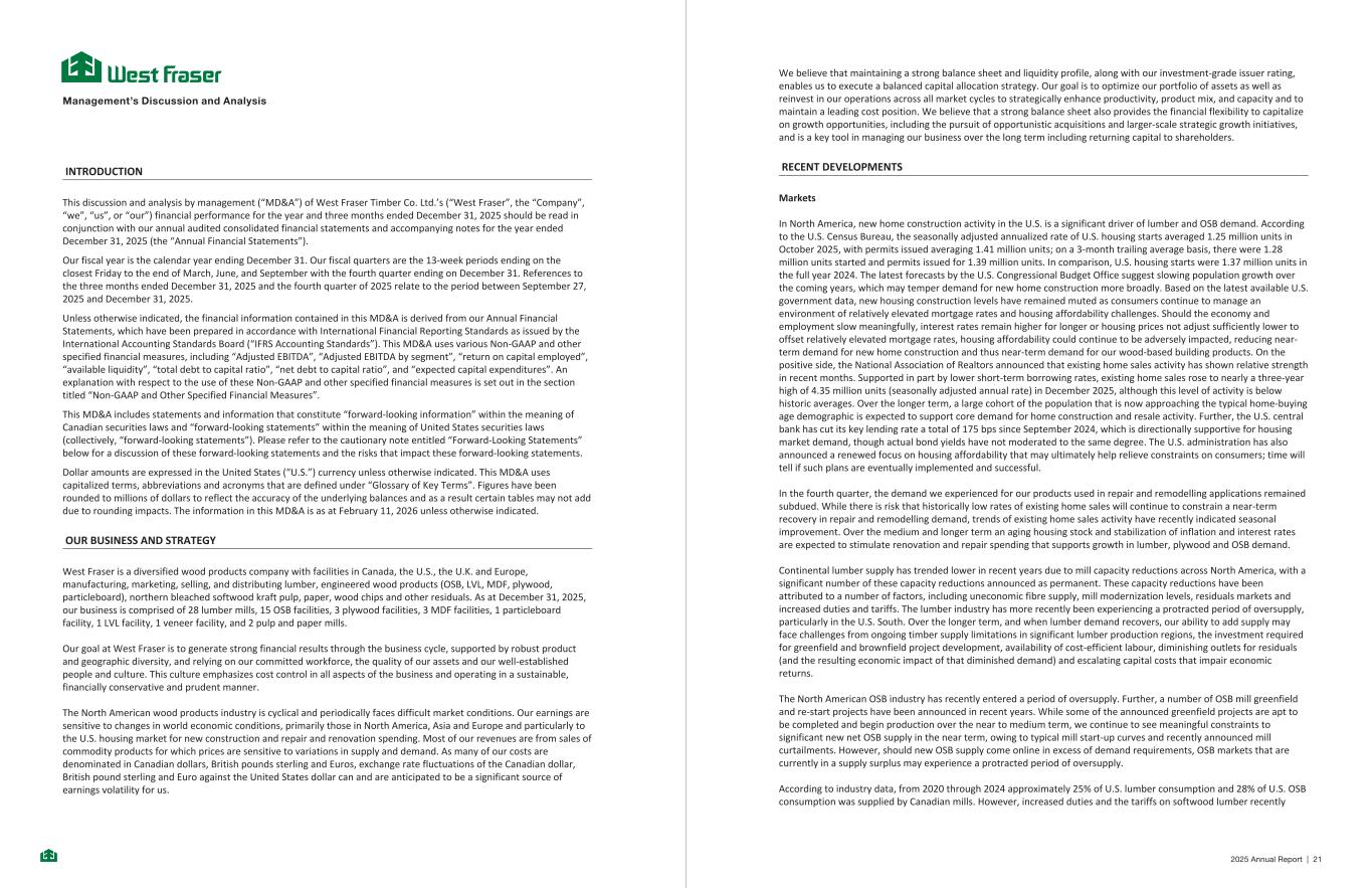 MANAGEMENT’S DISCUSSION & ANALYSIS INTRODUCTION This discussion and analysis by management (“MD&A”) of West Fraser Timber Co. Ltd.’s (“West Fraser”, the “Company”, “we”, “us”, or “our”) financial performance for the year and three months ended December 31, 2025 should be read in conjunction with our annual audited consolidated financial statements and accompanying notes for the year ended December 31, 2025 (the “Annual Financial Statements”). Our fiscal year is the calendar year ending December 31. Our fiscal quarters are the 13-week periods ending on the closest Friday to the end of March, June, and September with the fourth quarter ending on December 31. References to the three months ended December 31, 2025 and the fourth quarter of 2025 relate to the period between September 27, 2025 and December 31, 2025. Unless otherwise indicated, the financial information contained in this MD&A is derived from our Annual Financial Statements, which have been prepared in accordance with International Financial Reporting Standards as issued by the International Accounting Standards Board (“IFRS Accounting Standards”). This MD&A uses various Non-GAAP and other specified financial measures, including “Adjusted EBITDA”, “Adjusted EBITDA by segment”, “return on capital employed”, “available liquidity”, “total debt to capital ratio”, “net debt to capital ratio”, and “expected capital expenditures”. An explanation with respect to the use of these Non-GAAP and other specified financial measures is set out in the section titled “Non-GAAP and Other Specified Financial Measures”. This MD&A includes statements and information that constitute “forward-looking information” within the meaning of Canadian securities laws and “forward-looking statements” within the meaning of United States securities laws (collectively, “forward-looking statements”). Please refer to the cautionary note entitled “Forward-Looking Statements” below for a discussion of these forward-looking statements and the risks that impact these forward-looking statements. Dollar amounts are expressed in the United States (“U.S.”) currency unless otherwise indicated. This MD&A uses capitalized terms, abbreviations and acronyms that are defined under “Glossary of Key Terms”. Figures have been rounded to millions of dollars to reflect the accuracy of the underlying balances and as a result certain tables may not add due to rounding impacts. The information in this MD&A is as at February 11, 2026 unless otherwise indicated. OUR BUSINESS AND STRATEGY West Fraser is a diversified wood products company with facilities in Canada, the U.S., the U.K. and Europe, manufacturing, marketing, selling, and distributing lumber, engineered wood products (OSB, LVL, MDF, plywood, particleboard), northern bleached softwood kraft pulp, paper, wood chips and other residuals. As at December 31, 2025, our business is comprised of 28 lumber mills, 15 OSB facilities, 3 plywood facilities, 3 MDF facilities, 1 particleboard facility, 1 LVL facility, 1 veneer facility, and 2 pulp and paper mills. Our goal at West Fraser is to generate strong financial results through the business cycle, supported by robust product and geographic diversity, and relying on our committed workforce, the quality of our assets and our well-established people and culture. This culture emphasizes cost control in all aspects of the business and operating in a sustainable, financially conservative and prudent manner. The North American wood products industry is cyclical and periodically faces difficult market conditions. Our earnings are sensitive to changes in world economic conditions, primarily those in North America, Asia and Europe and particularly to the U.S. housing market for new construction and repair and renovation spending. Most of our revenues are from sales of commodity products for which prices are sensitive to variations in supply and demand. As many of our costs are denominated in Canadian dollars, British pounds sterling and Euros, exchange rate fluctuations of the Canadian dollar, British pound sterling and Euro against the United States dollar can and are anticipated to be a significant source of earnings volatility for us. - 1 - We believe that maintaining a strong balance sheet and liquidity profile, along with our investment-grade issuer rating, enables us to execute a balanced capital allocation strategy. Our goal is to optimize our portfolio of assets as well as reinvest in our operations across all market cycles to strategically enhance productivity, product mix, and capacity and to maintain a leading cost position. We believe that a strong balance sheet also provides the financial flexibility to capitalize on growth opportunities, including the pursuit of opportunistic acquisitions and larger-scale strategic growth initiatives, and is a key tool in managing our business over the long term including returning capital to shareholders. RECENT DEVELOPMENTS Markets In North America, new home construction activity in the U.S. is a significant driver of lumber and OSB demand. According to the U.S. Census Bureau, the seasonally adjusted annualized rate of U.S. housing starts averaged 1.25 million units in October 2025, with permits issued averaging 1.41 million units; on a 3-month trailing average basis, there were 1.28 million units started and permits issued for 1.39 million units. In comparison, U.S. housing starts were 1.37 million units in the full year 2024. The latest forecasts by the U.S. Congressional Budget Office suggest slowing population growth over the coming years, which may temper demand for new home construction more broadly. Based on the latest available U.S. government data, new housing construction levels have remained muted as consumers continue to manage an environment of relatively elevated mortgage rates and housing affordability challenges. Should the economy and emplo