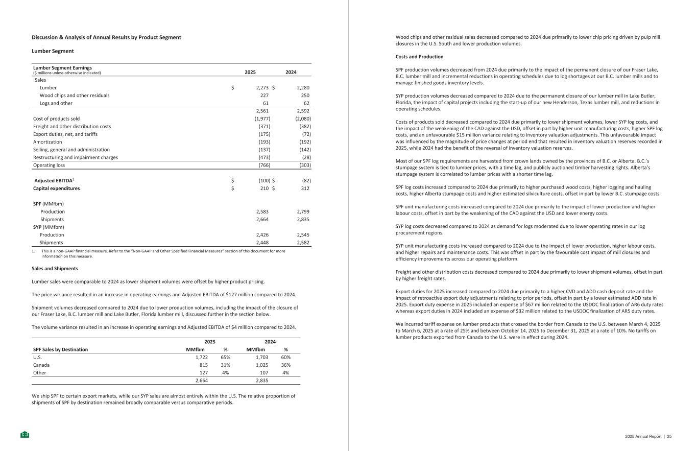 Discussion & Analysis of Annual Results by Product Segment Lumber Segment Lumber Segment Earnings ($ millions unless otherwise indicated) 2025 2024 Sales Lumber $ 2,273 $ 2,280 Wood chips and other residuals 227 250 Logs and other 61 62 2,561 2,592 Cost of products sold (1,977) (2,080) Freight and other distribution costs (371) (382) Export duties, net, and tariffs (175) (72) Amortization (193) (192) Selling, general and administration (137) (142) Restructuring and impairment charges (473) (28) Operating loss (766) (303) Adjusted EBITDA1 $ (100) $ (82) Capital expenditures $ 210 $ 312 SPF (MMfbm) Production 2,583 2,799 Shipments 2,664 2,835 SYP (MMfbm) Production 2,426 2,545 Shipments 2,448 2,582 1. This is a non-GAAP financial measure. Refer to the “Non-GAAP and Other Specified Financial Measures” section of this document for more information on this measure. Sales and Shipments Lumber sales were comparable to 2024 as lower shipment volumes were offset by higher product pricing. The price variance resulted in an increase in operating earnings and Adjusted EBITDA of $127 million compared to 2024. Shipment volumes decreased compared to 2024 due to lower production volumes, including the impact of the closure of our Fraser Lake, B.C. lumber mill and Lake Butler, Florida lumber mill, discussed further in the section below. The volume variance resulted in an increase in operating earnings and Adjusted EBITDA of $4 million compared to 2024. SPF Sales by Destination 2025 2024 MMfbm % MMfbm % U.S. 1,722 65% 1,703 60% Canada 815 31% 1,025 36% Other 127 4% 107 4% 2,664 2,835 We ship SPF to certain export markets, while our SYP sales are almost entirely within the U.S. The relative proportion of shipments of SPF by destination remained broadly comparable versus comparative periods. - 5 - Wood chips and other residual sales decreased compared to 2024 due primarily to lower chip pricing driven by pulp mill closures in the U.S. South and lower production volumes. Costs and Production SPF production volumes decreased from 2024 due primarily to the impact of the permanent closure of our Fraser Lake, B.C. lumber mill and incremental reductions in operating schedules due to log shortages at our B.C. lumber mills and to manage finished goods inventory levels. SYP production volumes decreased compared to 2024 due to the permanent closure of our lumber mill in Lake Butler, Florida, the impact of capital projects including the start-up of our new Henderson, Texas lumber mill, and reductions in operating schedules. Costs of products sold decreased compared to 2024 due primarily to lower shipment volumes, lower SYP log costs, and the impact of the weakening of the CAD against the USD, offset in part by higher unit manufacturing costs, higher SPF log costs, and an unfavourable $15 million variance relating to inventory valuation adjustments. This unfavourable impact was influenced by the magnitude of price changes at period end that resulted in inventory valuation reserves recorded in 2025, while 2024 had the benefit of the reversal of inventory valuation reserves. Most of our SPF log requirements are harvested from crown lands owned by the provinces of B.C. or Alberta. B.C.’s stumpage system is tied to lumber prices, with a time lag, and publicly auctioned timber harvesting rights. Alberta’s stumpage system is correlated to lumber prices with a shorter time lag. SPF log costs increased compared to 2024 due primarily to higher purchased wood costs, higher logging and hauling costs, higher Alberta stumpage costs and higher estimated silviculture costs, offset in part by lower B.C. stumpage costs. SPF unit manufacturing costs increased compared to 2024 due primarily to the impact of lower production and higher labour costs, offset in part by the weakening of the CAD against the USD and lower energy costs. SYP log costs decreased compared to 2024 as demand for logs moderated due to lower operating rates in our log procurement regions. SYP unit manufacturing costs increased compared to 2024 due to the impact of lower production, higher labour costs, and higher repairs and maintenance costs. This was offset in part by the favourable cost impact of mill closures and efficiency improvements across our operating platform. Freight and other distribution costs decreased compared to 2024 due primarily to lower shipment volumes, offset in part by higher freight rates. Export duties for 2025 increased compared to 2024 due primarily to a higher CVD and ADD cash deposit rate and the impact of retroactive export duty adjustments relating to prior periods, offset in part by a lower estimated ADD rate in 2025. Export duty expense in 2025 included an expense of $67 million related to the USDOC finalization of AR6 duty rates whereas export duties in 2024 included an expense of $32 million related to the USDOC finalization of AR5 duty rates. We incurred tariff expense on lumber products that crossed the border from Canada to the U.S. between March 4, 2025 to March 6, 2025 at a rate of 25% and between October 14, 2025 to December 31, 2025 at a rate of 10%. No tariffs on lumber products exported from Canada to the U.S. were in effect during 2024. - 6 - 2025 Annual Report | 25