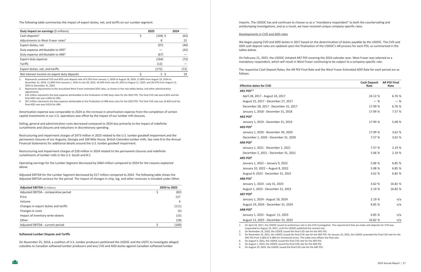 The following table summarizes the impact of export duties, net, and tariffs on our Lumber segment: Duty impact on earnings ($ millions) 2025 2024 Cash deposits1 $ (104) $ (62) Adjustments to West Fraser rates2 8 22 Export duties, net (97) (40) Duty expense attributable to AR53 — (32) Duty expense attributable to AR63 (67) — Export duty expense (164) (72) Tariffs (12) — Export duties, net, and tariffs (175) (72) Net interest income on export duty deposits $ 5 $ 19 1. Represents combined CVD and ADD cash deposit rate of 9.25% from January 1, 2024 to August 18, 2024, 11.89% from August 19, 2024 to December 31, 2024, 11.89% from January 1, 2025 to July 28, 2025, 16.50% from July 29, 2025 to August 11, 2025, and 26.47% from August 12, 2025 to December 31, 2025. 2. Represents adjustments to the annualized West Fraser estimated ADD rates, as shown in the rate tables below, and other administrative adjustments. 3. $32 million represents the duty expense attributable to the finalization of AR5 duty rates for the 2022 POI. The final CVD rate was 6.85% and the final ADD rate was 5.04% for AR5. 4. $67 million represents the duty expense attributable to the finalization of AR6 duty rates for the 2023 POI. The final CVD rate was 16.82% and the final ADD rate was 9.65% for AR6. Amortization expense was comparable to 2024 as the increase in amortization expense from the completion of certain capital investments in our U.S. operations was offset by the impact of our lumber mill closures. Selling, general and administration costs decreased compared to 2024 due primarily to the impact of indefinite curtailments and closures and reductions in discretionary spending. Restructuring and impairment charges of $473 million in 2025 related to the U.S. lumber goodwill impairment and the permanent closures of our Augusta, Georgia and 100 Mile House, British Columbia lumber mills. See note 8 to the Annual Financial Statements for additional details around the U.S. lumber goodwill impairment. Restructuring and impairment charges of $28 million in 2024 related to the permanent closures and indefinite curtailments of lumber mills in the U.S. South and B.C. Operating earnings for the Lumber Segment decreased by $464 million compared to 2024 for the reasons explained above. Adjusted EBITDA for the Lumber Segment decreased by $17 million compared to 2024. The following table shows the Adjusted EBITDA variance for the period. The impact of changes in chip, log, and other revenues is included under Other. Adjusted EBITDA ($ millions) 2024 to 2025 Adjusted EBITDA - comparative period $ (82) Price 127 Volume 4 Changes in export duties and tariffs (111) Changes in costs (5) Impact of inventory write-downs (15) Other (18) Adjusted EBITDA - current period $ (100) Softwood Lumber Dispute and Tariffs On November 25, 2016, a coalition of U.S. lumber producers petitioned the USDOC and the USITC to investigate alleged subsidies to Canadian softwood lumber producers and levy CVD and ADD duties against Canadian softwood lumber - 7 - imports. The USDOC has and continues to choose us as a “mandatory respondent” to both the countervailing and antidumping investigations, and as a result, we have received unique company-specific rates. Developments in CVD and ADD rates We began paying CVD and ADD duties in 2017 based on the determination of duties payable by the USDOC. The CVD and ADD cash deposit rates are updated upon the finalization of the USDOC’s AR process for each POI, as summarized in the tables below. On February 21, 2025, the USDOC initiated AR7 POI covering the 2024 calendar year. West Fraser was selected as a mandatory respondent, which will result in West Fraser continuing to be subject to a company-specific rate. The respective Cash Deposit Rates, the AR POI Final Rate and the West Fraser Estimated ADD Rate for each period are as follows: Effective dates for CVD Cash Deposit Rate AR POI Final Rate AR1 POI1,2 April 28, 2017 - August 24, 2017 24.12 % 6.76 % August 25, 2017 - December 27, 2017 — % — % December 28, 2017 - December 31, 2017 17.99 % 6.76 % January 1, 2018 - December 31, 2018 17.99 % 7.57 % AR2 POI3 January 1, 2019 - December 31, 2019 17.99 % 5.08 % AR3 POI4 January 1, 2020 - November 30, 2020 17.99 % 3.62 % December 1, 2020 - December 31, 2020 7.57 % 3.62 % AR4 POI5 January 1, 2021 - December 1, 2021 7.57 % 2.19 % December 2, 2021 - December 31, 2021 5.06 % 2.19 % AR5 POI6 January 1, 2022 – January 9, 2022 5.06 % 6.85 % January 10, 2022 – August 8, 2022 5.08 % 6.85 % August 9, 2022 - December 31, 2022 3.62 % 6.85 % AR6 POI7 January 1, 2023 - July 31, 2023 3.62 % 16.82 % August 1, 2023 - December 31, 2023 2.19 % 16.82 % AR7 POI8 January 1, 2024 - August 18, 2024 2.19 % n/a August 19, 2024 - December 31, 2024 6.85 % n/a AR8 POI9 January 1, 2025 - August 11, 2025 6.85 % n/a August 12, 2025 - December 31, 2025 16.82 % n/a 1. On April 24, 2017, the USDOC issued its preliminary rate in the CVD investigation. The requirement that we make cash deposits for CVD was suspended on August 24, 2017, until the USDOC published the revised rate. 2. On November 24, 2020, the USDOC issued the final CVD rate for the AR1 POI. 3. On November 24, 2021, the USDOC issued the final CVD rate for the AR2 POI. On January 10, 2022, the USDOC amended the final CVD rate for the AR2 POI from 5.06% to 5.08% for ministerial errors. This table only reflects the final rate. 4. On August 4, 2022, the USDOC issued the final CVD rate for the AR3 POI. 5. On August 1, 2023, the USDOC issued the final CVD rate for the AR4 POI. 6. On August 19, 2024, the USDOC issued the final CVD rate for the AR5 POI. - 8 - 2025 Annual Report | 27