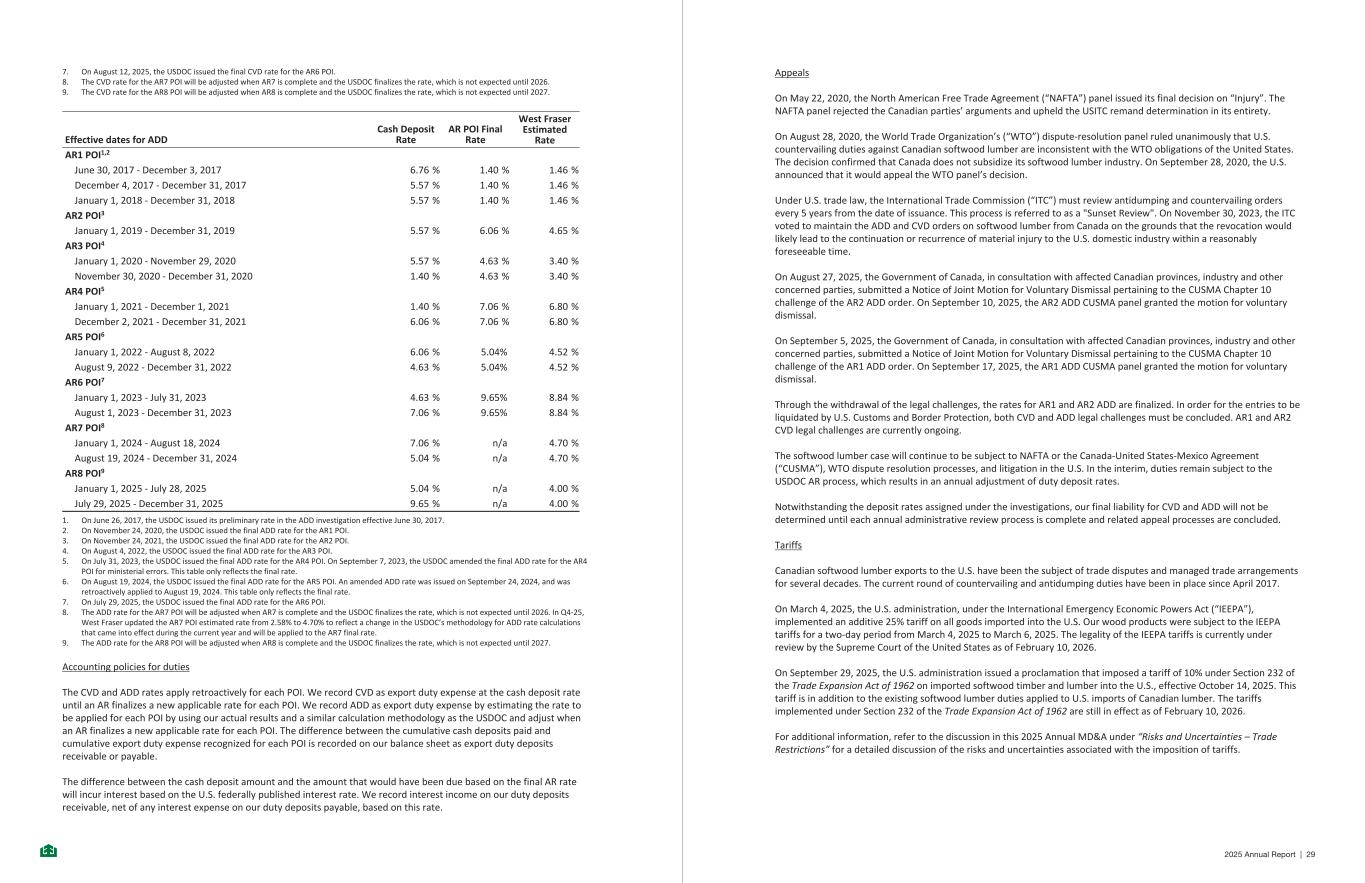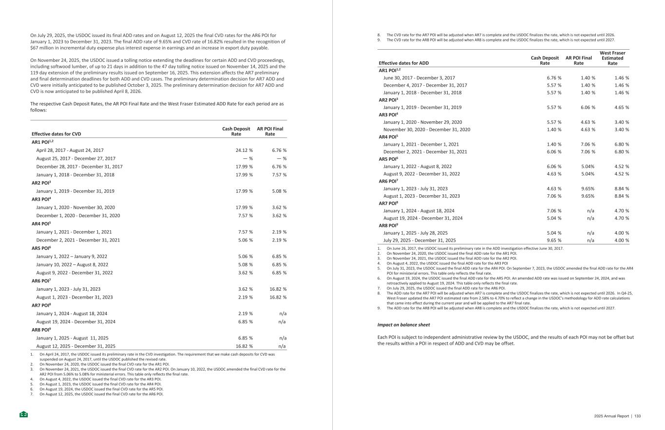 On July 29, 2025, the USDOC issued its final ADD rates and on August 12, 2025 the final CVD rates for the AR6 POI for January 1, 2023 to December 31, 2023. The final ADD rate of 9.65% and CVD rate of 16.82% resulted in the recognition of $67 million in incremental duty expense plus interest expense in earnings and an increase in export duty payable. On November 24, 2025, the USDOC issued a tolling notice extending the deadlines for certain ADD and CVD proceedings, including softwood lumber, of up to 21 days in addition to the 47 day tolling notice issued on November 14, 2025 and the 119 day extension of the preliminary results issued on September 16, 2025. This extension affects the AR7 preliminary and final determination deadlines for both ADD and CVD cases. The preliminary determination decision for AR7 ADD and CVD were initially anticipated to be published October 3, 2025. The preliminary determination decision for AR7 ADD and CVD is now anticipated to be published April 8, 2026. The respective Cash Deposit Rates, the AR POI Final Rate and the West Fraser Estimated ADD Rate for each period are as follows: Effective dates for CVD Cash Deposit Rate AR POI Final Rate AR1 POI1,2 April 28, 2017 - August 24, 2017 24.12 % 6.76 % August 25, 2017 - December 27, 2017 — % — % December 28, 2017 - December 31, 2017 17.99 % 6.76 % January 1, 2018 - December 31, 2018 17.99 % 7.57 % AR2 POI3 January 1, 2019 - December 31, 2019 17.99 % 5.08 % AR3 POI4 January 1, 2020 - November 30, 2020 17.99 % 3.62 % December 1, 2020 - December 31, 2020 7.57 % 3.62 % AR4 POI5 January 1, 2021 - December 1, 2021 7.57 % 2.19 % December 2, 2021 - December 31, 2021 5.06 % 2.19 % AR5 POI6 January 1, 2022 – January 9, 2022 5.06 % 6.85 % January 10, 2022 – August 8, 2022 5.08 % 6.85 % August 9, 2022 - December 31, 2022 3.62 % 6.85 % AR6 POI7 January 1, 2023 - July 31, 2023 3.62 % 16.82 % August 1, 2023 - December 31, 2023 2.19 % 16.82 % AR7 POI8 January 1, 2024 - August 18, 2024 2.19 % n/a August 19, 2024 - December 31, 2024 6.85 % n/a AR8 POI9 January 1, 2025 - August 11, 2025 6.85 % n/a August 12, 2025 - December 31, 2025 16.82 % n/a 1. On April 24, 2017, the USDOC issued its preliminary rate in the CVD investigation. The requirement that we make cash deposits for CVD was suspended on August 24, 2017, until the USDOC published the revised rate. 2. On November 24, 2020, the USDOC issued the final CVD rate for the AR1 POI. 3. On November 24, 2021, the USDOC issued the final CVD rate for the AR2 POI. On January 10, 2022, the USDOC amended the final CVD rate for the AR2 POI from 5.06% to 5.08% for ministerial errors. This table only reflects the final rate. 4. On August 4, 2022, the USDOC issued the final CVD rate for the AR3 POI. 5. On August 1, 2023, the USDOC issued the final CVD rate for the AR4 POI. 6. On August 19, 2024, the USDOC issued the final CVD rate for the AR5 POI. 7. On August 12, 2025, the USDOC issued the final CVD rate for the AR6 POI. -42- 8. The CVD rate for the AR7 POI will be adjusted when AR7 is complete and the USDOC finalizes the rate, which is not expected until 2026. 9. The CVD rate for the AR8 POI will be adjusted when AR8 is complete and the USDOC finalizes the rate, which is not expected until 2027. Effective dates for ADD Cash Deposit Rate AR POI Final Rate West Fraser Estimated Rate AR1 POI1,2 June 30, 2017 - December 3, 2017 6.76 % 1.40 % 1.46 % December 4, 2017 - December 31, 2017 5.57 % 1.40 % 1.46 % January 1, 2018 - December 31, 2018 5.57 % 1.40 % 1.46 % AR2 POI3 January 1, 2019 - December 31, 2019 5.57 % 6.06 % 4.65 % AR3 POI4 January 1, 2020 - November 29, 2020 5.57 % 4.63 % 3.40 % November 30, 2020 - December 31, 2020 1.40 % 4.63 % 3.40 % AR4 POI5 January 1, 2021 - December 1, 2021 1.40 % 7.06 % 6.80 % December 2, 2021 - December 31, 2021 6.06 % 7.06 % 6.80 % AR5 POI6 January 1, 2022 - August 8, 2022 6.06 % 5.04% 4.52 % August 9, 2022 - December 31, 2022 4.63 % 5.04% 4.52 % AR6 POI7 January 1, 2023 - July 31, 2023 4.63 % 9.65% 8.84 % August 1, 2023 - December 31, 2023 7.06 % 9.65% 8.84 % AR7 POI8 January 1, 2024 - August 18, 2024 7.06 % n/a 4.70 % August 19, 2024 - December 31, 2024 5.04 % n/a 4.70 % AR8 POI9 January 1, 2025 - July 28, 2025 5.04 % n/a 4.00 % July 29, 2025 - December 31, 2025 9.65 % n/a 4.00 % 1. On June 26, 2017, the USDOC issued its preliminary rate in the ADD investigation effective June 30, 2017. 2. On November 24, 2020, the USDOC issued the final ADD rate for the AR1 POI. 3. On November 24, 2021, the USDOC issued the final ADD rate for the AR2 POI. 4. On August 4, 2022, the USDOC issued the final ADD rate for the AR3 POI 5. On July 31, 2023, the USDOC issued the final ADD rate for the AR4 POI. On September 7, 2023, the USDOC amended the final ADD rate for the AR4 POI for ministerial errors. This table only reflects the final rate. 6. On August 19, 2024, the USDOC issued the final ADD rate for the AR5 POI. An amended ADD rate was issued on September 24, 2024, and was retroactively applied to August 19, 2024. This table only reflects the final rate. 7. On July 29, 2025, the USDOC issued the final ADD rate for the AR6 POI. 8. The ADD rate for the AR7 POI will be adjusted when AR7 is complete and the USDOC finalizes the rate, which is not expected until 2026. In Q4-25, West Fraser updated the AR7 POI estimated rate from 2.58% to 4.70% to reflect a change in the USDOC’s methodology for ADD rate calculations that came into effect during the current year and will be applied to the AR7 final rate. 9. The ADD rate for the AR8 POI will be adjusted when AR8 is complete and the USDOC finalizes the rate, which is not expected until 2027. Impact on balance sheet Each POI is subject to independent administrative review by the USDOC, and the results of each POI may not be offset but the results within a POI in respect of ADD and CVD may be offset. -43- 2025 Annual Report | 133