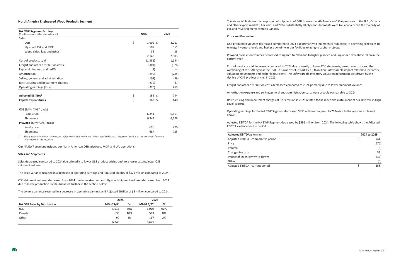 North America Engineered Wood Products Segment NA EWP Segment Earnings ($ millions unless otherwise indicated) 2025 2024 Sales OSB $ 1,602 $ 2,217 Plywood, LVL and MDF 502 551 Wood chips, logs and other 36 35 2,140 2,803 Cost of products sold (1,581) (1,634) Freight and other distribution costs (304) (326) Export duties, net, and tariffs (1) — Amortization (290) (284) Selling, general and administration (101) (99) Restructuring and impairment charges (239) (1) Operating earnings (loss) (376) 459 Adjusted EBITDA1 $ 153 $ 744 Capital expenditures $ 163 $ 140 OSB (MMsf 3/8” basis) Production 6,351 6,661 Shipments 6,345 6,629 Plywood (MMsf 3/8” basis) Production 696 726 Shipments 687 735 1. This is a non-GAAP financial measure. Refer to the “Non-GAAP and Other Specified Financial Measures” section of this document for more information on this measure. Our NA EWP segment includes our North American OSB, plywood, MDF, and LVL operations. Sales and Shipments Sales decreased compared to 2024 due primarily to lower OSB product pricing and, to a lesser extent, lower OSB shipment volumes. The price variance resulted in a decrease in operating earnings and Adjusted EBITDA of $575 million compared to 2024. OSB shipment volumes decreased from 2024 due to weaker demand. Plywood shipment volumes decreased from 2024 due to lower production levels, discussed further in the section below. The volume variance resulted in a decrease in operating earnings and Adjusted EBITDA of $8 million compared to 2024. NA OSB Sales by Destination 2025 2024 MMsf 3/8” % MMsf 3/8” % U.S. 5,618 89% 5,969 90% Canada 635 10% 543 8% Other 92 1% 117 2% 6,345 6,629 - 11 - The above table shows the proportion of shipments of OSB from our North American OSB operations to the U.S., Canada and other export markets. For 2025 and 2024, substantially all plywood shipments were to Canada, while the majority of LVL and MDF shipments were to Canada. Costs and Production OSB production volumes decreased compared to 2024 due primarily to incremental reductions in operating schedules to manage inventory levels and higher downtime at our facilities relating to capital projects. Plywood production volumes decreased compared to 2024 due to higher planned and unplanned downtime taken in the current year. Cost of products sold decreased compared to 2024 due primarily to lower OSB shipments, lower resin costs and the weakening of the CAD against the USD. This was offset in part by a $36 million unfavourable impact related to inventory valuation adjustments and higher labour costs. The unfavourable inventory valuation adjustment was driven by the decline of OSB product pricing in 2025. Freight and other distribution costs decreased compared to 2024 primarily due to lower shipment volumes. Amortization expense and selling, general and administration costs were broadly comparable to 2024. Restructuring and impairment charges of $239 million in 2025 related to the indefinite curtailment of our OSB mill in High Level, Alberta. Operating earnings for the NA EWP Segment decreased $835 million compared to 2024 due to the reasons explained above. Adjusted EBITDA for the NA EWP Segment decreased by $591 million from 2024. The following table shows the Adjusted EBITDA variance for the period. Adjusted EBITDA ($ millions) 2024 to 2025 Adjusted EBITDA - comparative period $ 744 Price (575) Volume (8) Changes in costs 33 Impact of inventory write-downs (36) Other (5) Adjusted EBITDA - current period $ 153 - 12 - 2025 Annual Report | 31