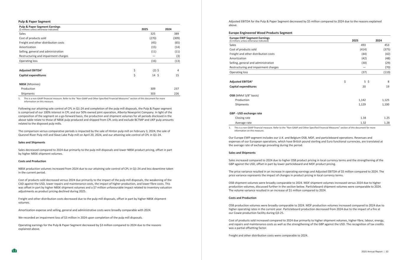 Pulp & Paper Segment Pulp & Paper Segment Earnings ($ millions unless otherwise indicated) 2025 2024 Sales 325 389 Cost of products sold (270) (309) Freight and other distribution costs (45) (65) Amortization (15) (14) Selling, general and administration (11) (11) Restructuring and impairment charges — (3) Operating loss (16) (13) Adjusted EBITDA1 $ (2) $ 4 Capital expenditures $ 14 $ 15 NBSK (Mtonnes) Production 309 237 Shipments 303 226 1. This is a non-GAAP financial measure. Refer to the “Non-GAAP and Other Specified Financial Measures” section of this document for more information on this measure. Following our attaining sole control of CPL in Q1-24 and completion of the pulp mill disposals, the Pulp & Paper segment is comprised of our 100% interest in CPL and our 50%-owned joint operation, Alberta Newsprint Company. In light of the composition of the segment on a go-forward basis, the production and shipment volumes for all periods disclosed in the above table relate to those of NBSK pulp produced and shipped from CPL only and exclude BCTMP and UKP pulp amounts related to the disposed pulp mills. The comparison versus comparative periods is impacted by the sale of Hinton pulp mill on February 3, 2024, the sale of Quesnel River Pulp mill and Slave Lake Pulp mill on April 20, 2024, and our attaining sole control of CPL in Q1-24. Sales and Shipments Sales decreased compared to 2024 due primarily to the pulp mill disposals and lower NBSK product pricing, offset in part by higher NBSK shipment volumes. Costs and Production NBSK production volumes increased from 2024 due to our attaining sole control of CPL in Q1-24 and less downtime taken in the current period. Cost of products sold decreased versus 2024 due primarily to the impact of the pulp mill disposals, the weakening of the CAD against the USD, lower repairs and maintenance costs, the impact of higher production, and lower fibre costs. This was offset in part by higher NBSK shipment volumes and a $7 million unfavourable impact related to inventory valuation adjustments as product pricing declined during 2025. Freight and other distribution costs decreased due to the pulp mill disposals, offset in part by higher NBSK shipment volumes. Amortization expense and selling, general and administrative costs were broadly comparable with 2024. We recorded an impairment loss of $3 million in 2024 upon completion of the pulp mill disposals. Operating earnings for the Pulp & Paper Segment decreased by $3 million compared to 2024 due to the reasons explained above. - 13 - Adjusted EBITDA for the Pulp & Paper Segment decreased by $5 million compared to 2024 due to the reasons explained above. Europe Engineered Wood Products Segment Europe EWP Segment Earnings ($ millions unless otherwise indicated) 2025 2024 Sales 493 453 Cost of products sold (414) (375) Freight and other distribution costs (44) (42) Amortization (42) (48) Selling, general and administration (30) (29) Restructuring and impairment charges — (70) Operating loss (37) (110) Adjusted EBITDA1 $ 5 $ 8 Capital expenditures 20 19 OSB (MMsf 3/8” basis) Production 1,142 1,125 Shipments 1,129 1,100 GBP - USD exchange rate Closing rate 1.34 1.25 Average rate 1.32 1.28 1. This is a non-GAAP financial measure. Refer to the “Non-GAAP and Other Specified Financial Measures” section of this document for more information on this measure. Our Europe EWP segment includes our U.K. and Belgium OSB, MDF, and particleboard operations. Revenues and expenses of our European operations, which have British pound sterling and Euro functional currencies, are translated at the average rate of exchange prevailing during the period. Sales and Shipments Sales increased compared to 2024 due to higher OSB product pricing in local currency terms and the strengthening of the GBP against the USD, offset in part by lower particleboard and MDF product pricing. The price variance resulted in an increase in operating earnings and Adjusted EBITDA of $5 million compared to 2024. The price variance represents the impact of changes in product pricing in local currency terms. OSB shipment volumes were broadly comparable to 2024. MDF shipment volumes increased versus 2024 due to higher production volumes, discussed further in the section below. Particleboard shipment volumes were comparable to 2024. The volume variance resulted in an increase of $1 million compared to 2024. Costs and Production OSB production volumes were broadly comparable to 2024. MDF production volumes increased compared to 2024 due to higher operating rates in the current year. Particleboard production decreased from 2024 due to the impact of a fire at our Cowie production facility during Q3-25. Cost of products sold increased compared to 2024 due primarily to higher shipment volumes, higher fibre, labour, energy, and repairs and maintenance costs as well as the strengthening of the GBP against the USD. The recognition of tax credits was a partial offsetting factor. Freight and other distribution costs were comparable to 2024. - 14 - 2025 Annual Report | 33