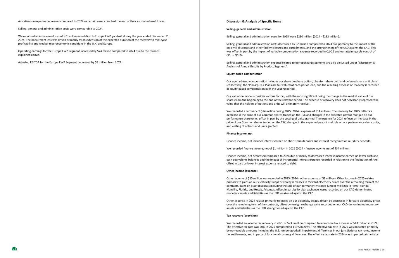 Amortization expense decreased compared to 2024 as certain assets reached the end of their estimated useful lives. Selling, general and administration costs were comparable to 2024. We recorded an impairment loss of $70 million in relation to Europe EWP goodwill during the year ended December 31, 2024. The impairment loss was driven primarily by an extension of the expected duration of the recovery to mid-cycle profitability and weaker macroeconomic conditions in the U.K. and Europe. Operating earnings for the Europe EWP Segment increased by $74 million compared to 2024 due to the reasons explained above. Adjusted EBITDA for the Europe EWP Segment decreased by $3 million from 2024. - 15 - Discussion & Analysis of Specific Items Selling, general and administration Selling, general and administration costs for 2025 were $280 million (2024 - $282 million). Selling, general and administration costs decreased by $2 million compared to 2024 due primarily to the impact of the pulp mill disposals and other facility closures and curtailments, and the strengthening of the USD against the CAD. This was offset in part by the impact of variable compensation expense recorded in Q1-25 and our attaining sole control of CPL in Q1-24. Selling, general and administration expense related to our operating segments are also discussed under “Discussion & Analysis of Annual Results by Product Segment”. Equity-based compensation Our equity-based compensation includes our share purchase option, phantom share unit, and deferred share unit plans (collectively, the “Plans”). Our Plans are fair valued at each period-end, and the resulting expense or recovery is recorded in equity-based compensation over the vesting period. Our valuation models consider various factors, with the most significant being the change in the market value of our shares from the beginning to the end of the relevant period. The expense or recovery does not necessarily represent the value that the holders of options and units will ultimately receive. We recorded a recovery of $14 million during 2025 (2024 - expense of $14 million). The recovery for 2025 reflects a decrease in the price of our Common shares traded on the TSX and changes in the expected payout multiple on our performance share units, offset in part by the vesting of units granted. The expense for 2024 reflects an increase in the price of our Common shares traded on the TSX, changes in the expected payout multiple on our performance share units, and vesting of options and units granted. Finance income, net Finance income, net includes interest earned on short-term deposits and interest recognized on our duty deposits. We recorded finance income, net of $1 million in 2025 (2024 - finance income, net of $34 million). Finance income, net decreased compared to 2024 due primarily to decreased interest income earned on lower cash and cash equivalents balances and the impact of incremental interest expense recorded in relation to the finalization of AR6, offset in part by lower interest expense related to debt. Other income (expense) Other income of $15 million was recorded in 2025 (2024 - other expense of $2 million). Other income in 2025 relates primarily to gains on our electricity swaps driven by increases in forward electricity prices over the remaining term of the contracts, gains on asset disposals including the sale of our permanently closed lumber mill sites in Perry, Florida, Maxville, Florida, and Huttig, Arkansas, offset in part by foreign exchange losses recorded on our CAD-denominated monetary assets and liabilities as the USD weakened against the CAD. Other expense in 2024 relates primarily to losses on our electricity swaps, driven by decreases in forward electricity prices over the remaining term of the contracts, offset by foreign exchange gains recorded on our CAD-denominated monetary assets and liabilities as the USD strengthened against the CAD. Tax recovery (provision) We recorded an income tax recovery in 2025 of $233 million compared to an income tax expense of $43 million in 2024. The effective tax rate was 20% in 2025 compared to 113% in 2024. The effective tax rate in 2025 was impacted primarily by non-taxable amounts including the U.S. lumber goodwill impairment, differences in our jurisdictional tax rates, income tax settlements, and impacts of functional currency differences. The effective tax rate in 2024 was impacted primarily by - 16 - 2025 Annual Report | 35
