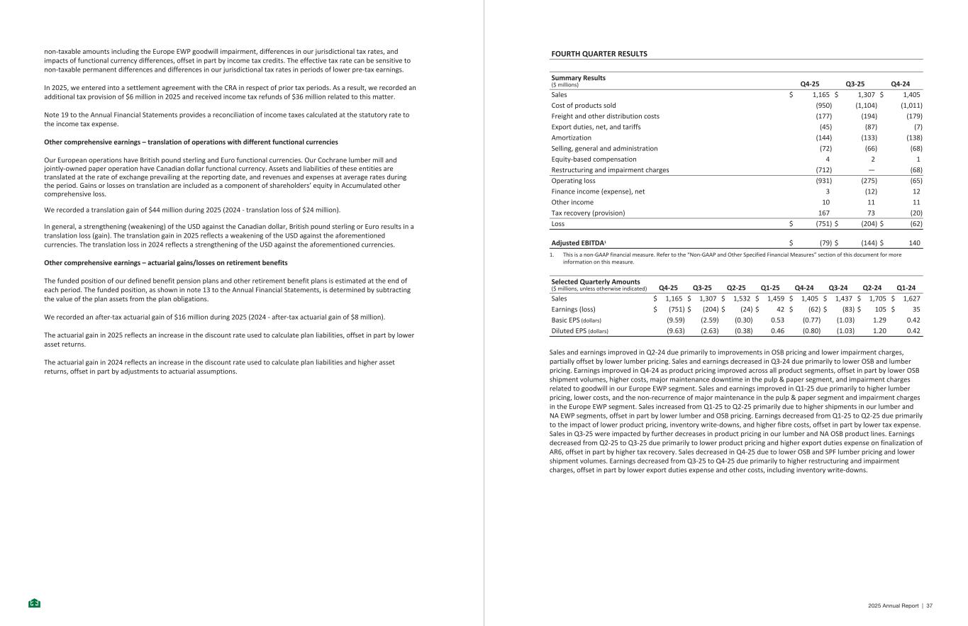 non-taxable amounts including the Europe EWP goodwill impairment, differences in our jurisdictional tax rates, and impacts of functional currency differences, offset in part by income tax credits. The effective tax rate can be sensitive to non-taxable permanent differences and differences in our jurisdictional tax rates in periods of lower pre-tax earnings. In 2025, we entered into a settlement agreement with the CRA in respect of prior tax periods. As a result, we recorded an additional tax provision of $6 million in 2025 and received income tax refunds of $36 million related to this matter. Note 19 to the Annual Financial Statements provides a reconciliation of income taxes calculated at the statutory rate to the income tax expense. Other comprehensive earnings – translation of operations with different functional currencies Our European operations have British pound sterling and Euro functional currencies. Our Cochrane lumber mill and jointly-owned paper operation have Canadian dollar functional currency. Assets and liabilities of these entities are translated at the rate of exchange prevailing at the reporting date, and revenues and expenses at average rates during the period. Gains or losses on translation are included as a component of shareholders’ equity in Accumulated other comprehensive loss. We recorded a translation gain of $44 million during 2025 (2024 - translation loss of $24 million). In general, a strengthening (weakening) of the USD against the Canadian dollar, British pound sterling or Euro results in a translation loss (gain). The translation gain in 2025 reflects a weakening of the USD against the aforementioned currencies. The translation loss in 2024 reflects a strengthening of the USD against the aforementioned currencies. Other comprehensive earnings – actuarial gains/losses on retirement benefits The funded position of our defined benefit pension plans and other retirement benefit plans is estimated at the end of each period. The funded position, as shown in note 13 to the Annual Financial Statements, is determined by subtracting the value of the plan assets from the plan obligations. We recorded an after-tax actuarial gain of $16 million during 2025 (2024 - after-tax actuarial gain of $8 million). The actuarial gain in 2025 reflects an increase in the discount rate used to calculate plan liabilities, offset in part by lower asset returns. The actuarial gain in 2024 reflects an increase in the discount rate used to calculate plan liabilities and higher asset returns, offset in part by adjustments to actuarial assumptions. - 17 - FOURTH QUARTER RESULTS Summary Results ($ millions) Q4-25 Q3-25 Q4-24 Sales $ 1,165 $ 1,307 $ 1,405 Cost of products sold (950) (1,104) (1,011) Freight and other distribution costs (177) (194) (179) Export duties, net, and tariffs (45) (87) (7) Amortization (144) (133) (138) Selling, general and administration (72) (66) (68) Equity-based compensation 4 2 1 Restructuring and impairment charges (712) — (68) Operating loss (931) (275) (65) Finance income (expense), net 3 (12) 12 Other income 10 11 11 Tax recovery (provision) 167 73 (20) Loss $ (751) $ (204) $ (62) Adjusted EBITDA1 $ (79) $ (144) $ 140 1. This is a non-GAAP financial measure. Refer to the “Non-GAAP and Other Specified Financial Measures” section of this document for more information on this measure. Selected Quarterly Amounts ($ millions, unless otherwise indicated) Q4-25 Q3-25 Q2-25 Q1-25 Q4-24 Q3-24 Q2-24 Q1-24 Sales $ 1,165 $ 1,307 $ 1,532 $ 1,459 $ 1,405 $ 1,437 $ 1,705 $ 1,627 Earnings (loss) $ (751) $ (204) $ (24) $ 42 $ (62) $ (83) $ 105 $ 35 Basic EPS (dollars) (9.59) (2.59) (0.30) 0.53 (0.77) (1.03) 1.29 0.42 Diluted EPS (dollars) (9.63) (2.63) (0.38) 0.46 (0.80) (1.03) 1.20 0.42 Sales and earnings improved in Q2-24 due primarily to improvements in OSB pricing and lower impairment charges, partially offset by lower lumber pricing. Sales and earnings decreased in Q3-24 due primarily to lower OSB and lumber pricing. Earnings improved in Q4-24 as product pricing improved across all product segments, offset in part by lower OSB shipment volumes, higher costs, major maintenance downtime in the pulp & paper segment, and impairment charges related to goodwill in our Europe EWP segment. Sales and earnings improved in Q1-25 due primarily to higher lumber pricing, lower costs, and the non-recurrence of major maintenance in the pulp & paper segment and impairment charges in the Europe EWP segment. Sales increased from Q1-25 to Q2-25 primarily due to higher shipments in our lumber and NA EWP segments, offset in part by lower lumber and OSB pricing. Earnings decreased from Q1-25 to Q2-25 due primarily to the impact of lower product pricing, inventory write-downs, and higher fibre costs, offset in part by lower tax expense. Sales in Q3-25 were impacted by further decreases in product pricing in our lumber and NA OSB product lines. Earnings decreased from Q2-25 to Q3-25 due primarily to lower product pricing and higher export duties expense on finalization of AR6, offset in part by higher tax recovery. Sales decreased in Q4-25 due to lower OSB and SPF lumber pricing and lower shipment volumes. Earnings decreased from Q3-25 to Q4-25 due primarily to higher restructuring and impairment charges, offset in part by lower export duties expense and other costs, including inventory write-downs. - 18 - 2025 Annual Report | 37