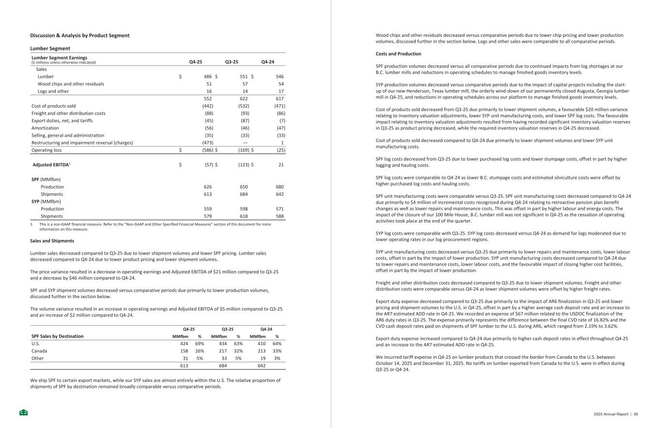 Discussion & Analysis by Product Segment Lumber Segment Lumber Segment Earnings ($ millions unless otherwise indicated) Q4-25 Q3-25 Q4-24 Sales Lumber $ 486 $ 551 $ 546 Wood chips and other residuals 51 57 54 Logs and other 16 14 17 552 622 617 Cost of products sold (442) (532) (471) Freight and other distribution costs (88) (93) (86) Export duties, net, and tariffs (45) (87) (7) Amortization (56) (46) (47) Selling, general and administration (35) (33) (33) Restructuring and impairment reversal (charges) (473) — 1 Operating loss $ (586) $ (169) $ (25) Adjusted EBITDA1 $ (57) $ (123) $ 21 SPF (MMfbm) Production 626 650 680 Shipments 613 684 642 SYP (MMfbm) Production 559 598 571 Shipments 579 618 588 1. This is a non-GAAP financial measure. Refer to the “Non-GAAP and Other Specified Financial Measures” section of this document for more information on this measure. Sales and Shipments Lumber sales decreased compared to Q3-25 due to lower shipment volumes and lower SPF pricing. Lumber sales decreased compared to Q4-24 due to lower product pricing and lower shipment volumes. The price variance resulted in a decrease in operating earnings and Adjusted EBITDA of $21 million compared to Q3-25 and a decrease by $46 million compared to Q4-24. SPF and SYP shipment volumes decreased versus comparative periods due primarily to lower production volumes, discussed further in the section below. The volume variance resulted in an increase in operating earnings and Adjusted EBITDA of $5 million compared to Q3-25 and an increase of $2 million compared to Q4-24. SPF Sales by Destination Q4-25 Q3-25 Q4-24 MMfbm % MMfbm % MMfbm % U.S. 424 69% 434 63% 410 64% Canada 158 26% 217 32% 213 33% Other 31 5% 33 5% 19 3% 613 684 642 We ship SPF to certain export markets, while our SYP sales are almost entirely within the U.S. The relative proportion of shipments of SPF by destination remained broadly comparable versus comparative periods. - 19 - Wood chips and other residuals decreased versus comparative periods due to lower chip pricing and lower production volumes, discussed further in the section below. Logs and other sales were comparable to all comparative periods. Costs and Production SPF production volumes decreased versus all comparative periods due to continued impacts from log shortages at our B.C. lumber mills and reductions in operating schedules to manage finished goods inventory levels. SYP production volumes decreased versus comparative periods due to the impact of capital projects including the start- up of our new Henderson, Texas lumber mill, the orderly wind-down of our permanently closed Augusta, Georgia lumber mill in Q4-25, and reductions in operating schedules across our platform to manage finished goods inventory levels. Cost of products sold decreased from Q3-25 due primarily to lower shipment volumes, a favourable $20 million variance relating to inventory valuation adjustments, lower SYP unit manufacturing costs, and lower SPF log costs. The favourable impact relating to inventory valuation adjustments resulted from having recorded significant inventory valuation reserves in Q3-25 as product pricing decreased, while the required inventory valuation reserves in Q4-25 decreased. Cost of products sold decreased compared to Q4-24 due primarily to lower shipment volumes and lower SYP unit manufacturing costs. SPF log costs decreased from Q3-25 due to lower purchased log costs and lower stumpage costs, offset in part by higher logging and hauling costs. SPF log costs were comparable to Q4-24 as lower B.C. stumpage costs and estimated silviculture costs were offset by higher purchased log costs and hauling costs. SPF unit manufacturing costs were comparable versus Q3-25. SPF unit manufacturing costs decreased compared to Q4-24 due primarily to $4 million of incremental costs recognized during Q4-24 relating to retroactive pension plan benefit changes as well as lower repairs and maintenance costs. This was offset in part by higher labour and energy costs. The impact of the closure of our 100 Mile House, B.C. lumber mill was not significant in Q4-25 as the cessation of operating activities took place at the end of the quarter. SYP log costs were comparable with Q3-25. SYP log costs decreased versus Q4-24 as demand for logs moderated due to lower operating rates in our log procurement regions. SYP unit manufacturing costs decreased versus Q3-25 due primarily to lower repairs and maintenance costs, lower labour costs, offset in part by the impact of lower production. SYP unit manufacturing costs decreased compared to Q4-24 due to lower repairs and maintenance costs, lower labour costs, and the favourable impact of closing higher cost facilities, offset in part by the impact of lower production. Freight and other distribution costs decreased compared to Q3-25 due to lower shipment volumes. Freight and other distribution costs were comparable versus Q4-24 as lower shipment volumes were offset by higher freight rates. Export duty expense decreased compared to Q3-25 due primarily to the impact of AR6 finalization in Q3-25 and lower pricing and shipment volumes to the U.S. in Q4-25, offset in part by a higher average cash deposit rate and an increase to the AR7 estimated ADD rate in Q4-25. We recorded an expense of $67 million related to the USDOC finalization of the AR6 duty rates in Q3-25. The expense primarily represents the difference between the final CVD rate of 16.82% and the CVD cash deposit rates paid on shipments of SPF lumber to the U.S. during AR6, which ranged from 2.19% to 3.62%. Export duty expense increased compared to Q4-24 due primarily to higher cash deposit rates in effect throughout Q4-25 and an increase to the AR7 estimated ADD rate in Q4-25. We incurred tariff expense in Q4-25 on lumber products that crossed the border from Canada to the U.S. between October 14, 2025 and December 31, 2025. No tariffs on lumber exported from Canada to the U.S. were in effect during Q3-25 or Q4-