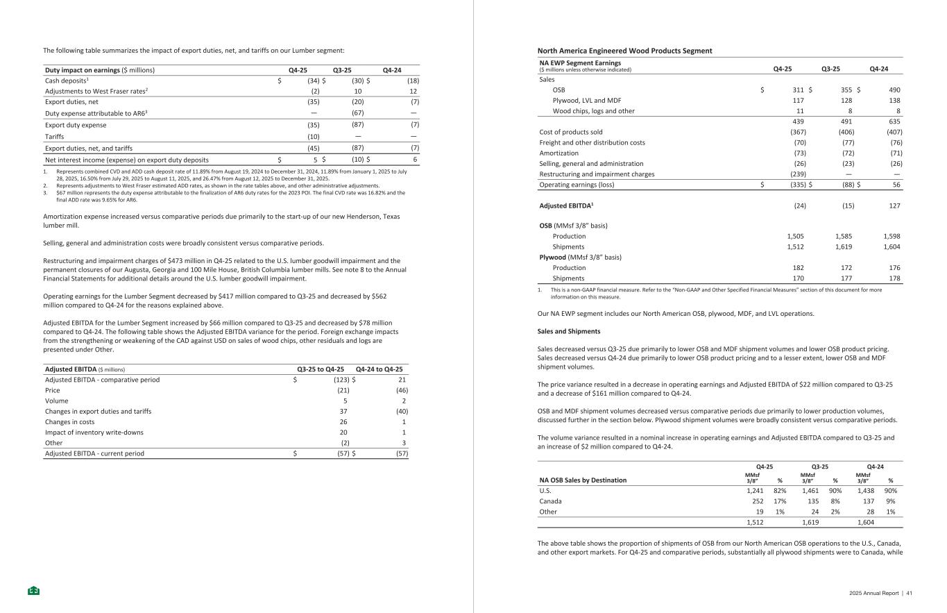 The following table summarizes the impact of export duties, net, and tariffs on our Lumber segment: Duty impact on earnings ($ millions) Q4-25 Q3-25 Q4-24 Cash deposits1 $ (34) $ (30) $ (18) Adjustments to West Fraser rates2 (2) 10 12 Export duties, net (35) (20) (7) Duty expense attributable to AR63 — (67) — Export duty expense (35) (87) (7) Tariffs (10) — — Export duties, net, and tariffs (45) (87) (7) Net interest income (expense) on export duty deposits $ 5 $ (10) $ 6 1. Represents combined CVD and ADD cash deposit rate of 11.89% from August 19, 2024 to December 31, 2024, 11.89% from January 1, 2025 to July 28, 2025, 16.50% from July 29, 2025 to August 11, 2025, and 26.47% from August 12, 2025 to December 31, 2025. 2. Represents adjustments to West Fraser estimated ADD rates, as shown in the rate tables above, and other administrative adjustments. 3. $67 million represents the duty expense attributable to the finalization of AR6 duty rates for the 2023 POI. The final CVD rate was 16.82% and the final ADD rate was 9.65% for AR6. Amortization expense increased versus comparative periods due primarily to the start-up of our new Henderson, Texas lumber mill. Selling, general and administration costs were broadly consistent versus comparative periods. Restructuring and impairment charges of $473 million in Q4-25 related to the U.S. lumber goodwill impairment and the permanent closures of our Augusta, Georgia and 100 Mile House, British Columbia lumber mills. See note 8 to the Annual Financial Statements for additional details around the U.S. lumber goodwill impairment. Operating earnings for the Lumber Segment decreased by $417 million compared to Q3-25 and decreased by $562 million compared to Q4-24 for the reasons explained above. Adjusted EBITDA for the Lumber Segment increased by $66 million compared to Q3-25 and decreased by $78 million compared to Q4-24. The following table shows the Adjusted EBITDA variance for the period. Foreign exchange impacts from the strengthening or weakening of the CAD against USD on sales of wood chips, other residuals and logs are presented under Other. Adjusted EBITDA ($ millions) Q3-25 to Q4-25 Q4-24 to Q4-25 Adjusted EBITDA - comparative period $ (123) $ 21 Price (21) (46) Volume 5 2 Changes in export duties and tariffs 37 (40) Changes in costs 26 1 Impact of inventory write-downs 20 1 Other (2) 3 Adjusted EBITDA - current period $ (57) $ (57) - 21 - North America Engineered Wood Products Segment NA EWP Segment Earnings ($ millions unless otherwise indicated) Q4-25 Q3-25 Q4-24 Sales OSB $ 311 $ 355 $ 490 Plywood, LVL and MDF 117 128 138 Wood chips, logs and other 11 8 8 439 491 635 Cost of products sold (367) (406) (407) Freight and other distribution costs (70) (77) (76) Amortization (73) (72) (71) Selling, general and administration (26) (23) (26) Restructuring and impairment charges (239) — — Operating earnings (loss) $ (335) $ (88) $ 56 Adjusted EBITDA1 (24) (15) 127 OSB (MMsf 3/8” basis) Production 1,505 1,585 1,598 Shipments 1,512 1,619 1,604 Plywood (MMsf 3/8” basis) Production 182 172 176 Shipments 170 177 178 1. This is a non-GAAP financial measure. Refer to the “Non-GAAP and Other Specified Financial Measures” section of this document for more information on this measure. Our NA EWP segment includes our North American OSB, plywood, MDF, and LVL operations. Sales and Shipments Sales decreased versus Q3-25 due primarily to lower OSB and MDF shipment volumes and lower OSB product pricing. Sales decreased versus Q4-24 due primarily to lower OSB product pricing and to a lesser extent, lower OSB and MDF shipment volumes. The price variance resulted in a decrease in operating earnings and Adjusted EBITDA of $22 million compared to Q3-25 and a decrease of $161 million compared to Q4-24. OSB and MDF shipment volumes decreased versus comparative periods due primarily to lower production volumes, discussed further in the section below. Plywood shipment volumes were broadly consistent versus comparative periods. The volume variance resulted in a nominal increase in operating earnings and Adjusted EBITDA compared to Q3-25 and an increase of $2 million compared to Q4-24. NA OSB Sales by Destination Q4-25 Q3-25 Q4-24 MMsf 3/8” % MMsf 3/8” % MMsf 3/8” % U.S. 1,241 82% 1,461 90% 1,438 90% Canada 252 17% 135 8% 137 9% Other 19 1% 24 2% 28 1% 1,512 1,619 1,604 The above table shows the proportion of shipments of OSB from our North American OSB operations to the U.S., Canada, and other export markets. For Q4-25 and comparative periods, substantially all plywood shipments were to Canada, while - 22 - 2025 Annual Report | 41