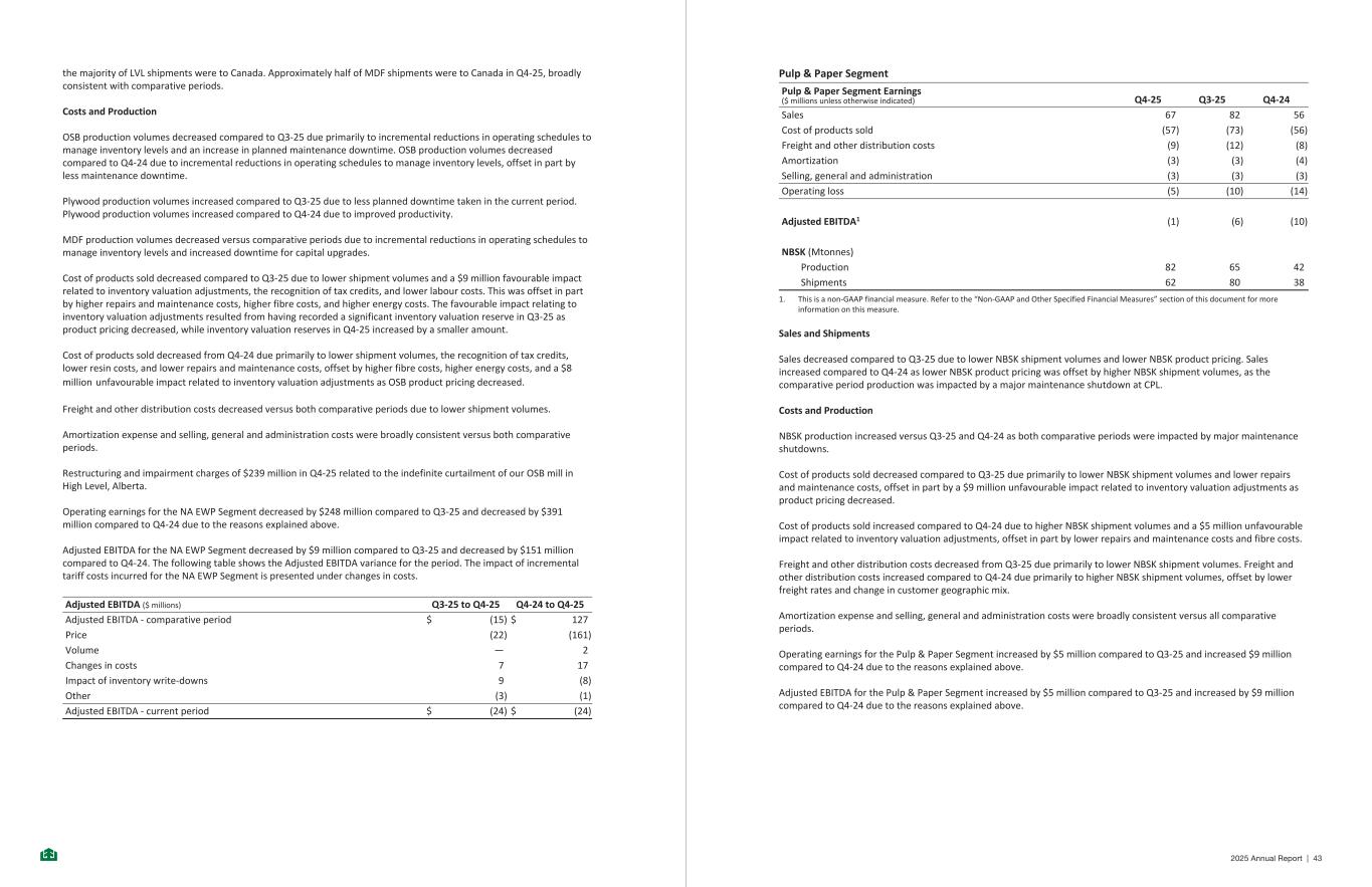 the majority of LVL shipments were to Canada. Approximately half of MDF shipments were to Canada in Q4-25, broadly consistent with comparative periods. Costs and Production OSB production volumes decreased compared to Q3-25 due primarily to incremental reductions in operating schedules to manage inventory levels and an increase in planned maintenance downtime. OSB production volumes decreased compared to Q4-24 due to incremental reductions in operating schedules to manage inventory levels, offset in part by less maintenance downtime. Plywood production volumes increased compared to Q3-25 due to less planned downtime taken in the current period. Plywood production volumes increased compared to Q4-24 due to improved productivity. MDF production volumes decreased versus comparative periods due to incremental reductions in operating schedules to manage inventory levels and increased downtime for capital upgrades. Cost of products sold decreased compared to Q3-25 due to lower shipment volumes and a $9 million favourable impact related to inventory valuation adjustments, the recognition of tax credits, and lower labour costs. This was offset in part by higher repairs and maintenance costs, higher fibre costs, and higher energy costs. The favourable impact relating to inventory valuation adjustments resulted from having recorded a significant inventory valuation reserve in Q3-25 as product pricing decreased, while inventory valuation reserves in Q4-25 increased by a smaller amount. Cost of products sold decreased from Q4-24 due primarily to lower shipment volumes, the recognition of tax credits, lower resin costs, and lower repairs and maintenance costs, offset by higher fibre costs, higher energy costs, and a $8 million unfavourable impact related to inventory valuation adjustments as OSB product pricing decreased. Freight and other distribution costs decreased versus both comparative periods due to lower shipment volumes. Amortization expense and selling, general and administration costs were broadly consistent versus both comparative periods. Restructuring and impairment charges of $239 million in Q4-25 related to the indefinite curtailment of our OSB mill in High Level, Alberta. Operating earnings for the NA EWP Segment decreased by $248 million compared to Q3-25 and decreased by $391 million compared to Q4-24 due to the reasons explained above. Adjusted EBITDA for the NA EWP Segment decreased by $9 million compared to Q3-25 and decreased by $151 million compared to Q4-24. The following table shows the Adjusted EBITDA variance for the period. The impact of incremental tariff costs incurred for the NA EWP Segment is presented under changes in costs. Adjusted EBITDA ($ millions) Q3-25 to Q4-25 Q4-24 to Q4-25 Adjusted EBITDA - comparative period $ (15) $ 127 Price (22) (161) Volume — 2 Changes in costs 7 17 Impact of inventory write-downs 9 (8) Other (3) (1) Adjusted EBITDA - current period $ (24) $ (24) - 23 - Pulp & Paper Segment Pulp & Paper Segment Earnings ($ millions unless otherwise indicated) Q4-25 Q3-25 Q4-24 Sales 67 82 56 Cost of products sold (57) (73) (56) Freight and other distribution costs (9) (12) (8) Amortization (3) (3) (4) Selling, general and administration (3) (3) (3) Operating loss (5) (10) (14) Adjusted EBITDA1 (1) (6) (10) NBSK (Mtonnes) Production 82 65 42 Shipments 62 80 38 1. This is a non-GAAP financial measure. Refer to the “Non-GAAP and Other Specified Financial Measures” section of this document for more information on this measure. Sales and Shipments Sales decreased compared to Q3-25 due to lower NBSK shipment volumes and lower NBSK product pricing. Sales increased compared to Q4-24 as lower NBSK product pricing was offset by higher NBSK shipment volumes, as the comparative period production was impacted by a major maintenance shutdown at CPL. Costs and Production NBSK production increased versus Q3-25 and Q4-24 as both comparative periods were impacted by major maintenance shutdowns. Cost of products sold decreased compared to Q3-25 due primarily to lower NBSK shipment volumes and lower repairs and maintenance costs, offset in part by a $9 million unfavourable impact related to inventory valuation adjustments as product pricing decreased. Cost of products sold increased compared to Q4-24 due to higher NBSK shipment volumes and a $5 million unfavourable impact related to inventory valuation adjustments, offset in part by lower repairs and maintenance costs and fibre costs. Freight and other distribution costs decreased from Q3-25 due primarily to lower NBSK shipment volumes. Freight and other distribution costs increased compared to Q4-24 due primarily to higher NBSK shipment volumes, offset by lower freight rates and change in customer geographic mix. Amortization expense and selling, general and administration costs were broadly consistent versus all comparative periods. Operating earnings for the Pulp & Paper Segment increased by $5 million compared to Q3-25 and increased $9 million compared to Q4-24 due to the reasons explained above. Adjusted EBITDA for the Pulp & Paper Segment increased by $5 million compared to Q3-25 and increased by $9 million compared to Q4-24 due to the reasons explained above. - 24 - 2025 Annual Report | 43