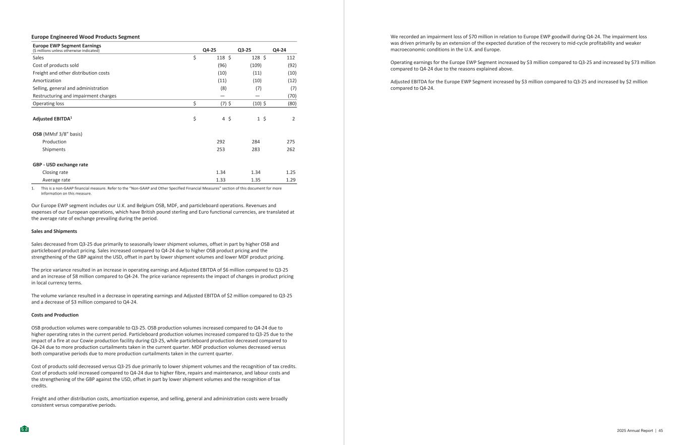 Europe Engineered Wood Products Segment Europe EWP Segment Earnings ($ millions unless otherwise indicated) Q4-25 Q3-25 Q4-24 Sales $ 118 $ 128 $ 112 Cost of products sold (96) (109) (92) Freight and other distribution costs (10) (11) (10) Amortization (11) (10) (12) Selling, general and administration (8) (7) (7) Restructuring and impairment charges — — (70) Operating loss $ (7) $ (10) $ (80) Adjusted EBITDA1 $ 4 $ 1 $ 2 OSB (MMsf 3/8” basis) Production 292 284 275 Shipments 253 283 262 GBP - USD exchange rate Closing rate 1.34 1.34 1.25 Average rate 1.33 1.35 1.29 1. This is a non-GAAP financial measure. Refer to the “Non-GAAP and Other Specified Financial Measures” section of this document for more information on this measure. Our Europe EWP segment includes our U.K. and Belgium OSB, MDF, and particleboard operations. Revenues and expenses of our European operations, which have British pound sterling and Euro functional currencies, are translated at the average rate of exchange prevailing during the period. Sales and Shipments Sales decreased from Q3-25 due primarily to seasonally lower shipment volumes, offset in part by higher OSB and particleboard product pricing. Sales increased compared to Q4-24 due to higher OSB product pricing and the strengthening of the GBP against the USD, offset in part by lower shipment volumes and lower MDF product pricing. The price variance resulted in an increase in operating earnings and Adjusted EBITDA of $6 million compared to Q3-25 and an increase of $8 million compared to Q4-24. The price variance represents the impact of changes in product pricing in local currency terms. The volume variance resulted in a decrease in operating earnings and Adjusted EBITDA of $2 million compared to Q3-25 and a decrease of $3 million compared to Q4-24. Costs and Production OSB production volumes were comparable to Q3-25. OSB production volumes increased compared to Q4-24 due to higher operating rates in the current period. Particleboard production volumes increased compared to Q3-25 due to the impact of a fire at our Cowie production facility during Q3-25, while particleboard production decreased compared to Q4-24 due to more production curtailments taken in the current quarter. MDF production volumes decreased versus both comparative periods due to more production curtailments taken in the current quarter. Cost of products sold decreased versus Q3-25 due primarily to lower shipment volumes and the recognition of tax credits. Cost of products sold increased compared to Q4-24 due to higher fibre, repairs and maintenance, and labour costs and the strengthening of the GBP against the USD, offset in part by lower shipment volumes and the recognition of tax credits. Freight and other distribution costs, amortization expense, and selling, general and administration costs were broadly consistent versus comparative periods. - 25 - We recorded an impairment loss of $70 million in relation to Europe EWP goodwill during Q4-24. The impairment loss was driven primarily by an extension of the expected duration of the recovery to mid-cycle profitability and weaker macroeconomic conditions in the U.K. and Europe. Operating earnings for the Europe EWP Segment increased by $3 million compared to Q3-25 and increased by $73 million compared to Q4-24 due to the reasons explained above. Adjusted EBITDA for the Europe EWP Segment increased by $3 million compared to Q3-25 and increased by $2 million compared to Q4-24. - 26 - 2025 Annual Report | 45
