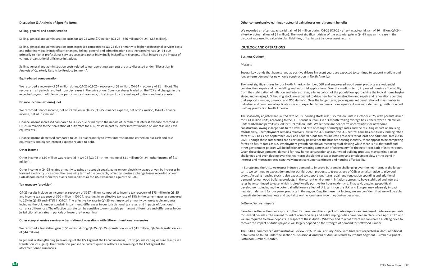 Discussion & Analysis of Specific Items Selling, general and administration Selling, general and administration costs for Q4-25 were $72 million (Q3-25 - $66 million; Q4-24 - $68 million). Selling, general and administration costs increased compared to Q3-25 due primarily to higher professional services costs and other individually insignificant changes. Selling, general and administration costs increased versus Q4-24 due primarily to higher professional services costs and other individually insignificant changes, offset in part by the impact of various organizational efficiency initiatives. Selling, general and administration costs related to our operating segments are also discussed under “Discussion & Analysis of Quarterly Results by Product Segment”. Equity-based compensation We recorded a recovery of $4 million during Q4-25 (Q3-25 - recovery of $2 million; Q4-24 - recovery of $1 million). The recovery in all periods resulted from decreases in the price of our Common shares traded on the TSX and changes in the expected payout multiple on our performance share units, offset in part by the vesting of options and units granted. Finance income (expense), net We recorded finance income, net of $3 million in Q4-25 (Q3-25 - finance expense, net of $12 million; Q4-24 - finance income, net of $12 million). Finance income increased compared to Q3-25 due primarily to the impact of incremental interest expense recorded in Q3-25 in relation to the finalization of duty rates for AR6, offset in part by lower interest income on our cash and cash equivalents. Finance income decreased compared to Q4-24 due primarily to lower interest income earned on our cash and cash equivalents and higher interest expense related to debt. Other income Other income of $10 million was recorded in Q4-25 (Q3-25 - other income of $11 million; Q4-24 - other income of $11 million). Other income in Q4-25 relates primarily to gains on asset disposals, gains on our electricity swaps driven by increases in forward electricity prices over the remaining term of the contracts, offset by foreign exchange losses recorded on our CAD-denominated monetary assets and liabilities as the USD weakened against the CAD. Tax recovery (provision) Q4-25 results include an income tax recovery of $167 million, compared to income tax recovery of $73 million in Q3-25 and income tax expense of $20 million in Q4-24, resulting in an effective tax rate of 18% in the current quarter compared to 26% in Q3-25 and (47)% in Q4-24. The effective tax rate in Q4-25 was impacted primarily by non-taxable amounts including the U.S. lumber goodwill impairment, differences in our jurisdictional tax rates, and impacts of functional currency differences. The effective tax rate can be sensitive to non-taxable permanent differences and differences in our jurisdictional tax rates in periods of lower pre-tax earnings. Other comprehensive earnings – translation of operations with different functional currencies We recorded a translation gain of $5 million during Q4-25 (Q3-25 - translation loss of $11 million; Q4-24 - translation loss of $44 million). In general, a strengthening (weakening) of the USD against the Canadian dollar, British pound sterling or Euro results in a translation loss (gain). The translation gain in the current quarter reflects a weakening of the USD against the aforementioned currencies. - 27 - Other comprehensive earnings – actuarial gains/losses on retirement benefits We recorded an after-tax actuarial gain of $6 million during Q4-25 (Q3-25 - after-tax actuarial gain of $6 million; Q4-24 - after-tax actuarial loss of $5 million). The most significant driver of the actuarial gain in Q4-25 was an increase in the discount rate used to calculate plan liabilities, offset in part by lower asset returns. OUTLOOK AND OPERATIONS Business Outlook Markets Several key trends that have served as positive drivers in recent years are expected to continue to support medium and longer-term demand for new home construction in North America. The most significant uses for our North American lumber, OSB and engineered wood panel products are residential construction, repair and remodelling and industrial applications. Over the medium term, improved housing affordability from the stabilization of inflation and interest rates, a large cohort of the population approaching the typical home buying stage, and an aging U.S. housing stock are expected to drive new home construction and repair and renovation spending that supports lumber, plywood and OSB demand. Over the longer term, growing market penetration of mass timber in industrial and commercial applications is also expected to become a more significant source of demand growth for wood building products in North America. The seasonally adjusted annualized rate of U.S. housing starts was 1.25 million units in October 2025, with permits issued for 1.41 million units, according to the U.S. Census Bureau. On a 3-month trailing average basis, there were 1.28 million units started and permits issued for 1.39 million units. While there are near-term uncertainties for new home construction, owing in large part to the level and rate of change of mortgage rates and the resulting impact on housing affordability, unemployment remains relatively low in the U.S. Further, the U.S. central bank has cut its key lending rate a total of 175 bps since September 2024 and Federal funds futures indicate prospects for at least one additional rate cut in 2026. Though these rate trends are directionally positive for the broader housing industry, there appear to be competing forces on future rates as U.S. employment growth has shown recent signs of slowing while there is risk that tariff and other government policies will be inflationary, creating a measure of uncertainty for the near-term path of interest rates. Given these developments, demand for new home construction and our wood building products may continue to be challenged and ev
