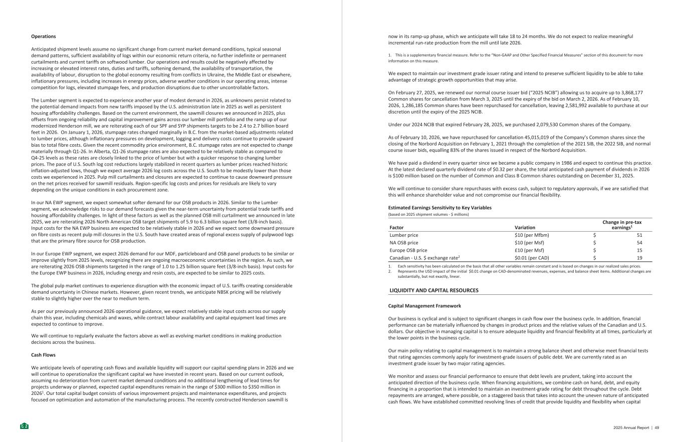 Operations Anticipated shipment levels assume no significant change from current market demand conditions, typical seasonal demand patterns, sufficient availability of logs within our economic return criteria, no further indefinite or permanent curtailments and current tariffs on softwood lumber. Our operations and results could be negatively affected by increasing or elevated interest rates, duties and tariffs, softening demand, the availability of transportation, the availability of labour, disruption to the global economy resulting from conflicts in Ukraine, the Middle East or elsewhere, inflationary pressures, including increases in energy prices, adverse weather conditions in our operating areas, intense competition for logs, elevated stumpage fees, and production disruptions due to other uncontrollable factors. The Lumber segment is expected to experience another year of modest demand in 2026, as unknowns persist related to the potential demand impacts from new tariffs imposed by the U.S. administration late in 2025 as well as persistent housing affordability challenges. Based on the current environment, the sawmill closures we announced in 2025, plus offsets from ongoing reliability and capital improvement gains across our lumber mill portfolio and the ramp up of our modernized Henderson mill, we are reiterating each of our SPF and SYP shipments targets to be 2.4 to 2.7 billion board feet in 2026. On January 1, 2026, stumpage rates changed marginally in B.C. from the market-based adjustments related to lumber prices, although inflationary pressures on development, logging and delivery costs continue to provide upward bias to total fibre costs. Given the recent commodity price environment, B.C. stumpage rates are not expected to change materially through Q1-26. In Alberta, Q1-26 stumpage rates are also expected to be relatively stable as compared to Q4-25 levels as these rates are closely linked to the price of lumber but with a quicker response to changing lumber prices. The pace of U.S. South log cost reductions largely stabilized in recent quarters as lumber prices reached historic inflation-adjusted lows, though we expect average 2026 log costs across the U.S. South to be modestly lower than those costs we experienced in 2025. Pulp mill curtailments and closures are expected to continue to cause downward pressure on the net prices received for sawmill residuals. Region-specific log costs and prices for residuals are likely to vary depending on the unique conditions in each procurement zone. In our NA EWP segment, we expect somewhat softer demand for our OSB products in 2026. Similar to the Lumber segment, we acknowledge risks to our demand forecasts given the near-term uncertainty from potential trade tariffs and housing affordability challenges. In light of these factors as well as the planned OSB mill curtailment we announced in late 2025, we are reiterating 2026 North American OSB target shipments of 5.9 to 6.3 billion square feet (3/8-inch basis). Input costs for the NA EWP business are expected to be relatively stable in 2026 and we expect some downward pressure on fibre costs as recent pulp mill closures in the U.S. South have created areas of regional excess supply of pulpwood logs that are the primary fibre source for OSB production. In our Europe EWP segment, we expect 2026 demand for our MDF, particleboard and OSB panel products to be similar or improve slightly from 2025 levels, recognizing there are ongoing macroeconomic uncertainties in the region. As such, we are reiterating 2026 OSB shipments targeted in the range of 1.0 to 1.25 billion square feet (3/8-inch basis). Input costs for the Europe EWP business in 2026, including energy and resin costs, are expected to be similar to 2025 costs. The global pulp market continues to experience disruption with the economic impact of U.S. tariffs creating considerable demand uncertainty in Chinese markets. However, given recent trends, we anticipate NBSK pricing will be relatively stable to slightly higher over the near to medium term. As per our previously announced 2026 operational guidance, we expect relatively stable input costs across our supply chain this year, including chemicals and waxes, while contract labour availability and capital equipment lead times are expected to continue to improve. We will continue to regularly evaluate the factors above as well as evolving market conditions in making production decisions across the business. Cash Flows We anticipate levels of operating cash flows and available liquidity will support our capital spending plans in 2026 and we will continue to operationalize the significant capital we have invested in recent years. Based on our current outlook, assuming no deterioration from current market demand conditions and no additional lengthening of lead times for projects underway or planned, expected capital expenditures remain in the range of $300 million to $350 million in 20261. Our total capital budget consists of various improvement projects and maintenance expenditures, and projects focused on optimization and automation of the manufacturing process. The recently constructed Henderson sawmill is - 29 - now in its ramp-up phase, which we anticipate will take 18 to 24 months. We do not expect to realize meaningful incremental run-rate production from the mill until late 2026. 1. This is a supplementary financial measure. Refer to the “Non-GAAP and Other Specified Financial Measures” section of this document for more information on this measure. We expect to maintain our investment grade issuer rating and intend to preserve sufficient liquidity to be able to take advantage of strategic growth opportunities that may arise. On February 27, 2025, we renewed our normal course issuer bid (“2025 NCIB”) allowing us to acquire up to 3,868,177 Common shares for cancellation from March 3, 2025 until the expiry of the bid on March 2, 2026. As of February 10, 2026, 1,286,185 Common 