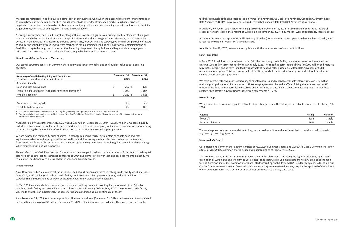 markets are restricted. In addition, as a normal part of our business, we have in the past and may from time to time seek to repurchase our outstanding securities through issuer bids or tender offers, open market purchases, privately negotiated transactions or otherwise. Such repurchases, if any, will depend on prevailing market conditions, our liquidity requirements, contractual and legal restrictions and other factors. A strong balance sheet and liquidity profile, along with our investment-grade issuer rating, are key elements of our goal to maintain a balanced capital allocation strategy. Priorities within this strategy include: reinvesting in our operations across all market cycles to strategically enhance productivity, product mix, and capacity; optimizing our portfolio of assets to reduce the variability of cash flows across market cycles; maintaining a leading cost position; maintaining financial flexibility to capitalize on growth opportunities, including the pursuit of acquisitions and larger-scale strategic growth initiatives; and returning capital to shareholders through dividends and share repurchases. Liquidity and Capital Resource Measures Our capital structure consists of Common share equity and long-term debt, and our liquidity includes our operating facilities. Summary of Available Liquidity and Debt Ratios ($ millions, except as otherwise indicated) December 31, December 31, 2025 2024 Available liquidity Cash and cash equivalents $ 202 $ 641 Operating lines available (excluding newsprint operation)1 1,020 1,044 Available liquidity $ 1,222 $ 1,685 Total debt to total capital2 6% 4% Net debt to total capital2 2% (6%) 1. Excludes demand line of credit dedicated to our jointly-owned paper operation as West Fraser cannot draw on it. 2. This is a capital management measure. Refer to the “Non-GAAP and Other Specified Financial Measures” section of this document for more information on this measure. Available liquidity as at December 31, 2025 was $1,222 million (December 31, 2024 - $1,685 million). Available liquidity includes cash and cash equivalents, cheques issued in excess of funds on deposit, and amounts available on our operating loans, excluding the demand line of credit dedicated to our 50% jointly-owned paper operation. We are exposed to commodity price changes. To manage our liquidity risk, we maintain adequate cash and cash equivalents balances and appropriate lines of credit. In addition, we regularly monitor and review both actual and forecasted cash flows. Refinancing risks are managed by extending maturities through regular renewals and refinancing when market conditions are supportive. Please refer to the “Cash Flow” section for analysis of the changes in cash and cash equivalents. Total debt to total capital and net debt to total capital increased compared to 2024 due primarily to lower cash and cash equivalents on hand. We remain well positioned with a strong balance sheet and liquidity profile. Credit Facilities As at December 31, 2025, our credit facilities consisted of a $1 billion committed revolving credit facility which matures May 2030, a $20 million (£15 million) credit facility dedicated to our European operations, and a $11 million (CAD$15 million) demand line of credit dedicated to our jointly-owned paper operation. In May 2025, we amended and restated our syndicated credit agreement providing for the renewal of our $1 billion revolving credit facility and extension of the facility's maturity from July 2028 to May 2030. The renewed credit facility was made available on substantially the same terms and conditions as our existing credit facility. As at December 31, 2025, our revolving credit facilities were undrawn (December 31, 2024 - undrawn) and the associated deferred financing costs of $2 million (December 31, 2024 - $2 million) were recorded in other assets. Interest on the - 31 - facilities is payable at floating rates based on Prime Rate Advances, US Base Rate Advances, Canadian Overnight Repo Rate Average (“CORRA”) Advances, or Secured Overnight Financing Rate (“SOFR”) Advances at our option. In addition, we have credit facilities totalling $130 million (December 31, 2024 - $130 million) dedicated to letters of credit. Letters of credit in the amount of $38 million (December 31, 2024 - $36 million) were supported by these facilities. All debt is unsecured except the $11 million (CAD$15 million) jointly-owned paper operation demand line of credit, which is secured by that joint operation’s current assets. As at December 31, 2025, we were in compliance with the requirements of our credit facilities. Long-Term Debt In May 2025, in addition to the renewal of our $1 billion revolving credit facility, we also increased and extended our existing $200 million term loan facility maturing July 2025. The modified term loan facility is for $300 million and matures May 2028. Interest on the term loan facility is payable at floating rates based on US Base Rate Advances or SOFR Advances at our option. This loan is repayable at any time, in whole or in part, at our option and without penalty but cannot be redrawn after payment. We have interest rate swap contracts to pay fixed interest rates and receivable variable interest rates on $75 million notional principal amount of indebtedness. These swap agreements have the effect of fixing the interest rate on $75 million of the $300 million term loan discussed above, with the balance being subject to a floating rate. The weighted average fixed interest payable under these swap agreements is 3.27%. Issuer Ratings We are considered investment grade by two leading rating agencies. The ratings in the table below are as at February 10, 2026. Agency Rating Outlook Moody’s Baa2 Stable Standard & Poor’s BBB- Stable These ratings are not a recommendation to buy, sell or hold securities and may be subject to revision or withdrawal at any time by the rating agencies. Shareholder’s Equity Our outsta