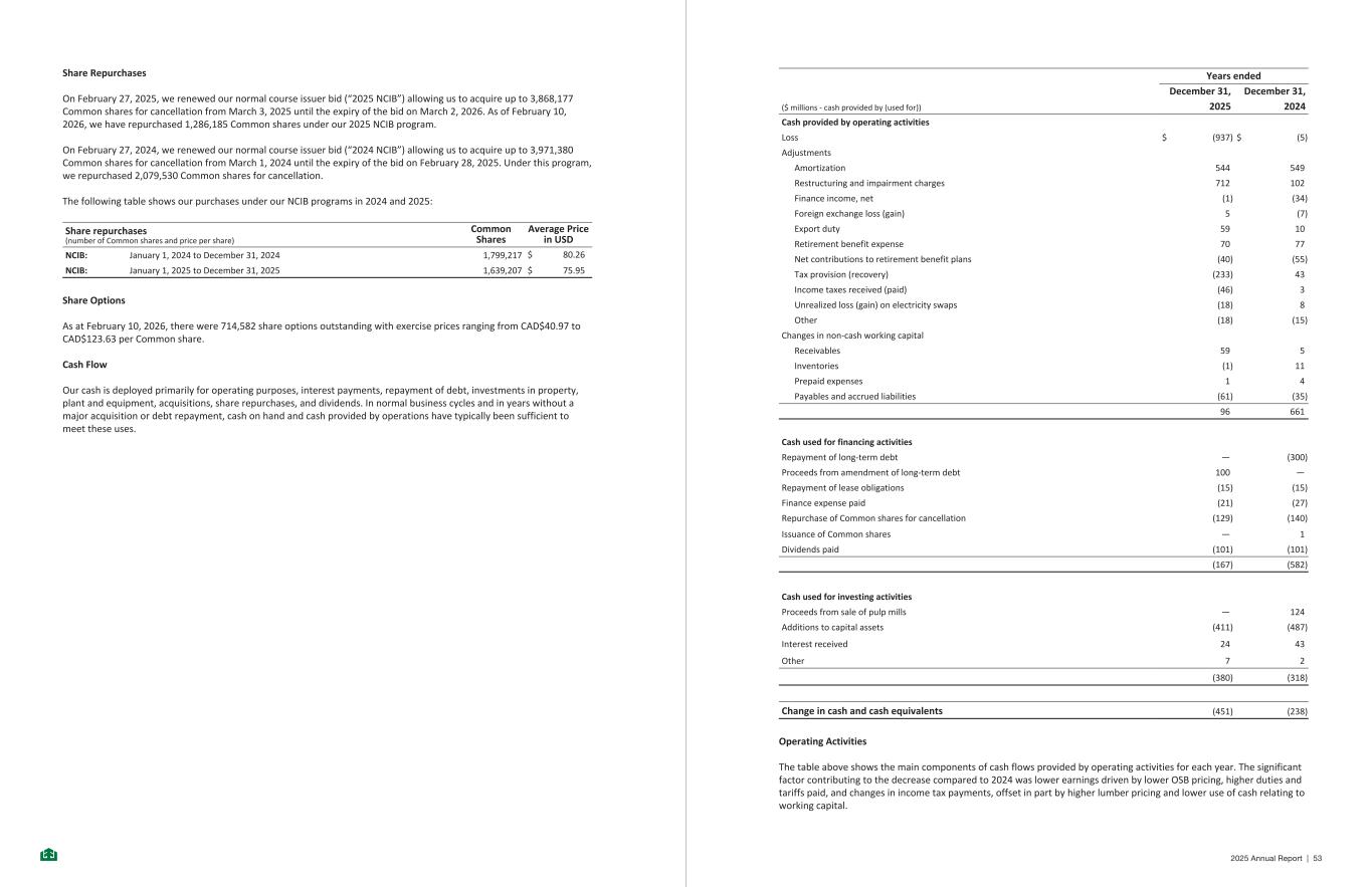 Share Repurchases On February 27, 2025, we renewed our normal course issuer bid (“2025 NCIB”) allowing us to acquire up to 3,868,177 Common shares for cancellation from March 3, 2025 until the expiry of the bid on March 2, 2026. As of February 10, 2026, we have repurchased 1,286,185 Common shares under our 2025 NCIB program. On February 27, 2024, we renewed our normal course issuer bid (“2024 NCIB”) allowing us to acquire up to 3,971,380 Common shares for cancellation from March 1, 2024 until the expiry of the bid on February 28, 2025. Under this program, we repurchased 2,079,530 Common shares for cancellation. The following table shows our purchases under our NCIB programs in 2024 and 2025: Share repurchases (number of Common shares and price per share) Common Shares Average Price in USD NCIB: January 1, 2024 to December 31, 2024 1,799,217 $ 80.26 NCIB: January 1, 2025 to December 31, 2025 1,639,207 $ 75.95 Share Options As at February 10, 2026, there were 714,582 share options outstanding with exercise prices ranging from CAD$40.97 to CAD$123.63 per Common share. Cash Flow Our cash is deployed primarily for operating purposes, interest payments, repayment of debt, investments in property, plant and equipment, acquisitions, share repurchases, and dividends. In normal business cycles and in years without a major acquisition or debt repayment, cash on hand and cash provided by operations have typically been sufficient to meet these uses. - 33 - Years ended December 31, December 31, ($ millions - cash provided by (used for)) 2025 2024 Cash provided by operating activities Loss $ (937) $ (5) Adjustments Amortization 544 549 Restructuring and impairment charges 712 102 Finance income, net (1) (34) Foreign exchange loss (gain) 5 (7) Export duty 59 10 Retirement benefit expense 70 77 Net contributions to retirement benefit plans (40) (55) Tax provision (recovery) (233) 43 Income taxes received (paid) (46) 3 Unrealized loss (gain) on electricity swaps (18) 8 Other (18) (15) Changes in non-cash working capital Receivables 59 5 Inventories (1) 11 Prepaid expenses 1 4 Payables and accrued liabilities (61) (35) 96 661 Cash used for financing activities Repayment of long-term debt — (300) Proceeds from amendment of long-term debt 100 — Repayment of lease obligations (15) (15) Finance expense paid (21) (27) Repurchase of Common shares for cancellation (129) (140) Issuance of Common shares — 1 Dividends paid (101) (101) (167) (582) Cash used for investing activities Proceeds from sale of pulp mills — 124 Additions to capital assets (411) (487) Interest received 24 43 Other 7 2 (380) (318) Change in cash and cash equivalents (451) (238) Operating Activities The table above shows the main components of cash flows provided by operating activities for each year. The significant factor contributing to the decrease compared to 2024 was lower earnings driven by lower OSB pricing, higher duties and tariffs paid, and changes in income tax payments, offset in part by higher lumber pricing and lower use of cash relating to working capital. - 34 - 2025 Annual Report | 53