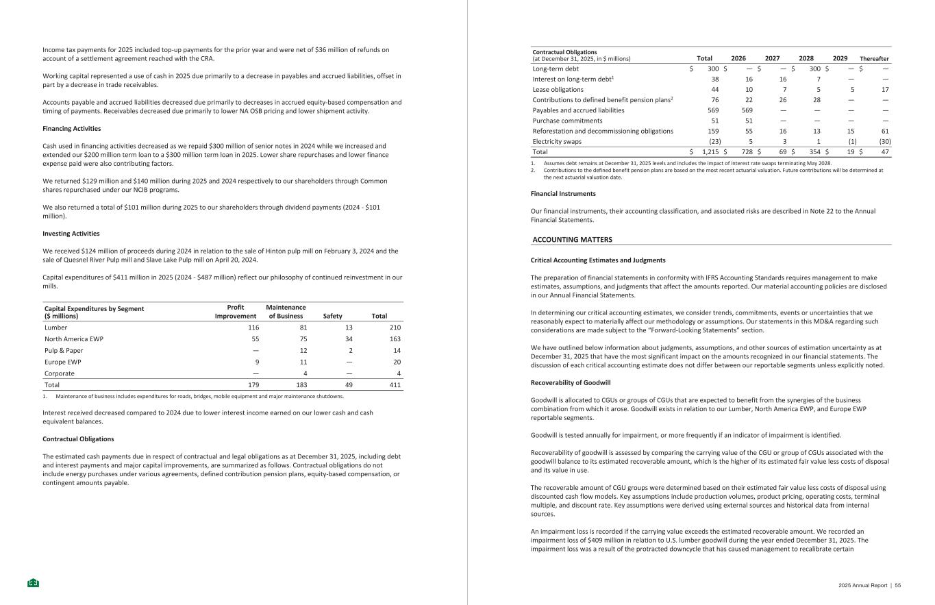 Income tax payments for 2025 included top-up payments for the prior year and were net of $36 million of refunds on account of a settlement agreement reached with the CRA. Working capital represented a use of cash in 2025 due primarily to a decrease in payables and accrued liabilities, offset in part by a decrease in trade receivables. Accounts payable and accrued liabilities decreased due primarily to decreases in accrued equity-based compensation and timing of payments. Receivables decreased due primarily to lower NA OSB pricing and lower shipment activity. Financing Activities Cash used in financing activities decreased as we repaid $300 million of senior notes in 2024 while we increased and extended our $200 million term loan to a $300 million term loan in 2025. Lower share repurchases and lower finance expense paid were also contributing factors. We returned $129 million and $140 million during 2025 and 2024 respectively to our shareholders through Common shares repurchased under our NCIB programs. We also returned a total of $101 million during 2025 to our shareholders through dividend payments (2024 - $101 million). Investing Activities We received $124 million of proceeds during 2024 in relation to the sale of Hinton pulp mill on February 3, 2024 and the sale of Quesnel River Pulp mill and Slave Lake Pulp mill on April 20, 2024. Capital expenditures of $411 million in 2025 (2024 - $487 million) reflect our philosophy of continued reinvestment in our mills. Capital Expenditures by Segment ($ millions) Profit Improvement Maintenance of Business Safety Total Lumber 116 81 13 210 North America EWP 55 75 34 163 Pulp & Paper — 12 2 14 Europe EWP 9 11 — 20 Corporate — 4 — 4 Total 179 183 49 411 1. Maintenance of business includes expenditures for roads, bridges, mobile equipment and major maintenance shutdowns. Interest received decreased compared to 2024 due to lower interest income earned on our lower cash and cash equivalent balances. Contractual Obligations The estimated cash payments due in respect of contractual and legal obligations as at December 31, 2025, including debt and interest payments and major capital improvements, are summarized as follows. Contractual obligations do not include energy purchases under various agreements, defined contribution pension plans, equity-based compensation, or contingent amounts payable. - 35 - Contractual Obligations (at December 31, 2025, in $ millions) Total 2026 2027 2028 2029 Thereafter Long-term debt $ 300 $ — $ — $ 300 $ — $ — Interest on long-term debt1 38 16 16 7 — — Lease obligations 44 10 7 5 5 17 Contributions to defined benefit pension plans2 76 22 26 28 — — Payables and accrued liabilities 569 569 — — — — Purchase commitments 51 51 — — — — Reforestation and decommissioning obligations 159 55 16 13 15 61 Electricity swaps (23) 5 3 1 (1) (30) Total $ 1,215 $ 728 $ 69 $ 354 $ 19 $ 47 1. Assumes debt remains at December 31, 2025 levels and includes the impact of interest rate swaps terminating May 2028. 2. Contributions to the defined benefit pension plans are based on the most recent actuarial valuation. Future contributions will be determined at the next actuarial valuation date. Financial Instruments Our financial instruments, their accounting classification, and associated risks are described in Note 22 to the Annual Financial Statements. ACCOUNTING MATTERS Critical Accounting Estimates and Judgments The preparation of financial statements in conformity with IFRS Accounting Standards requires management to make estimates, assumptions, and judgments that affect the amounts reported. Our material accounting policies are disclosed in our Annual Financial Statements. In determining our critical accounting estimates, we consider trends, commitments, events or uncertainties that we reasonably expect to materially affect our methodology or assumptions. Our statements in this MD&A regarding such considerations are made subject to the “Forward-Looking Statements” section. We have outlined below information about judgments, assumptions, and other sources of estimation uncertainty as at December 31, 2025 that have the most significant impact on the amounts recognized in our financial statements. The discussion of each critical accounting estimate does not differ between our reportable segments unless explicitly noted. Recoverability of Goodwill Goodwill is allocated to CGUs or groups of CGUs that are expected to benefit from the synergies of the business combination from which it arose. Goodwill exists in relation to our Lumber, North America EWP, and Europe EWP reportable segments. Goodwill is tested annually for impairment, or more frequently if an indicator of impairment is identified. Recoverability of goodwill is assessed by comparing the carrying value of the CGU or group of CGUs associated with the goodwill balance to its estimated recoverable amount, which is the higher of its estimated fair value less costs of disposal and its value in use. The recoverable amount of CGU groups were determined based on their estimated fair value less costs of disposal using discounted cash flow models. Key assumptions include production volumes, product pricing, operating costs, terminal multiple, and discount rate. Key assumptions were derived using external sources and historical data from internal sources. An impairment loss is recorded if the carrying value exceeds the estimated recoverable amount. We recorded an impairment loss of $409 million in relation to U.S. lumber goodwill during the year ended December 31, 2025. The impairment loss was a result of the protracted downcycle that has caused management to recalibrate certain - 36 - 2025 Annual Report | 55