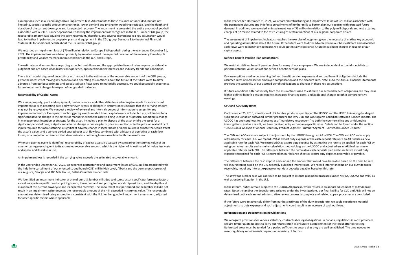 assumptions used in our annual goodwill impairment test. Adjustments to these assumptions included, but are not limited to, species-specific product pricing trends, lower demand and pricing for wood chip residuals, and the depth and duration of the current downcycle and its expected recovery. The impairment represented the entire amount of goodwill associated with our U.S. lumber operations. Following the impairment loss recognized in the U.S. lumber CGU group, the recoverable amount was equal to the carrying amount. Therefore, any adverse movement in a key assumption would lead to further impairment to property, plant and equipment in the CGU group. See note 8 to the Annual Financial Statements for additional details about the US lumber CGU group. We recorded an impairment loss of $70 million in relation to Europe EWP goodwill during the year ended December 31, 2024. The impairment loss was driven primarily by an extension of the expected duration of the recovery to mid-cycle profitability and weaker macroeconomic conditions in the U.K. and Europe. The estimates and assumptions regarding expected cash flows and the appropriate discount rates require considerable judgment and are based upon historical experience, approved financial forecasts and industry trends and conditions. There is a material degree of uncertainty with respect to the estimates of the recoverable amounts of the CGU groups, given the necessity of making key economic and operating assumptions about the future. If the future were to differ adversely from our best estimate and associated cash flows were to materially decrease, we could potentially experience future impairment charges in respect of our goodwill balances. Recoverability of Capital Assets We assess property, plant and equipment, timber licences, and other definite-lived intangible assets for indicators of impairment at each reporting date and whenever events or changes in circumstances indicate that the carrying amount may not be recoverable. We conduct a review of external and internal sources of information to assess for any impairment indicators. Examples of such triggering events related to our capital assets include, but are not limited to: a significant adverse change in the extent or manner in which the asset is being used or in its physical condition; a change in management’s intention or strategy for the asset, including a plan to dispose of the asset or idle the asset for a significant period of time; a significant adverse change in our long-term price assumption or in the price or availability of inputs required for manufacturing; a significant adverse change in legal factors or in the business climate that could affect the asset’s value; and a current period operating or cash flow loss combined with a history of operating or cash flow losses, or a projection or forecast that demonstrates continuing losses associated with the asset’s use. When a triggering event is identified, recoverability of capital assets is assessed by comparing the carrying value of an asset or cash-generating unit to its estimated recoverable amount, which is the higher of its estimated fair value less costs of disposal and its value in use. An impairment loss is recorded if the carrying value exceeds the estimated recoverable amount. In the year ended December 31, 2025, we recorded restructuring and impairment losses of $303 million associated with the indefinite curtailment of our oriented strand board (OSB) mill in High Level, Alberta and the permanent closures of our Augusta, Georgia and 100 Mile House, British Columbia lumber mills. We identified an impairment indicator at one of our U.S. lumber mills due to discrete asset-specific performance factors as well as species-specific product pricing trends, lower demand and pricing for wood chip residuals, and the depth and duration of the current downcycle and its expected recovery. The impairment test performed on the lumber mill did not result in an impairment write-down as the recoverable amount of the mill exceeded its carrying value. The recoverable amount was determined using assumptions consistent with the U.S. lumber goodwill impairment assessment, adjusted for asset-specific factors where applicable. - 37 - In the year ended December 31, 2024, we recorded restructuring and impairment losses of $28 million associated with the permanent closures and indefinite curtailments of lumber mills to better align our capacity with expected future demand. In addition, we recorded an impairment loss of $3 million in relation to the pulp mill disposals and restructuring charges of $2 million related to the restructuring of certain functions at our regional corporate offices. The assessment of impairment indicators requires the exercise of judgment given the necessity of making key economic and operating assumptions about the future. If the future were to differ adversely from our best estimate and associated cash flows were to materially decrease, we could potentially experience future impairment charges in respect of our capital assets. Defined Benefit Pension Plan Assumptions We maintain defined benefit pension plans for many of our employees. We use independent actuarial specialists to perform actuarial valuations of our defined benefit pension plans. Key assumptions used in determining defined benefit pension expense and accrued benefit obligations include the assumed rates of increase for employee compensation and the discount rate. Note 13 to the Annual Financial Statements provides the sensitivity of our accrued benefit obligations to changes in these key assumptions. If future conditions differ adversely from the assumptions used to estimate our accrued benefit obligations, we may incur higher defined benefit pension expense, increased financing costs, and additional charges to other comprehensive earnings. CVD and ADD Duty Rates On November 25, 2016, a coalition of U.S. lumber producers petitioned the USDOC and t