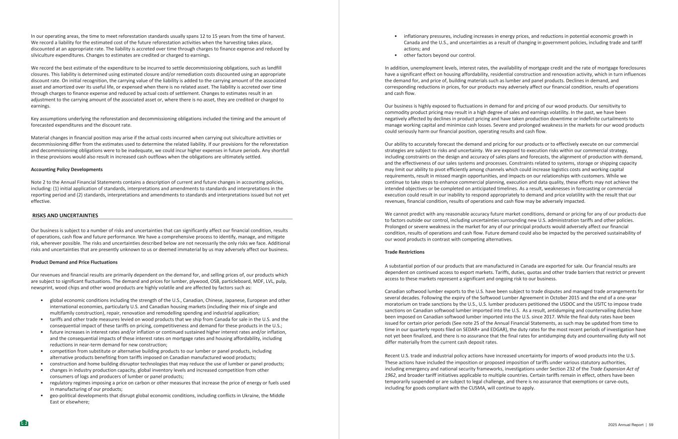 In our operating areas, the time to meet reforestation standards usually spans 12 to 15 years from the time of harvest. We record a liability for the estimated cost of the future reforestation activities when the harvesting takes place, discounted at an appropriate rate. The liability is accreted over time through charges to finance expense and reduced by silviculture expenditures. Changes to estimates are credited or charged to earnings. We record the best estimate of the expenditure to be incurred to settle decommissioning obligations, such as landfill closures. This liability is determined using estimated closure and/or remediation costs discounted using an appropriate discount rate. On initial recognition, the carrying value of the liability is added to the carrying amount of the associated asset and amortized over its useful life, or expensed when there is no related asset. The liability is accreted over time through charges to finance expense and reduced by actual costs of settlement. Changes to estimates result in an adjustment to the carrying amount of the associated asset or, where there is no asset, they are credited or charged to earnings. Key assumptions underlying the reforestation and decommissioning obligations included the timing and the amount of forecasted expenditures and the discount rate. Material changes in financial position may arise if the actual costs incurred when carrying out silviculture activities or decommissioning differ from the estimates used to determine the related liability. If our provisions for the reforestation and decommissioning obligations were to be inadequate, we could incur higher expenses in future periods. Any shortfall in these provisions would also result in increased cash outflows when the obligations are ultimately settled. Accounting Policy Developments Note 2 to the Annual Financial Statements contains a description of current and future changes in accounting policies, including: (1) initial application of standards, interpretations and amendments to standards and interpretations in the reporting period and (2) standards, interpretations and amendments to standards and interpretations issued but not yet effective. RISKS AND UNCERTAINTIES Our business is subject to a number of risks and uncertainties that can significantly affect our financial condition, results of operations, cash flow and future performance. We have a comprehensive process to identify, manage, and mitigate risk, wherever possible. The risks and uncertainties described below are not necessarily the only risks we face. Additional risks and uncertainties that are presently unknown to us or deemed immaterial by us may adversely affect our business. Product Demand and Price Fluctuations Our revenues and financial results are primarily dependent on the demand for, and selling prices of, our products which are subject to significant fluctuations. The demand and prices for lumber, plywood, OSB, particleboard, MDF, LVL, pulp, newsprint, wood chips and other wood products are highly volatile and are affected by factors such as: • global economic conditions including the strength of the U.S., Canadian, Chinese, Japanese, European and other international economies, particularly U.S. and Canadian housing markets (including their mix of single and multifamily construction), repair, renovation and remodelling spending and industrial application; • tariffs and other trade measures levied on wood products that we ship from Canada for sale in the U.S. and the consequential impact of these tariffs on pricing, competitiveness and demand for these products in the U.S.; • future increases in interest rates and/or inflation or continued sustained higher interest rates and/or inflation, and the consequential impacts of these interest rates on mortgage rates and housing affordability, including reductions in near-term demand for new construction; • competition from substitute or alternative building products to our lumber or panel products, including alternative products benefiting from tariffs imposed on Canadian manufactured wood products; • construction and home building disruptor technologies that may reduce the use of lumber or panel products; • changes in industry production capacity, global inventory levels and increased competition from other consumers of logs and producers of lumber or panel products; • regulatory regimes imposing a price on carbon or other measures that increase the price of energy or fuels used in manufacturing of our products; • geo-political developments that disrupt global economic conditions, including conflicts in Ukraine, the Middle East or elsewhere; - 39 - • inflationary pressures, including increases in energy prices, and reductions in potential economic growth in Canada and the U.S., and uncertainties as a result of changing in government policies, including trade and tariff actions; and • other factors beyond our control. In addition, unemployment levels, interest rates, the availability of mortgage credit and the rate of mortgage foreclosures have a significant effect on housing affordability, residential construction and renovation activity, which in turn influences the demand for, and price of, building materials such as lumber and panel products. Declines in demand, and corresponding reductions in prices, for our products may adversely affect our financial condition, results of operations and cash flow. Our business is highly exposed to fluctuations in demand for and pricing of our wood products. Our sensitivity to commodity product pricing may result in a high degree of sales and earnings volatility. In the past, we have been negatively affected by declines in product pricing and have taken production downtime or indefinite curtailments to manage working capital and minimize cash losses. Severe and prolonged weakness in the markets for our wood products could seriously harm our financial position, operating results and cash flow