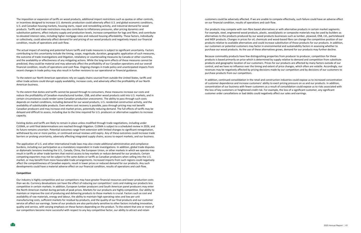 The imposition or expansion of tariffs on wood products, additional import restrictions such as quotas or other controls, or incentives designed to increase U.S. domestic production could adversely affect U.S. and global economic conditions, U.S. and Canadian housing markets, housing starts, repair and remodelling activity, and industrial demand for wood products. Tariffs and trade restrictions may also contribute to inflationary pressures, alter pricing dynamics and substitution patterns, affect industry supply and production levels, increase competition for logs and fibre, and contribute to elevated interest rates, including higher mortgage rates and reduced housing affordability. These factors, individually or collectively, could adversely affect demand for and pricing of our wood products and negatively impact our financial condition, results of operations and cash flow. The actual impact of existing and potential future tariffs and trade measures is subject to significant uncertainty. Factors contributing to this uncertainty include the timing, scope, magnitude, duration, geographic application of such measures, the outcome of trade investigations and litigation, retaliatory or countervailing measures by Canada or other countries, and the availability or effectiveness of any mitigating actions. While the long-term effects of these measures cannot be predicted, they could be material and may adversely affect the profitability of our Canadian operations and our overall financial condition, results of operations and cash flow. Ongoing changes in trade policy and unanticipated impacts from recent changes in trade policy may also result in further revisions to our operational or financial guidance. To the extent our North American operations rely on supply chains sourced from outside the United States, tariffs and other trade actions could disrupt supply availability, increase costs, and adversely affect the profitability of our North American business. To the extent that duties and tariffs cannot be passed through to consumers, these measures increase our costs and reduce the profitability of Canadian-manufactured lumber, OSB, and other wood products sold into U.S. markets, and in certain circumstances could render some Canadian production uneconomic. The ability to pass through such costs depends on market conditions, including demand for our wood products, U.S. residential construction activity, and the availability of substitutable products. Even where cost recovery is possible, pass-through pricing may not benefit Canadian producers and may increase end-market prices, potentially reducing demand. The full effects of tariffs may be delayed and difficult to assess, including due to the time required for U.S. producers or alternative suppliers to increase capacity. Existing duties and tariffs are likely to remain in place unless modified through trade negotiations, including under CUSMA, or until final determinations are reached through litigation. CUSMA is subject to a scheduled review in 2026, and its future remains uncertain. Potential outcomes range from extension with limited changes to significant renegotiation, withdrawal by one or more parties, or continued annual reviews until expiry. Any of these outcomes could increase trade barriers or prolong uncertainty, adversely affecting integrated supply chains, access to export markets, and our business. The application of U.S. and other international trade laws may also create additional administrative and compliance burdens, including our participation as a mandatory respondent in trade investigations. In addition, global trade disputes or diplomatic tensions involving the U.S., Canada, China, the European Union, or other markets in which we operate may result in tariffs or other trade barriers that restrict access to key markets or reduce demand for our products. Certain competing exporters may not be subject to the same duties or tariffs as Canadian producers when selling into the U.S. market, or may benefit from more favourable trade arrangements. Increased imports from such regions could negatively affect the competitiveness of Canadian exports, result in lower prices or reduced demand for our products. Any such developments could have a material adverse effect on our financial condition, results of operations and cash flow. Competition Our industry is highly competitive and our competitors may have greater financial resources and lower production costs than we do. Currency devaluations can have the effect of reducing our competitors’ costs and making our products less competitive in certain markets. In addition, European lumber producers and South American panel producers may enter the North American market during periods of peak prices. Markets for our products are highly competitive. Our ability to maintain or improve the cost of producing and delivering products to those markets is crucial. Factors such as cost and availability of raw materials, energy and labour, the ability to maintain high operating rates and low per unit manufacturing costs, sufficient markets for residual by-products, and the quality of our final products and our customer service all affect our earnings. Some of our products are also particularly sensitive to other factors including innovation, quality and service, with varying emphasis on these factors depending on the product. To the extent that one or more of our competitors become more successful with respect to any key competitive factor, our ability to attract and retain - 41 - customers could be adversely affected. If we are unable to compete effectively, such failure could have an adverse effect on our financial condition, results of operations and cash flow. Our products may compete with non-fibre based alternatives or with alternative products in certain market segments. For example, steel, engineered wood products, plastic, wood/plastic or composite materials may be used by builders as alt