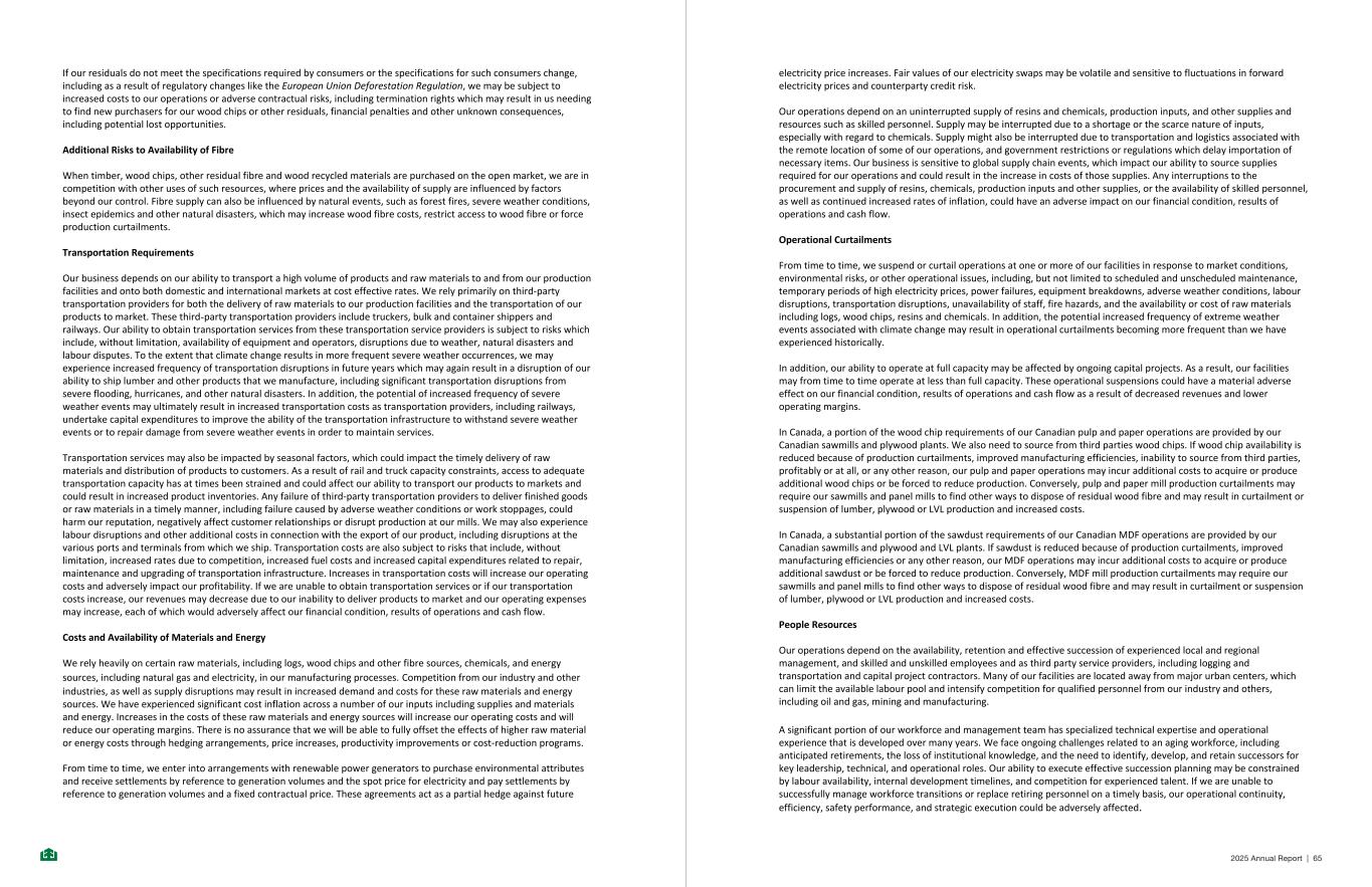 If our residuals do not meet the specifications required by consumers or the specifications for such consumers change, including as a result of regulatory changes like the European Union Deforestation Regulation, we may be subject to increased costs to our operations or adverse contractual risks, including termination rights which may result in us needing to find new purchasers for our wood chips or other residuals, financial penalties and other unknown consequences, including potential lost opportunities. Additional Risks to Availability of Fibre When timber, wood chips, other residual fibre and wood recycled materials are purchased on the open market, we are in competition with other uses of such resources, where prices and the availability of supply are influenced by factors beyond our control. Fibre supply can also be influenced by natural events, such as forest fires, severe weather conditions, insect epidemics and other natural disasters, which may increase wood fibre costs, restrict access to wood fibre or force production curtailments. Transportation Requirements Our business depends on our ability to transport a high volume of products and raw materials to and from our production facilities and onto both domestic and international markets at cost effective rates. We rely primarily on third-party transportation providers for both the delivery of raw materials to our production facilities and the transportation of our products to market. These third-party transportation providers include truckers, bulk and container shippers and railways. Our ability to obtain transportation services from these transportation service providers is subject to risks which include, without limitation, availability of equipment and operators, disruptions due to weather, natural disasters and labour disputes. To the extent that climate change results in more frequent severe weather occurrences, we may experience increased frequency of transportation disruptions in future years which may again result in a disruption of our ability to ship lumber and other products that we manufacture, including significant transportation disruptions from severe flooding, hurricanes, and other natural disasters. In addition, the potential of increased frequency of severe weather events may ultimately result in increased transportation costs as transportation providers, including railways, undertake capital expenditures to improve the ability of the transportation infrastructure to withstand severe weather events or to repair damage from severe weather events in order to maintain services. Transportation services may also be impacted by seasonal factors, which could impact the timely delivery of raw materials and distribution of products to customers. As a result of rail and truck capacity constraints, access to adequate transportation capacity has at times been strained and could affect our ability to transport our products to markets and could result in increased product inventories. Any failure of third-party transportation providers to deliver finished goods or raw materials in a timely manner, including failure caused by adverse weather conditions or work stoppages, could harm our reputation, negatively affect customer relationships or disrupt production at our mills. We may also experience labour disruptions and other additional costs in connection with the export of our product, including disruptions at the various ports and terminals from which we ship. Transportation costs are also subject to risks that include, without limitation, increased rates due to competition, increased fuel costs and increased capital expenditures related to repair, maintenance and upgrading of transportation infrastructure. Increases in transportation costs will increase our operating costs and adversely impact our profitability. If we are unable to obtain transportation services or if our transportation costs increase, our revenues may decrease due to our inability to deliver products to market and our operating expenses may increase, each of which would adversely affect our financial condition, results of operations and cash flow. Costs and Availability of Materials and Energy We rely heavily on certain raw materials, including logs, wood chips and other fibre sources, chemicals, and energy sources, including natural gas and electricity, in our manufacturing processes. Competition from our industry and other industries, as well as supply disruptions may result in increased demand and costs for these raw materials and energy sources. We have experienced significant cost inflation across a number of our inputs including supplies and materials and energy. Increases in the costs of these raw materials and energy sources will increase our operating costs and will reduce our operating margins. There is no assurance that we will be able to fully offset the effects of higher raw material or energy costs through hedging arrangements, price increases, productivity improvements or cost-reduction programs. From time to time, we enter into arrangements with renewable power generators to purchase environmental attributes and receive settlements by reference to generation volumes and the spot price for electricity and pay settlements by reference to generation volumes and a fixed contractual price. These agreements act as a partial hedge against future - 45 - electricity price increases. Fair values of our electricity swaps may be volatile and sensitive to fluctuations in forward electricity prices and counterparty credit risk. Our operations depend on an uninterrupted supply of resins and chemicals, production inputs, and other supplies and resources such as skilled personnel. Supply may be interrupted due to a shortage or the scarce nature of inputs, especially with regard to chemicals. Supply might also be interrupted due to transportation and logistics associated with the remote location of some of our operations, and government restrictions or re