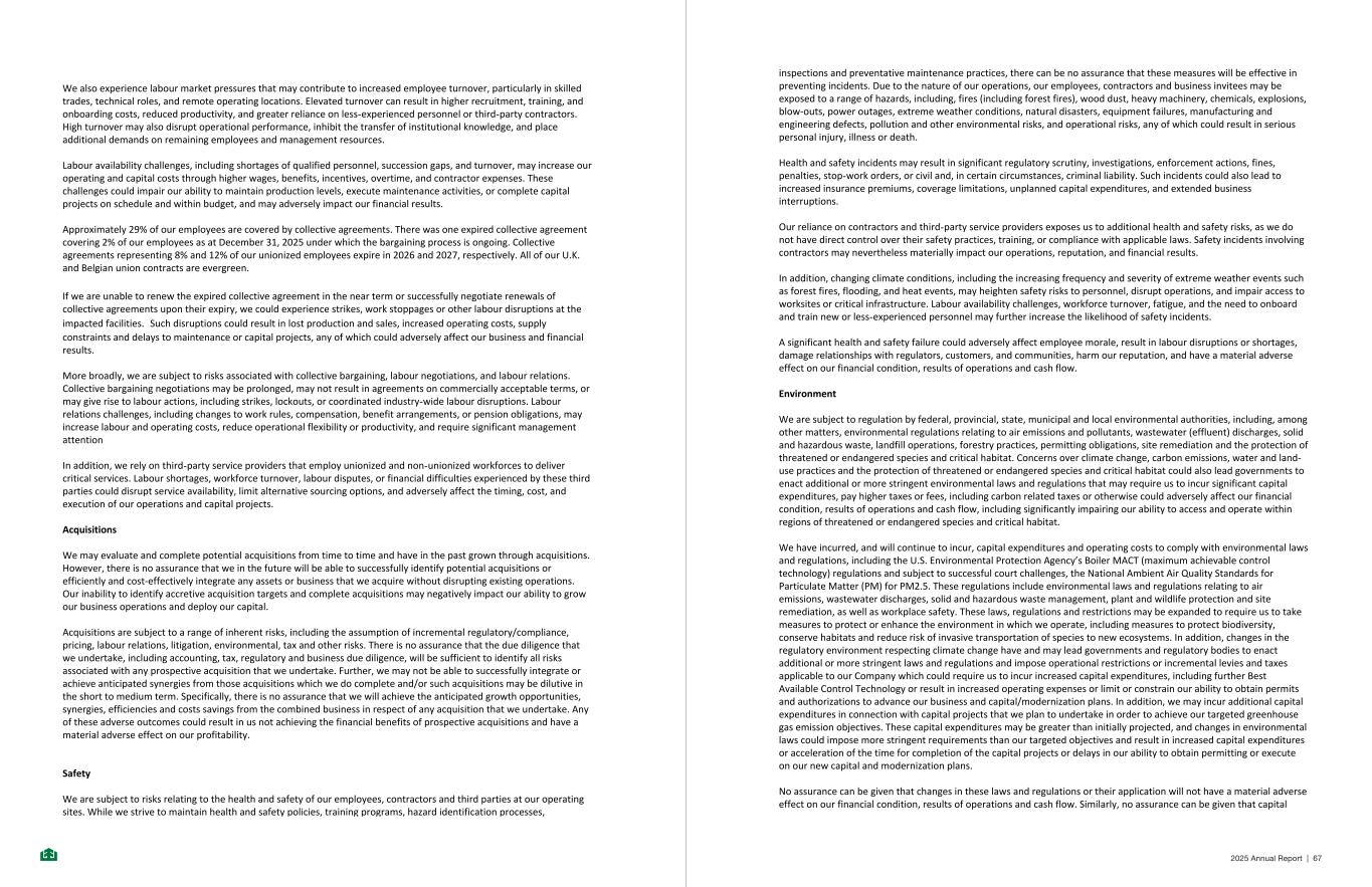 We also experience labour market pressures that may contribute to increased employee turnover, particularly in skilled trades, technical roles, and remote operating locations. Elevated turnover can result in higher recruitment, training, and onboarding costs, reduced productivity, and greater reliance on less-experienced personnel or third-party contractors. High turnover may also disrupt operational performance, inhibit the transfer of institutional knowledge, and place additional demands on remaining employees and management resources. Labour availability challenges, including shortages of qualified personnel, succession gaps, and turnover, may increase our operating and capital costs through higher wages, benefits, incentives, overtime, and contractor expenses. These challenges could impair our ability to maintain production levels, execute maintenance activities, or complete capital projects on schedule and within budget, and may adversely impact our financial results. Approximately 29% of our employees are covered by collective agreements. There was one expired collective agreement covering 2% of our employees as at December 31, 2025 under which the bargaining process is ongoing. Collective agreements representing 8% and 12% of our unionized employees expire in 2026 and 2027, respectively. All of our U.K. and Belgian union contracts are evergreen. If we are unable to renew the expired collective agreement in the near term or successfully negotiate renewals of collective agreements upon their expiry, we could experience strikes, work stoppages or other labour disruptions at the impacted facilities. Such disruptions could result in lost production and sales, increased operating costs, supply constraints and delays to maintenance or capital projects, any of which could adversely affect our business and financial results. More broadly, we are subject to risks associated with collective bargaining, labour negotiations, and labour relations. Collective bargaining negotiations may be prolonged, may not result in agreements on commercially acceptable terms, or may give rise to labour actions, including strikes, lockouts, or coordinated industry-wide labour disruptions. Labour relations challenges, including changes to work rules, compensation, benefit arrangements, or pension obligations, may increase labour and operating costs, reduce operational flexibility or productivity, and require significant management attention In addition, we rely on third-party service providers that employ unionized and non-unionized workforces to deliver critical services. Labour shortages, workforce turnover, labour disputes, or financial difficulties experienced by these third parties could disrupt service availability, limit alternative sourcing options, and adversely affect the timing, cost, and execution of our operations and capital projects. Acquisitions We may evaluate and complete potential acquisitions from time to time and have in the past grown through acquisitions. However, there is no assurance that we in the future will be able to successfully identify potential acquisitions or efficiently and cost-effectively integrate any assets or business that we acquire without disrupting existing operations. Our inability to identify accretive acquisition targets and complete acquisitions may negatively impact our ability to grow our business operations and deploy our capital. Acquisitions are subject to a range of inherent risks, including the assumption of incremental regulatory/compliance, pricing, labour relations, litigation, environmental, tax and other risks. There is no assurance that the due diligence that we undertake, including accounting, tax, regulatory and business due diligence, will be sufficient to identify all risks associated with any prospective acquisition that we undertake. Further, we may not be able to successfully integrate or achieve anticipated synergies from those acquisitions which we do complete and/or such acquisitions may be dilutive in the short to medium term. Specifically, there is no assurance that we will achieve the anticipated growth opportunities, synergies, efficiencies and costs savings from the combined business in respect of any acquisition that we undertake. Any of these adverse outcomes could result in us not achieving the financial benefits of prospective acquisitions and have a material adverse effect on our profitability. Safety We are subject to risks relating to the health and safety of our employees, contractors and third parties at our operating sites. While we strive to maintain health and safety policies, training programs, hazard identification processes, - 47 - inspections and preventative maintenance practices, there can be no assurance that these measures will be effective in preventing incidents. Due to the nature of our operations, our employees, contractors and business invitees may be exposed to a range of hazards, including, fires (including forest fires), wood dust, heavy machinery, chemicals, explosions, blow-outs, power outages, extreme weather conditions, natural disasters, equipment failures, manufacturing and engineering defects, pollution and other environmental risks, and operational risks, any of which could result in serious personal injury, illness or death. Health and safety incidents may result in significant regulatory scrutiny, investigations, enforcement actions, fines, penalties, stop-work orders, or civil and, in certain circumstances, criminal liability. Such incidents could also lead to increased insurance premiums, coverage limitations, unplanned capital expenditures, and extended business interruptions. Our reliance on contractors and third-party service providers exposes us to additional health and safety risks, as we do not have direct control over their safety practices, training, or compliance with applicable laws. Safety incidents involving contractors may nevertheless materially impact our operations, reputation, and
