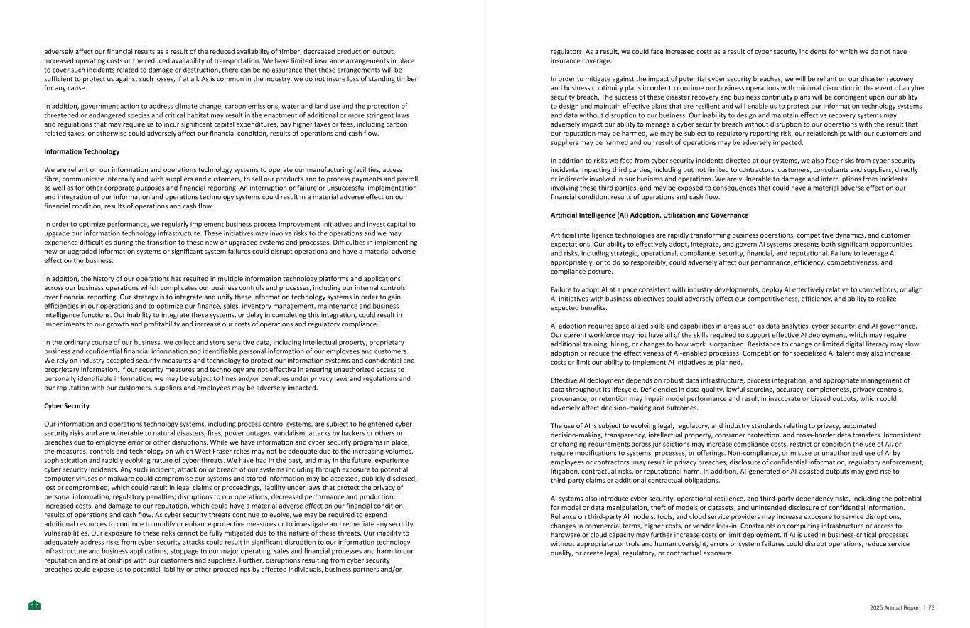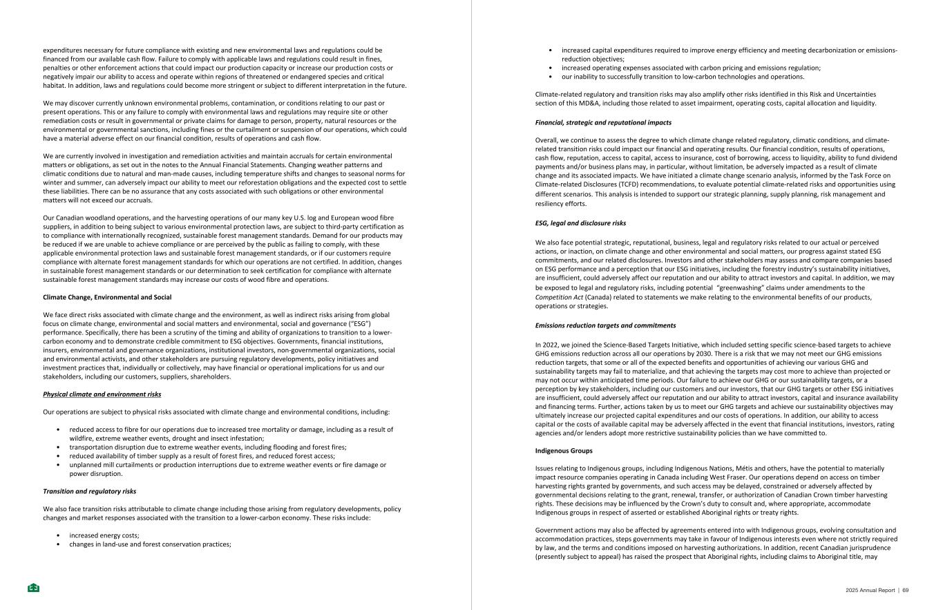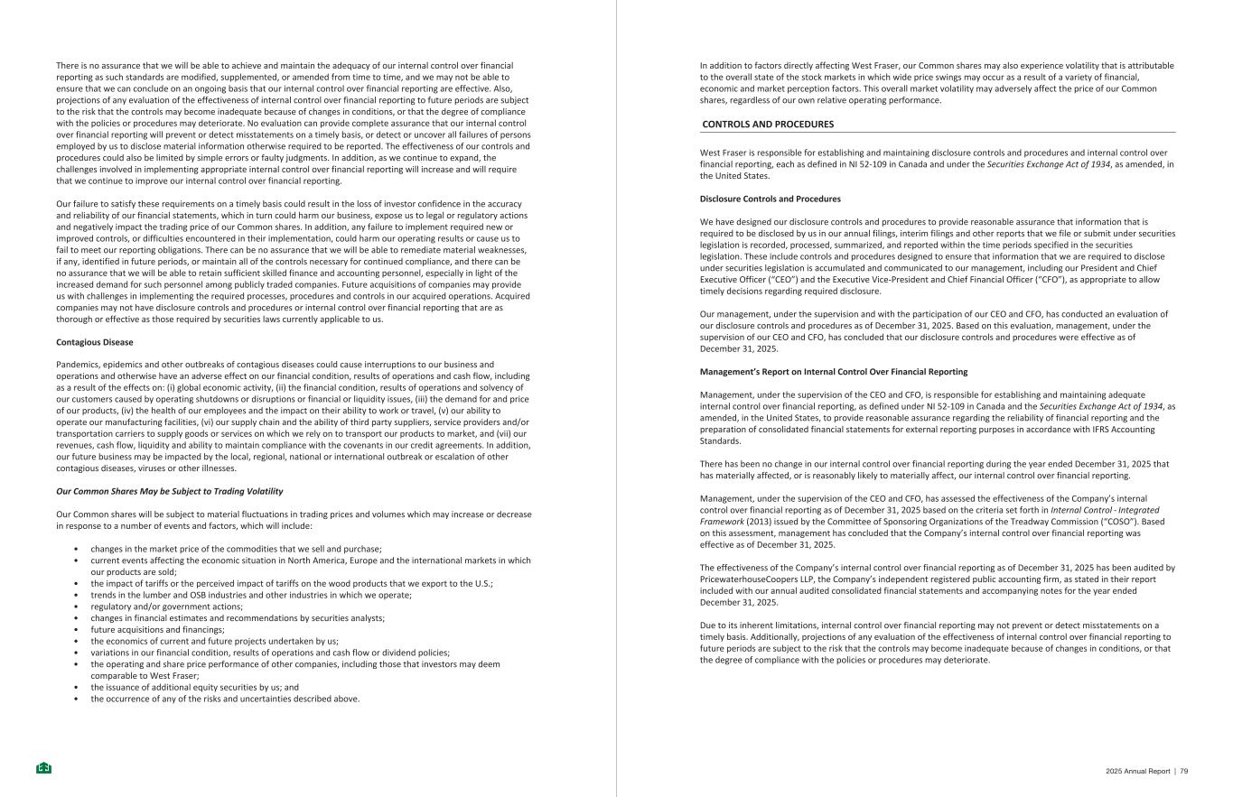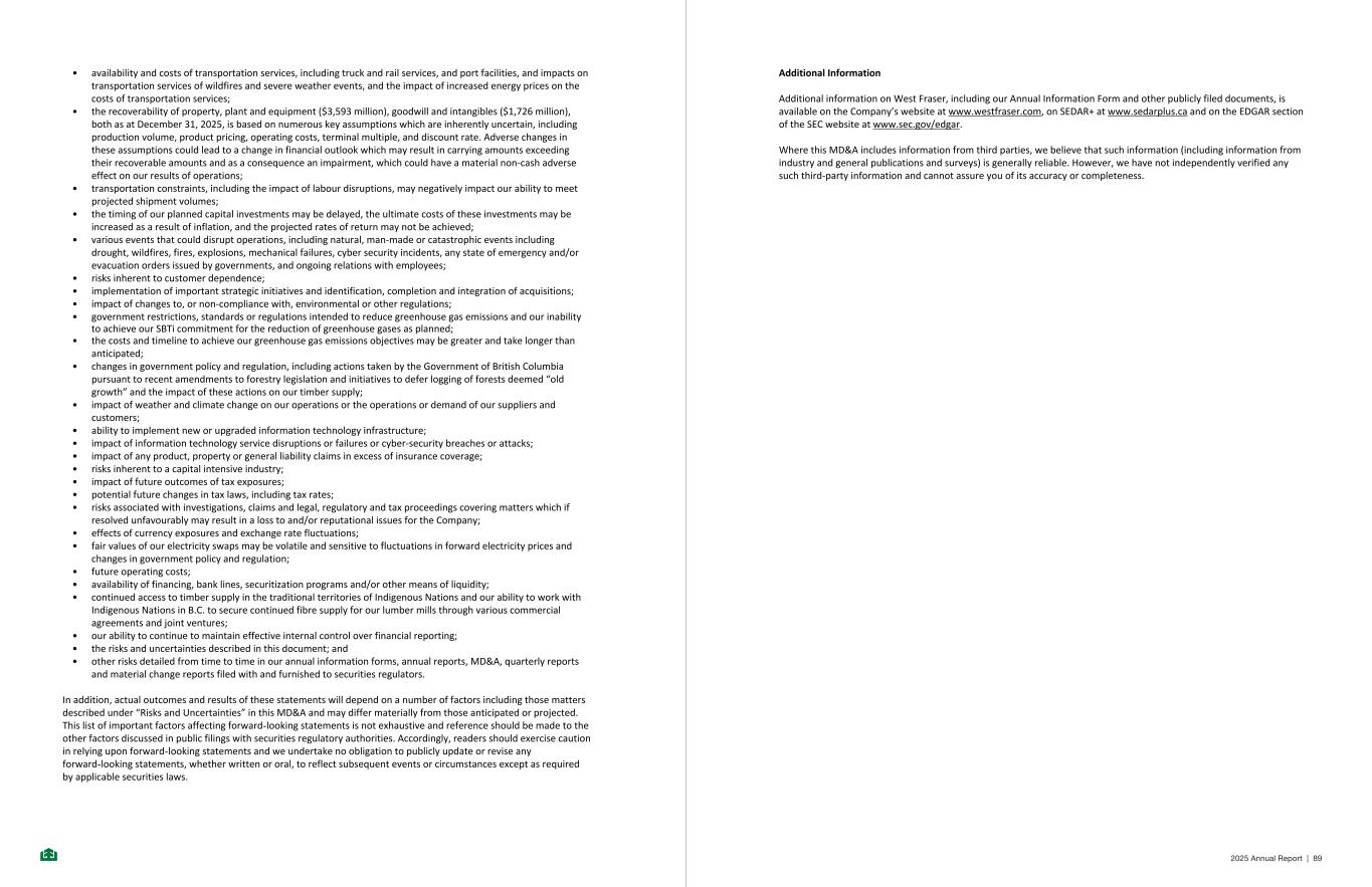 • availability and costs of transportation services, including truck and rail services, and port facilities, and impacts on transportation services of wildfires and severe weather events, and the impact of increased energy prices on the costs of transportation services; • the recoverability of property, plant and equipment ($3,593 million), goodwill and intangibles ($1,726 million), both as at December 31, 2025, is based on numerous key assumptions which are inherently uncertain, including production volume, product pricing, operating costs, terminal multiple, and discount rate. Adverse changes in these assumptions could lead to a change in financial outlook which may result in carrying amounts exceeding their recoverable amounts and as a consequence an impairment, which could have a material non-cash adverse effect on our results of operations; • transportation constraints, including the impact of labour disruptions, may negatively impact our ability to meet projected shipment volumes; • the timing of our planned capital investments may be delayed, the ultimate costs of these investments may be increased as a result of inflation, and the projected rates of return may not be achieved; • various events that could disrupt operations, including natural, man-made or catastrophic events including drought, wildfires, fires, explosions, mechanical failures, cyber security incidents, any state of emergency and/or evacuation orders issued by governments, and ongoing relations with employees; • risks inherent to customer dependence; • implementation of important strategic initiatives and identification, completion and integration of acquisitions; • impact of changes to, or non-compliance with, environmental or other regulations; • government restrictions, standards or regulations intended to reduce greenhouse gas emissions and our inability to achieve our SBTi commitment for the reduction of greenhouse gases as planned; • the costs and timeline to achieve our greenhouse gas emissions objectives may be greater and take longer than anticipated; • changes in government policy and regulation, including actions taken by the Government of British Columbia pursuant to recent amendments to forestry legislation and initiatives to defer logging of forests deemed “old growth” and the impact of these actions on our timber supply; • impact of weather and climate change on our operations or the operations or demand of our suppliers and customers; • ability to implement new or upgraded information technology infrastructure; • impact of information technology service disruptions or failures or cyber-security breaches or attacks; • impact of any product, property or general liability claims in excess of insurance coverage; • risks inherent to a capital intensive industry; • impact of future outcomes of tax exposures; • potential future changes in tax laws, including tax rates; • risks associated with investigations, claims and legal, regulatory and tax proceedings covering matters which if resolved unfavourably may result in a loss to and/or reputational issues for the Company; • effects of currency exposures and exchange rate fluctuations; • fair values of our electricity swaps may be volatile and sensitive to fluctuations in forward electricity prices and changes in government policy and regulation; • future operating costs; • availability of financing, bank lines, securitization programs and/or other means of liquidity; • continued access to timber supply in the traditional territories of Indigenous Nations and our ability to work with Indigenous Nations in B.C. to secure continued fibre supply for our lumber mills through various commercial agreements and joint ventures; • our ability to continue to maintain effective internal control over financial reporting; • the risks and uncertainties described in this document; and • other risks detailed from time to time in our annual information forms, annual reports, MD&A, quarterly reports and material change reports filed with and furnished to securities regulators. In addition, actual outcomes and results of these statements will depend on a number of factors including those matters described under “Risks and Uncertainties” in this MD&A and may differ materially from those anticipated or projected. This list of important factors affecting forward-looking statements is not exhaustive and reference should be made to the other factors discussed in public filings with securities regulatory authorities. Accordingly, readers should exercise caution in relying upon forward-looking statements and we undertake no obligation to publicly update or revise any forward-looking statements, whether written or oral, to reflect subsequent events or circumstances except as required by applicable securities laws. - 69 - Additional Information Additional information on West Fraser, including our Annual Information Form and other publicly filed documents, is available on the Company’s website at www.westfraser.com, on SEDAR+ at www.sedarplus.ca and on the EDGAR section of the SEC website at www.sec.gov/edgar. Where this MD&A includes information from third parties, we believe that such information (including information from industry and general publications and surveys) is generally reliable. However, we have not independently verified any such third-party information and cannot assure you of its accuracy or completeness. - 70 - 2025 Annual Report | 89