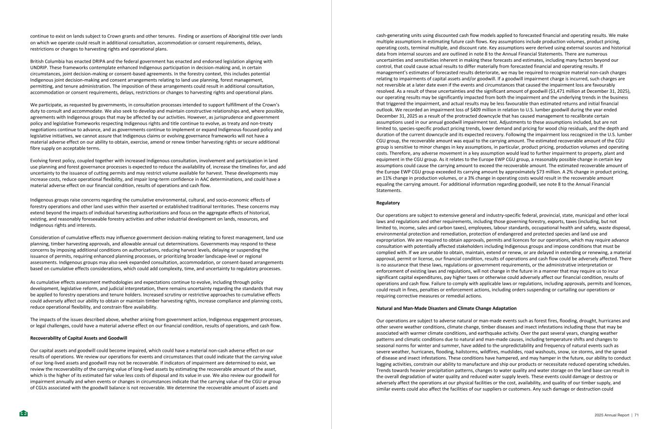 continue to exist on lands subject to Crown grants and other tenures. Finding or assertions of Aboriginal title over lands on which we operate could result in additional consultation, accommodation or consent requirements, delays, restrictions or changes to harvesting rights and operational plans. British Columbia has enacted DRIPA and the federal government has enacted and endorsed legislation aligning with UNDRIP. These frameworks contemplate enhanced Indigenous participation in decision-making and, in certain circumstances, joint decision-making or consent-based agreements. In the forestry context, this includes potential Indigenous joint decision-making and consent arrangements relating to land use planning, forest management, permitting, and tenure administration. The imposition of these arrangements could result in additional consultation, accommodation or consent requirements, delays, restrictions or changes to harvesting rights and operational plans. We participate, as requested by governments, in consultation processes intended to support fulfillment of the Crown’s duty to consult and accommodate. We also seek to develop and maintain constructive relationships and, where possible, agreements with Indigenous groups that may be affected by our activities. However, as jurisprudence and government policy and legislative frameworks respecting Indigenous rights and title continue to evolve, as treaty and non-treaty negotiations continue to advance, and as governments continue to implement or expand Indigenous-focused policy and legislative initiatives, we cannot assure that Indigenous claims or evolving governance frameworks will not have a material adverse effect on our ability to obtain, exercise, amend or renew timber harvesting rights or secure additional fibre supply on acceptable terms. Evolving forest policy, coupled together with increased Indigenous consultation, involvement and participation in land use planning and forest governance processes is expected to reduce the availability of, increase the timelines for, and add uncertainty to the issuance of cutting permits and may restrict volume available for harvest. These developments may increase costs, reduce operational flexibility, and impair long-term confidence in AAC determinations, and could have a material adverse effect on our financial condition, results of operations and cash flow. Indigenous groups raise concerns regarding the cumulative environmental, cultural, and socio-economic effects of forestry operations and other land uses within their asserted or established traditional territories. These concerns may extend beyond the impacts of individual harvesting authorizations and focus on the aggregate effects of historical, existing, and reasonably foreseeable forestry activities and other industrial development on lands, resources, and Indigenous rights and interests. Consideration of cumulative effects may influence government decision-making relating to forest management, land use planning, timber harvesting approvals, and allowable annual cut determinations. Governments may respond to these concerns by imposing additional conditions on authorizations, reducing harvest levels, delaying or suspending the issuance of permits, requiring enhanced planning processes, or prioritizing broader landscape-level or regional assessments. Indigenous groups may also seek expanded consultation, accommodation, or consent-based arrangements based on cumulative effects considerations, which could add complexity, time, and uncertainty to regulatory processes. As cumulative effects assessment methodologies and expectations continue to evolve, including through policy development, legislative reform, and judicial interpretation, there remains uncertainty regarding the standards that may be applied to forestry operations and tenure holders. Increased scrutiny or restrictive approaches to cumulative effects could adversely affect our ability to obtain or maintain timber harvesting rights, increase compliance and planning costs, reduce operational flexibility, and constrain fibre availability. The impacts of the issues described above, whether arising from government action, Indigenous engagement processes, or legal challenges, could have a material adverse effect on our financial condition, results of operations, and cash flow. Recoverability of Capital Assets and Goodwill Our capital assets and goodwill could become impaired, which could have a material non-cash adverse effect on our results of operations. We review our operations for events and circumstances that could indicate that the carrying value of our long-lived assets and goodwill may not be recoverable. If indicators of impairment are determined to exist, we review the recoverability of the carrying value of long-lived assets by estimating the recoverable amount of the asset, which is the higher of its estimated fair value less costs of disposal and its value in use. We also review our goodwill for impairment annually and when events or changes in circumstances indicate that the carrying value of the CGU or group of CGUs associated with the goodwill balance is not recoverable. We determine the recoverable amount of assets and - 51 - cash-generating units using discounted cash flow models applied to forecasted financial and operating results. We make multiple assumptions in estimating future cash flows. Key assumptions include production volumes, product pricing, operating costs, terminal multiple, and discount rate. Key assumptions were derived using external sources and historical data from internal sources and are outlined in note 8 to the Annual Financial Statements. There are numerous uncertainties and sensitivities inherent in making these forecasts and estimates, including many factors beyond our control, that could cause actual results to differ materially from forecasted financial and operating results. If management’s estimates of forecasted results deteriorate
