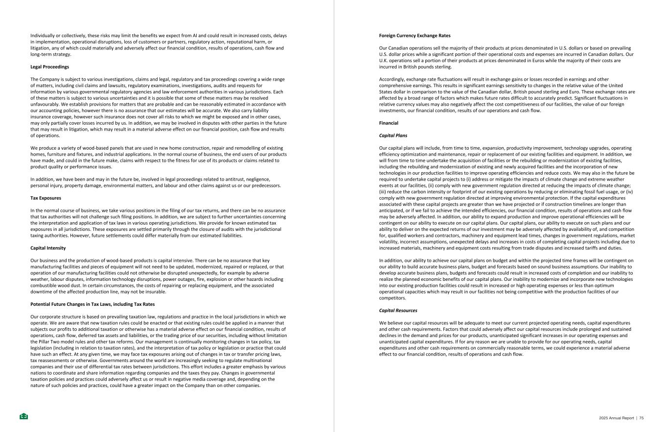 Individually or collectively, these risks may limit the benefits we expect from AI and could result in increased costs, delays in implementation, operational disruptions, loss of customers or partners, regulatory action, reputational harm, or litigation, any of which could materially and adversely affect our financial condition, results of operations, cash flow and long-term strategy. Legal Proceedings The Company is subject to various investigations, claims and legal, regulatory and tax proceedings covering a wide range of matters, including civil claims and lawsuits, regulatory examinations, investigations, audits and requests for information by various governmental regulatory agencies and law enforcement authorities in various jurisdictions. Each of these matters is subject to various uncertainties and it is possible that some of these matters may be resolved unfavourably. We establish provisions for matters that are probable and can be reasonably estimated in accordance with our accounting policies, however there is no assurance that our estimates will be accurate. We also carry liability insurance coverage, however such insurance does not cover all risks to which we might be exposed and in other cases, may only partially cover losses incurred by us. In addition, we may be involved in disputes with other parties in the future that may result in litigation, which may result in a material adverse effect on our financial position, cash flow and results of operations. We produce a variety of wood-based panels that are used in new home construction, repair and remodelling of existing homes, furniture and fixtures, and industrial applications. In the normal course of business, the end users of our products have made, and could in the future make, claims with respect to the fitness for use of its products or claims related to product quality or performance issues. In addition, we have been and may in the future be, involved in legal proceedings related to antitrust, negligence, personal injury, property damage, environmental matters, and labour and other claims against us or our predecessors. Tax Exposures In the normal course of business, we take various positions in the filing of our tax returns, and there can be no assurance that tax authorities will not challenge such filing positions. In addition, we are subject to further uncertainties concerning the interpretation and application of tax laws in various operating jurisdictions. We provide for known estimated tax exposures in all jurisdictions. These exposures are settled primarily through the closure of audits with the jurisdictional taxing authorities. However, future settlements could differ materially from our estimated liabilities. Capital Intensity Our business and the production of wood-based products is capital intensive. There can be no assurance that key manufacturing facilities and pieces of equipment will not need to be updated, modernized, repaired or replaced, or that operation of our manufacturing facilities could not otherwise be disrupted unexpectedly, for example by adverse weather, labour disputes, information technology disruptions, power outages, fire, explosion or other hazards including combustible wood dust. In certain circumstances, the costs of repairing or replacing equipment, and the associated downtime of the affected production line, may not be insurable. Potential Future Changes in Tax Laws, including Tax Rates Our corporate structure is based on prevailing taxation law, regulations and practice in the local jurisdictions in which we operate. We are aware that new taxation rules could be enacted or that existing rules could be applied in a manner that subjects our profits to additional taxation or otherwise has a material adverse effect on our financial condition, results of operations, cash flow, deferred tax assets and liabilities, or the trading price of our securities, including without limitation the Pillar Two model rules and other tax reforms. Our management is continually monitoring changes in tax policy, tax legislation (including in relation to taxation rates), and the interpretation of tax policy or legislation or practice that could have such an effect. At any given time, we may face tax exposures arising out of changes in tax or transfer pricing laws, tax reassessments or otherwise. Governments around the world are increasingly seeking to regulate multinational companies and their use of differential tax rates between jurisdictions. This effort includes a greater emphasis by various nations to coordinate and share information regarding companies and the taxes they pay. Changes in governmental taxation policies and practices could adversely affect us or result in negative media coverage and, depending on the nature of such policies and practices, could have a greater impact on the Company than on other companies. - 55 - Foreign Currency Exchange Rates Our Canadian operations sell the majority of their products at prices denominated in U.S. dollars or based on prevailing U.S. dollar prices while a significant portion of their operational costs and expenses are incurred in Canadian dollars. Our U.K. operations sell a portion of their products at prices denominated in Euros while the majority of their costs are incurred in British pounds sterling. Accordingly, exchange rate fluctuations will result in exchange gains or losses recorded in earnings and other comprehensive earnings. This results in significant earnings sensitivity to changes in the relative value of the United States dollar in comparison to the value of the Canadian dollar, British pound sterling and Euro. These exchange rates are affected by a broad range of factors which makes future rates difficult to accurately predict. Significant fluctuations in relative currency values may also negatively affect the cost competitiveness of our facilities, the value of our foreign investments, our financial condition, results of our operations