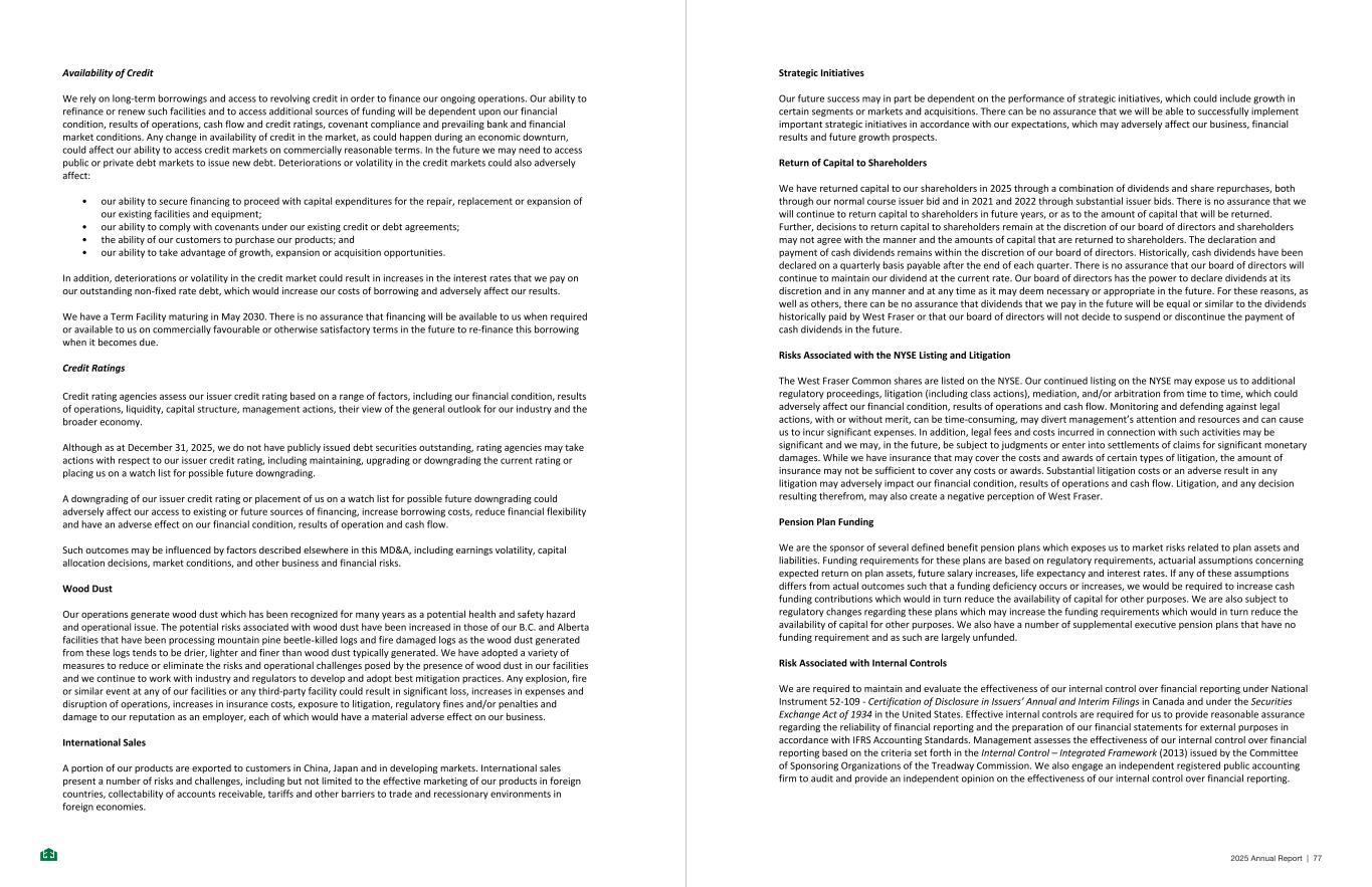 Availability of Credit We rely on long-term borrowings and access to revolving credit in order to finance our ongoing operations. Our ability to refinance or renew such facilities and to access additional sources of funding will be dependent upon our financial condition, results of operations, cash flow and credit ratings, covenant compliance and prevailing bank and financial market conditions. Any change in availability of credit in the market, as could happen during an economic downturn, could affect our ability to access credit markets on commercially reasonable terms. In the future we may need to access public or private debt markets to issue new debt. Deteriorations or volatility in the credit markets could also adversely affect: • our ability to secure financing to proceed with capital expenditures for the repair, replacement or expansion of our existing facilities and equipment; • our ability to comply with covenants under our existing credit or debt agreements; • the ability of our customers to purchase our products; and • our ability to take advantage of growth, expansion or acquisition opportunities. In addition, deteriorations or volatility in the credit market could result in increases in the interest rates that we pay on our outstanding non-fixed rate debt, which would increase our costs of borrowing and adversely affect our results. We have a Term Facility maturing in May 2030. There is no assurance that financing will be available to us when required or available to us on commercially favourable or otherwise satisfactory terms in the future to re-finance this borrowing when it becomes due. Credit Ratings Credit rating agencies assess our issuer credit rating based on a range of factors, including our financial condition, results of operations, liquidity, capital structure, management actions, their view of the general outlook for our industry and the broader economy. Although as at December 31, 2025, we do not have publicly issued debt securities outstanding, rating agencies may take actions with respect to our issuer credit rating, including maintaining, upgrading or downgrading the current rating or placing us on a watch list for possible future downgrading. A downgrading of our issuer credit rating or placement of us on a watch list for possible future downgrading could adversely affect our access to existing or future sources of financing, increase borrowing costs, reduce financial flexibility and have an adverse effect on our financial condition, results of operation and cash flow. Such outcomes may be influenced by factors described elsewhere in this MD&A, including earnings volatility, capital allocation decisions, market conditions, and other business and financial risks. Wood Dust Our operations generate wood dust which has been recognized for many years as a potential health and safety hazard and operational issue. The potential risks associated with wood dust have been increased in those of our B.C. and Alberta facilities that have been processing mountain pine beetle-killed logs and fire damaged logs as the wood dust generated from these logs tends to be drier, lighter and finer than wood dust typically generated. We have adopted a variety of measures to reduce or eliminate the risks and operational challenges posed by the presence of wood dust in our facilities and we continue to work with industry and regulators to develop and adopt best mitigation practices. Any explosion, fire or similar event at any of our facilities or any third-party facility could result in significant loss, increases in expenses and disruption of operations, increases in insurance costs, exposure to litigation, regulatory fines and/or penalties and damage to our reputation as an employer, each of which would have a material adverse effect on our business. International Sales A portion of our products are exported to customers in China, Japan and in developing markets. International sales present a number of risks and challenges, including but not limited to the effective marketing of our products in foreign countries, collectability of accounts receivable, tariffs and other barriers to trade and recessionary environments in foreign economies. - 57 - Strategic Initiatives Our future success may in part be dependent on the performance of strategic initiatives, which could include growth in certain segments or markets and acquisitions. There can be no assurance that we will be able to successfully implement important strategic initiatives in accordance with our expectations, which may adversely affect our business, financial results and future growth prospects. Return of Capital to Shareholders We have returned capital to our shareholders in 2025 through a combination of dividends and share repurchases, both through our normal course issuer bid and in 2021 and 2022 through substantial issuer bids. There is no assurance that we will continue to return capital to shareholders in future years, or as to the amount of capital that will be returned. Further, decisions to return capital to shareholders remain at the discretion of our board of directors and shareholders may not agree with the manner and the amounts of capital that are returned to shareholders. The declaration and payment of cash dividends remains within the discretion of our board of directors. Historically, cash dividends have been declared on a quarterly basis payable after the end of each quarter. There is no assurance that our board of directors will continue to maintain our dividend at the current rate. Our board of directors has the power to declare dividends at its discretion and in any manner and at any time as it may deem necessary or appropriate in the future. For these reasons, as well as others, there can be no assurance that dividends that we pay in the future will be equal or similar to the dividends historically paid by West Fraser or that our board of directors will not decide to suspend or discontinue the