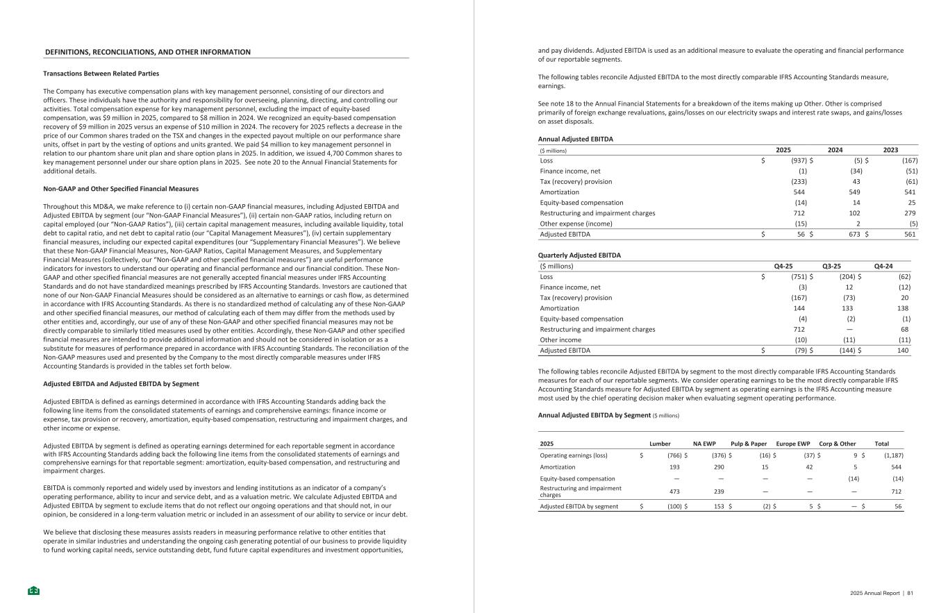 DEFINITIONS, RECONCILIATIONS, AND OTHER INFORMATION Transactions Between Related Parties The Company has executive compensation plans with key management personnel, consisting of our directors and officers. These individuals have the authority and responsibility for overseeing, planning, directing, and controlling our activities. Total compensation expense for key management personnel, excluding the impact of equity-based compensation, was $9 million in 2025, compared to $8 million in 2024. We recognized an equity-based compensation recovery of $9 million in 2025 versus an expense of $10 million in 2024. The recovery for 2025 reflects a decrease in the price of our Common shares traded on the TSX and changes in the expected payout multiple on our performance share units, offset in part by the vesting of options and units granted. We paid $4 million to key management personnel in relation to our phantom share unit plan and share option plans in 2025. In addition, we issued 4,700 Common shares to key management personnel under our share option plans in 2025. See note 20 to the Annual Financial Statements for additional details. Non-GAAP and Other Specified Financial Measures Throughout this MD&A, we make reference to (i) certain non-GAAP financial measures, including Adjusted EBITDA and Adjusted EBITDA by segment (our “Non-GAAP Financial Measures”), (ii) certain non-GAAP ratios, including return on capital employed (our “Non-GAAP Ratios”), (iii) certain capital management measures, including available liquidity, total debt to capital ratio, and net debt to capital ratio (our “Capital Management Measures”), (iv) certain supplementary financial measures, including our expected capital expenditures (our “Supplementary Financial Measures”). We believe that these Non-GAAP Financial Measures, Non-GAAP Ratios, Capital Management Measures, and Supplementary Financial Measures (collectively, our “Non-GAAP and other specified financial measures”) are useful performance indicators for investors to understand our operating and financial performance and our financial condition. These Non- GAAP and other specified financial measures are not generally accepted financial measures under IFRS Accounting Standards and do not have standardized meanings prescribed by IFRS Accounting Standards. Investors are cautioned that none of our Non-GAAP Financial Measures should be considered as an alternative to earnings or cash flow, as determined in accordance with IFRS Accounting Standards. As there is no standardized method of calculating any of these Non-GAAP and other specified financial measures, our method of calculating each of them may differ from the methods used by other entities and, accordingly, our use of any of these Non-GAAP and other specified financial measures may not be directly comparable to similarly titled measures used by other entities. Accordingly, these Non-GAAP and other specified financial measures are intended to provide additional information and should not be considered in isolation or as a substitute for measures of performance prepared in accordance with IFRS Accounting Standards. The reconciliation of the Non-GAAP measures used and presented by the Company to the most directly comparable measures under IFRS Accounting Standards is provided in the tables set forth below. Adjusted EBITDA and Adjusted EBITDA by Segment Adjusted EBITDA is defined as earnings determined in accordance with IFRS Accounting Standards adding back the following line items from the consolidated statements of earnings and comprehensive earnings: finance income or expense, tax provision or recovery, amortization, equity-based compensation, restructuring and impairment charges, and other income or expense. Adjusted EBITDA by segment is defined as operating earnings determined for each reportable segment in accordance with IFRS Accounting Standards adding back the following line items from the consolidated statements of earnings and comprehensive earnings for that reportable segment: amortization, equity-based compensation, and restructuring and impairment charges. EBITDA is commonly reported and widely used by investors and lending institutions as an indicator of a company’s operating performance, ability to incur and service debt, and as a valuation metric. We calculate Adjusted EBITDA and Adjusted EBITDA by segment to exclude items that do not reflect our ongoing operations and that should not, in our opinion, be considered in a long-term valuation metric or included in an assessment of our ability to service or incur debt. We believe that disclosing these measures assists readers in measuring performance relative to other entities that operate in similar industries and understanding the ongoing cash generating potential of our business to provide liquidity to fund working capital needs, service outstanding debt, fund future capital expenditures and investment opportunities, - 61 - and pay dividends. Adjusted EBITDA is used as an additional measure to evaluate the operating and financial performance of our reportable segments. The following tables reconcile Adjusted EBITDA to the most directly comparable IFRS Accounting Standards measure, earnings. See note 18 to the Annual Financial Statements for a breakdown of the items making up Other. Other is comprised primarily of foreign exchange revaluations, gains/losses on our electricity swaps and interest rate swaps, and gains/losses on asset disposals. Annual Adjusted EBITDA ($ millions) 2025 2024 2023 Loss $ (937) $ (5) $ (167) Finance income, net (1) (34) (51) Tax (recovery) provision (233) 43 (61) Amortization 544 549 541 Equity-based compensation (14) 14 25 Restructuring and impairment charges 712 102 279 Other expense (income) (15) 2 (5) Adjusted EBITDA $ 56 $ 673 $ 561 Quarterly Adjusted EBITDA ($ millions) Q4-25 Q3-25 Q4-24 Loss $ (751) $ (204) $ (62) Finance income, net (3) 12 (12) Tax (recovery) provision (167) (73) 20 Amortization 144
