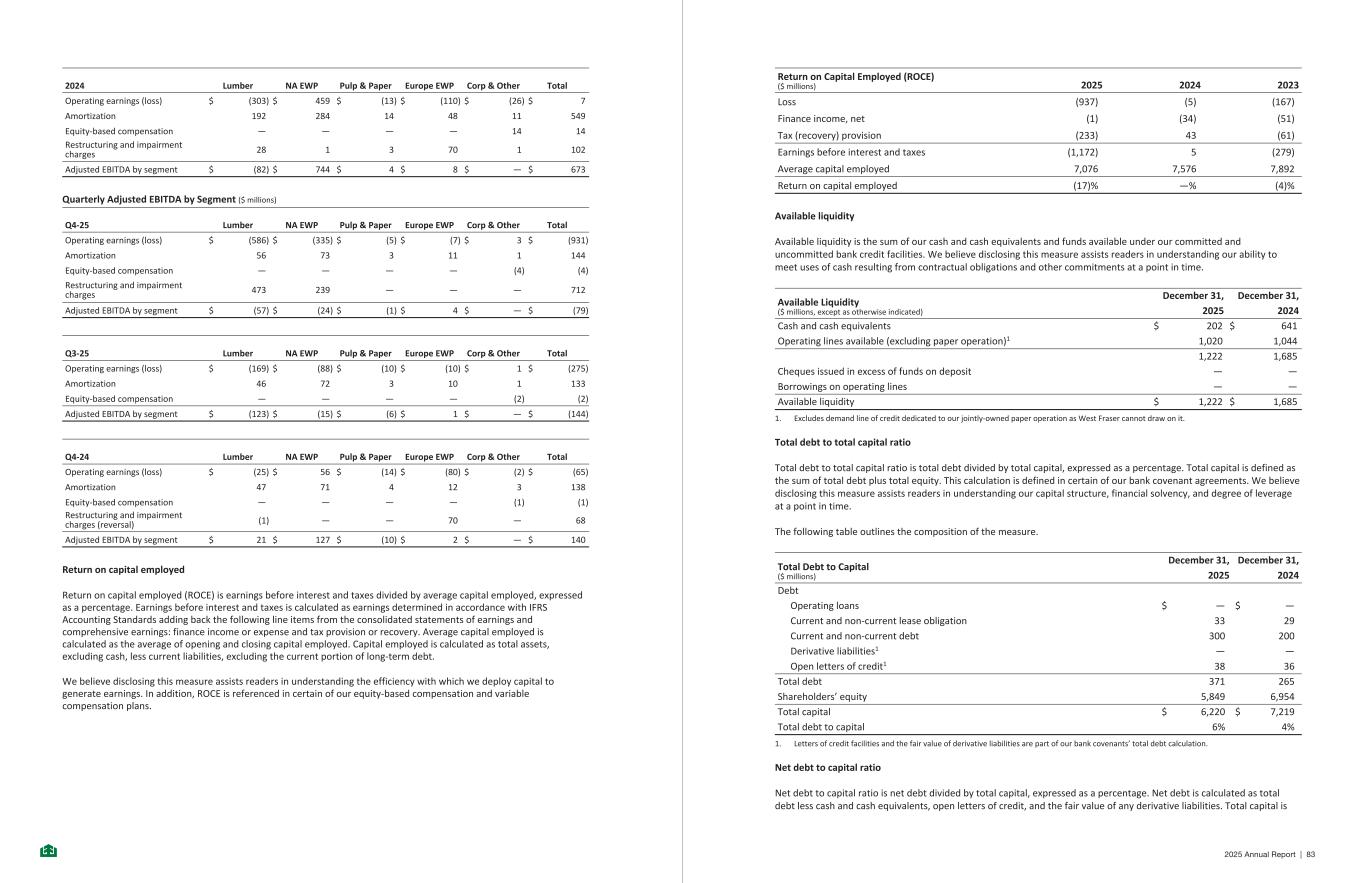 2024 Lumber NA EWP Pulp & Paper Europe EWP Corp & Other Total Operating earnings (loss) $ (303) $ 459 $ (13) $ (110) $ (26) $ 7 Amortization 192 284 14 48 11 549 Equity-based compensation — — — — 14 14 Restructuring and impairment charges 28 1 3 70 1 102 Adjusted EBITDA by segment $ (82) $ 744 $ 4 $ 8 $ — $ 673 Quarterly Adjusted EBITDA by Segment ($ millions) Q4-25 Lumber NA EWP Pulp & Paper Europe EWP Corp & Other Total Operating earnings (loss) $ (586) $ (335) $ (5) $ (7) $ 3 $ (931) Amortization 56 73 3 11 1 144 Equity-based compensation — — — — (4) (4) Restructuring and impairment charges 473 239 — — — 712 Adjusted EBITDA by segment $ (57) $ (24) $ (1) $ 4 $ — $ (79) Q3-25 Lumber NA EWP Pulp & Paper Europe EWP Corp & Other Total Operating earnings (loss) $ (169) $ (88) $ (10) $ (10) $ 1 $ (275) Amortization 46 72 3 10 1 133 Equity-based compensation — — — — (2) (2) Adjusted EBITDA by segment $ (123) $ (15) $ (6) $ 1 $ — $ (144) Q4-24 Lumber NA EWP Pulp & Paper Europe EWP Corp & Other Total Operating earnings (loss) $ (25) $ 56 $ (14) $ (80) $ (2) $ (65) Amortization 47 71 4 12 3 138 Equity-based compensation — — — — (1) (1) Restructuring and impairment charges (reversal) (1) — — 70 — 68 Adjusted EBITDA by segment $ 21 $ 127 $ (10) $ 2 $ — $ 140 Return on capital employed Return on capital employed (ROCE) is earnings before interest and taxes divided by average capital employed, expressed as a percentage. Earnings before interest and taxes is calculated as earnings determined in accordance with IFRS Accounting Standards adding back the following line items from the consolidated statements of earnings and comprehensive earnings: finance income or expense and tax provision or recovery. Average capital employed is calculated as the average of opening and closing capital employed. Capital employed is calculated as total assets, excluding cash, less current liabilities, excluding the current portion of long-term debt. We believe disclosing this measure assists readers in understanding the efficiency with which we deploy capital to generate earnings. In addition, ROCE is referenced in certain of our equity-based compensation and variable compensation plans. - 63 - Return on Capital Employed (ROCE) ($ millions) 2025 2024 2023 Loss (937) (5) (167) Finance income, net (1) (34) (51) Tax (recovery) provision (233) 43 (61) Earnings before interest and taxes (1,172) 5 (279) Average capital employed 7,076 7,576 7,892 Return on capital employed (17) % — % (4) % Available liquidity Available liquidity is the sum of our cash and cash equivalents and funds available under our committed and uncommitted bank credit facilities. We believe disclosing this measure assists readers in understanding our ability to meet uses of cash resulting from contractual obligations and other commitments at a point in time. Available Liquidity ($ millions, except as otherwise indicated) December 31, December 31, 2025 2024 Cash and cash equivalents $ 202 $ 641 Operating lines available (excluding paper operation)1 1,020 1,044 1,222 1,685 Cheques issued in excess of funds on deposit — — Borrowings on operating lines — — Available liquidity $ 1,222 $ 1,685 1. Excludes demand line of credit dedicated to our jointly-owned paper operation as West Fraser cannot draw on it. Total debt to total capital ratio Total debt to total capital ratio is total debt divided by total capital, expressed as a percentage. Total capital is defined as the sum of total debt plus total equity. This calculation is defined in certain of our bank covenant agreements. We believe disclosing this measure assists readers in understanding our capital structure, financial solvency, and degree of leverage at a point in time. The following table outlines the composition of the measure. Total Debt to Capital ($ millions) December 31, December 31, 2025 2024 Debt Operating loans $ — $ — Current and non-current lease obligation 33 29 Current and non-current debt 300 200 Derivative liabilities1 — — Open letters of credit1 38 36 Total debt 371 265 Shareholders’ equity 5,849 6,954 Total capital $ 6,220 $ 7,219 Total debt to capital 6 % 4 % 1. Letters of credit facilities and the fair value of derivative liabilities are part of our bank covenants’ total debt calculation. Net debt to capital ratio Net debt to capital ratio is net debt divided by total capital, expressed as a percentage. Net debt is calculated as total debt less cash and cash equivalents, open letters of credit, and the fair value of any derivative liabilities. Total capital is - 64 - 2025 Annual Report | 83