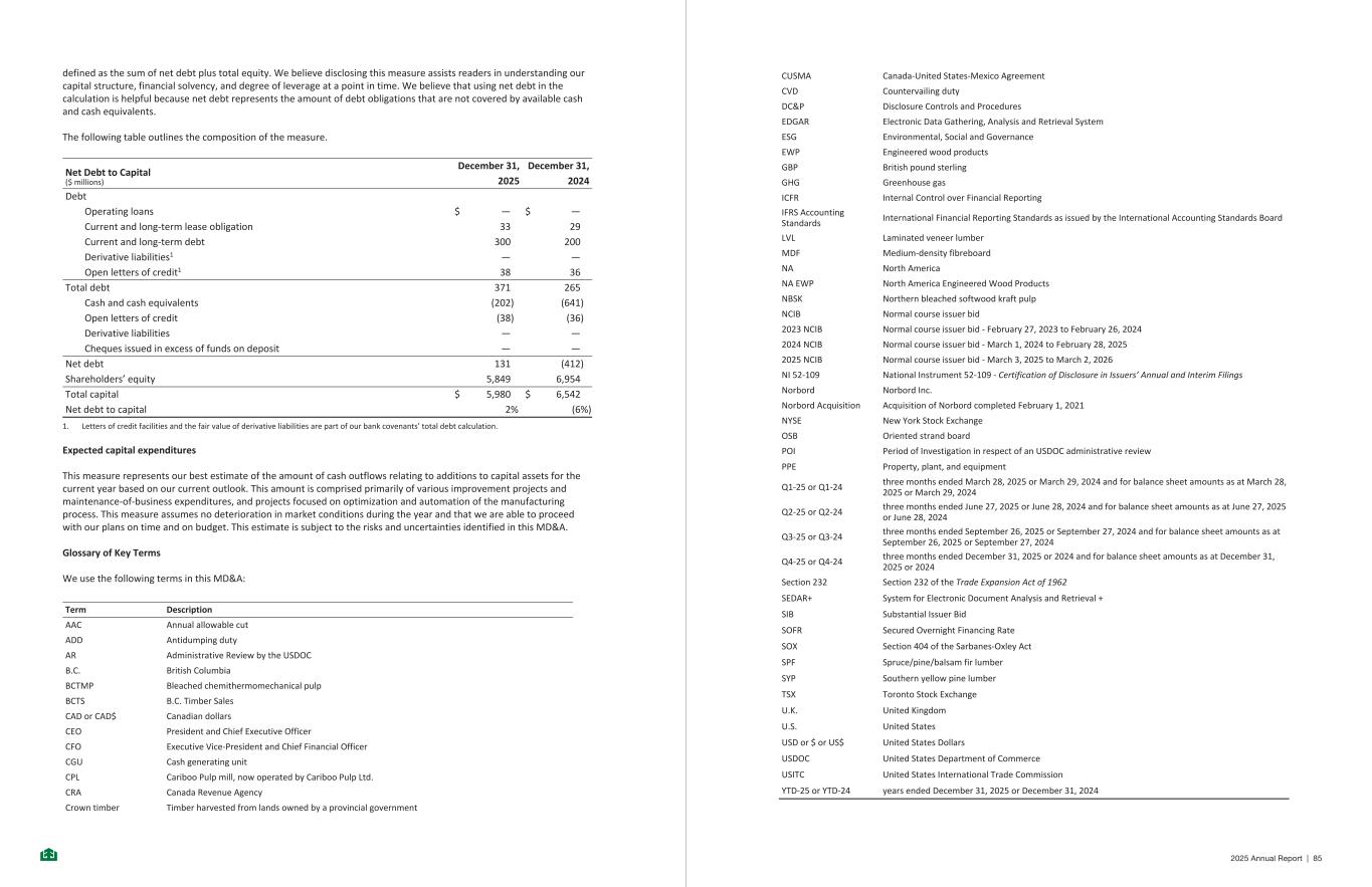 defined as the sum of net debt plus total equity. We believe disclosing this measure assists readers in understanding our capital structure, financial solvency, and degree of leverage at a point in time. We believe that using net debt in the calculation is helpful because net debt represents the amount of debt obligations that are not covered by available cash and cash equivalents. The following table outlines the composition of the measure. Net Debt to Capital ($ millions) December 31, December 31, 2025 2024 Debt Operating loans $ — $ — Current and long-term lease obligation 33 29 Current and long-term debt 300 200 Derivative liabilities1 — — Open letters of credit1 38 36 Total debt 371 265 Cash and cash equivalents (202) (641) Open letters of credit (38) (36) Derivative liabilities — — Cheques issued in excess of funds on deposit — — Net debt 131 (412) Shareholders’ equity 5,849 6,954 Total capital $ 5,980 $ 6,542 Net debt to capital 2% (6%) 1. Letters of credit facilities and the fair value of derivative liabilities are part of our bank covenants’ total debt calculation. Expected capital expenditures This measure represents our best estimate of the amount of cash outflows relating to additions to capital assets for the current year based on our current outlook. This amount is comprised primarily of various improvement projects and maintenance-of-business expenditures, and projects focused on optimization and automation of the manufacturing process. This measure assumes no deterioration in market conditions during the year and that we are able to proceed with our plans on time and on budget. This estimate is subject to the risks and uncertainties identified in this MD&A. Glossary of Key Terms We use the following terms in this MD&A: Term Description AAC Annual allowable cut ADD Antidumping duty AR Administrative Review by the USDOC B.C. British Columbia BCTMP Bleached chemithermomechanical pulp BCTS B.C. Timber Sales CAD or CAD$ Canadian dollars CEO President and Chief Executive Officer CFO Executive Vice-President and Chief Financial Officer CGU Cash generating unit CPL Cariboo Pulp mill, now operated by Cariboo Pulp Ltd. CRA Canada Revenue Agency Crown timber Timber harvested from lands owned by a provincial government - 65 - CUSMA Canada-United States-Mexico Agreement CVD Countervailing duty DC&P Disclosure Controls and Procedures EDGAR Electronic Data Gathering, Analysis and Retrieval System ESG Environmental, Social and Governance EWP Engineered wood products GBP British pound sterling GHG Greenhouse gas ICFR Internal Control over Financial Reporting IFRS Accounting Standards International Financial Reporting Standards as issued by the International Accounting Standards Board LVL Laminated veneer lumber MDF Medium-density fibreboard NA North America NA EWP North America Engineered Wood Products NBSK Northern bleached softwood kraft pulp NCIB Normal course issuer bid 2023 NCIB Normal course issuer bid - February 27, 2023 to February 26, 2024 2024 NCIB Normal course issuer bid - March 1, 2024 to February 28, 2025 2025 NCIB Normal course issuer bid - March 3, 2025 to March 2, 2026 NI 52-109 National Instrument 52-109 - Certification of Disclosure in Issuers’ Annual and Interim Filings Norbord Norbord Inc. Norbord Acquisition Acquisition of Norbord completed February 1, 2021 NYSE New York Stock Exchange OSB Oriented strand board POI Period of Investigation in respect of an USDOC administrative review PPE Property, plant, and equipment Q1-25 or Q1-24 three months ended March 28, 2025 or March 29, 2024 and for balance sheet amounts as at March 28, 2025 or March 29, 2024 Q2-25 or Q2-24 three months ended June 27, 2025 or June 28, 2024 and for balance sheet amounts as at June 27, 2025 or June 28, 2024 Q3-25 or Q3-24 three months ended September 26, 2025 or September 27, 2024 and for balance sheet amounts as at September 26, 2025 or September 27, 2024 Q4-25 or Q4-24 three months ended December 31, 2025 or 2024 and for balance sheet amounts as at December 31, 2025 or 2024 Section 232 Section 232 of the Trade Expansion Act of 1962 SEDAR+ System for Electronic Document Analysis and Retrieval + SIB Substantial Issuer Bid SOFR Secured Overnight Financing Rate SOX Section 404 of the Sarbanes-Oxley Act SPF Spruce/pine/balsam fir lumber SYP Southern yellow pine lumber TSX Toronto Stock Exchange U.K. United Kingdom U.S. United States USD or $ or US$ United States Dollars USDOC United States Department of Commerce USITC United States International Trade Commission YTD-25 or YTD-24 years ended December 31, 2025 or December 31, 2024 - 66 - 2025 Annual Report | 85