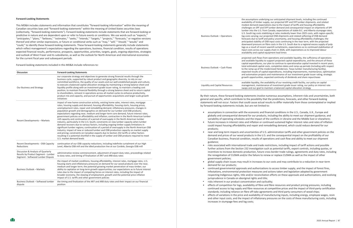 Forward-Looking Statements This MD&A includes statements and information that constitutes “forward-looking information” within the meaning of Canadian securities laws and “forward-looking statements” within the meaning of United States securities laws (collectively, “forward-looking statements”). Forward-looking statements include statements that are forward-looking or predictive in nature and are dependent upon or refer to future events or conditions. We use words such as “expects,” “anticipates,” “plans,” “believes,” “estimates,” “seeks,” “intends,” “targets,” “projects,” “forecasts,” or negative versions thereof and other similar expressions, or future or conditional verbs such as “may,” “will,” “should,” “would,” and “could,” to identify these forward-looking statements. These forward-looking statements generally include statements which reflect management’s expectations regarding the operations, business, financial condition, results of operations expected financial results, performance, prospects, opportunities, priorities, targets, goals, ongoing objectives, strategies and outlook of West Fraser and its subsidiaries, as well as the outlook for North American and international economies for the current fiscal year and subsequent periods. Forward-looking statements included in this MD&A include references to: Discussion Forward-Looking Statements Our Business and Strategy our corporate strategy and objectives to generate strong financial results through the business cycle, supported by robust product and geographic diversity, to rely on our committed workforce, the quality of our assets and our well-established people and culture, to execute a balanced capital allocation strategy by maintaining a strong balance sheet and liquidity profile along with an investment-grade issuer rating, to maintain a leading cost position, to maintain financial flexibility through a strong balance sheet and to return capital to shareholders, reinvest in operations across all market cycles to enhance productivity, product mix and capacity, and pursuit of opportunistic acquisitions and larger-scale growth initiatives Recent Developments – Markets impact of new home construction activity, existing home sales, interest rates, mortgage rates, housing supply and demand, housing affordability, housing starts, housing prices, unemployment rates, repair and remodelling demand, inflationary pressures, changes in population growth and demographics on demand for our lumber and OSB products; expectations regarding near, medium and longer-term core demand, future interest rates, government policies on affordability and inflation; contraction in the North American lumber mill capacity and continuation of a period of oversupply in the North American lumber industry, particularly in the U.S. South; constraints on new lumber capacity when lumber demand recovers due to various factors, including ongoing timber supply limitations in significant lumber regions; continuation of a period of oversupply in the North American OSB industry; impact of new or reduced lumber and OSB production capacity on market supply and pricing; constraints on Canadian exports due to Section 232 tariffs or other factors resulting in a potential shortfall in the supply of lumber and OSB products required to meet U.S. market demand levels Recent Developments - OSB Capacity Reductions continuation of our OSB capacity reductions, including indefinite curtailment of our High Level, Alberta OSB mill and the idled production line at our Cordele, Georgia OSB mill Discussion & Analysis of Quarterly Results by Product Segment - Lumber Segment - Softwood Lumber Dispute administrative review commencement, adjustment of export duty rates, proceedings related to duty rates, and timing of finalization of AR7 and AR8 duty rates Business Outlook – Markets the impact of market conditions, housing affordability, interest rates, mortgage rates, U.S. housing starts and inflationary pressures on demand for our wood products over the near, medium and longer term; the potential growing market penetration of mass timber; our ability to capitalize on long-term growth opportunities; our expectations as to future interest rates due to the impact of competing forces on interest rates, including the impact of broader economy, the slowing of employment, growth and the potential price inflation impact of U.S. tariffs and other government policies Business Outlook – Softwood lumber dispute the timing and finalization of the AR7 and AR8 duty rates and their impact on our financial position - 67 - Business Outlook – Operations the assumptions underlying our anticipated shipment levels, including the continued availability of timber supply, our projected SPF and SYP lumber shipments, and related modest demand expectations due to the impact of tariffs and housing affordability challenges on SPF and SYP lumber demand and consequential impact on shipments of SPF lumber into the U.S. from Canada, expectations of stable B.C. and Alberta stumpage rates, U.S. South log costs stabilizing at rates modestly lower than 2025 costs, with region-specific log costs varying; our projected OSB shipments and related softening of OSB demand forecasts due to tariff and policy uncertainty, and housing affordability challenges; the anticipated stability of OSB input costs continuing in the near term, with the projected downward pressure on fibre costs in the U.S. South due to a regional excess supply of pulp logs as a result of recent sawmill curtailments, expectations as to continued stabilization of input costs across our supply chain in 2026, with expectations as to improved labour availability and capital equipment lead times Business Outlook – Cash Flows projected cash flows from operations and available liquidity, the sufficiency of operations and available liquidity to support projected capital expenditures, and 