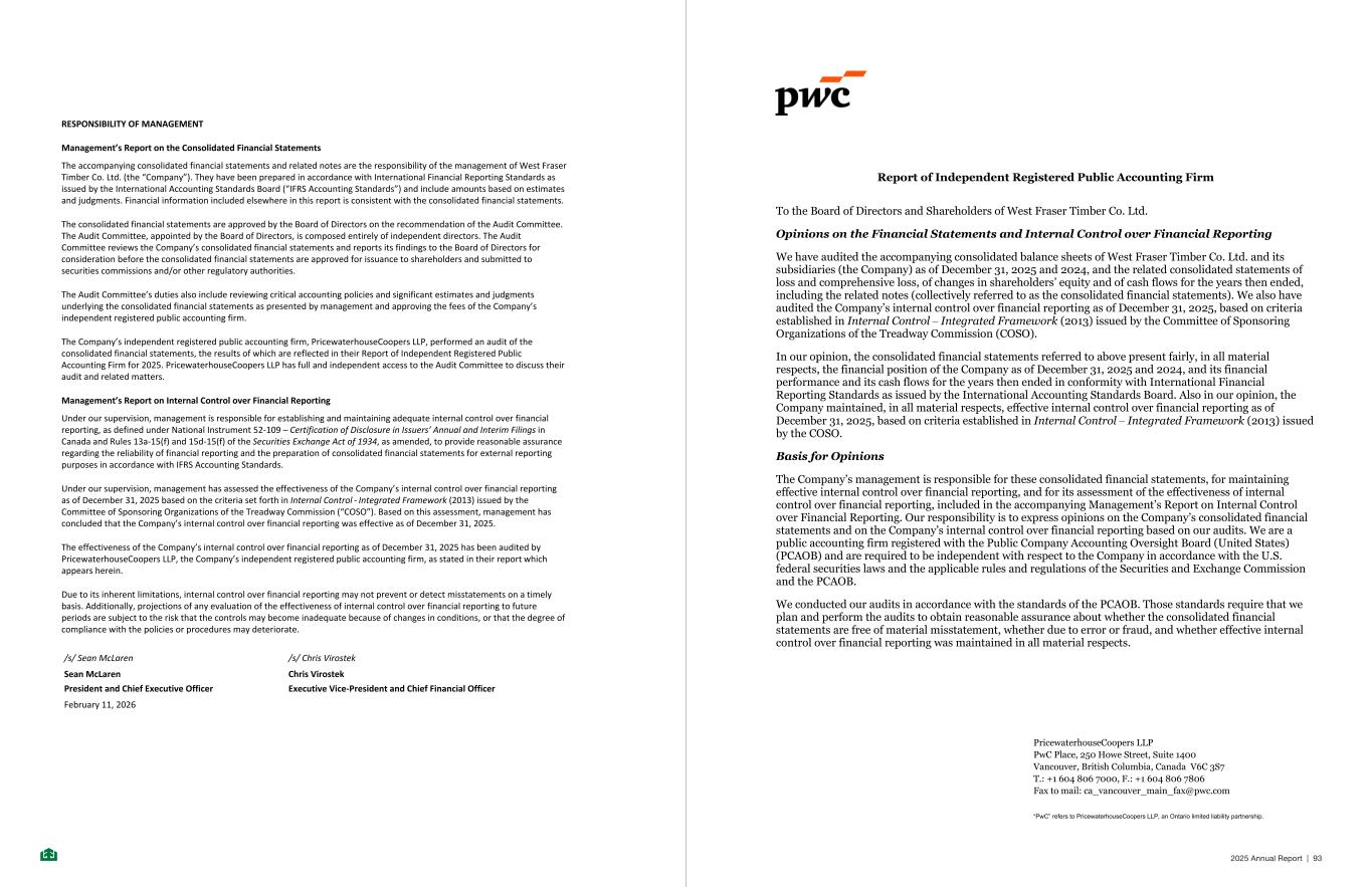 RESPONSIBILITY OF MANAGEMENT Management’s Report on the Consolidated Financial Statements The accompanying consolidated financial statements and related notes are the responsibility of the management of West Fraser Timber Co. Ltd. (the “Company”). They have been prepared in accordance with International Financial Reporting Standards as issued by the International Accounting Standards Board (“IFRS Accounting Standards”) and include amounts based on estimates and judgments. Financial information included elsewhere in this report is consistent with the consolidated financial statements. The consolidated financial statements are approved by the Board of Directors on the recommendation of the Audit Committee. The Audit Committee, appointed by the Board of Directors, is composed entirely of independent directors. The Audit Committee reviews the Company’s consolidated financial statements and reports its findings to the Board of Directors for consideration before the consolidated financial statements are approved for issuance to shareholders and submitted to securities commissions and/or other regulatory authorities. The Audit Committee’s duties also include reviewing critical accounting policies and significant estimates and judgments underlying the consolidated financial statements as presented by management and approving the fees of the Company’s independent registered public accounting firm. The Company’s independent registered public accounting firm, PricewaterhouseCoopers LLP, performed an audit of the consolidated financial statements, the results of which are reflected in their Report of Independent Registered Public Accounting Firm for 2025. PricewaterhouseCoopers LLP has full and independent access to the Audit Committee to discuss their audit and related matters. Management’s Report on Internal Control over Financial Reporting Under our supervision, management is responsible for establishing and maintaining adequate internal control over financial reporting, as defined under National Instrument 52-109 – Certification of Disclosure in Issuers’ Annual and Interim Filings in Canada and Rules 13a-15(f) and 15d-15(f) of the Securities Exchange Act of 1934, as amended, to provide reasonable assurance regarding the reliability of financial reporting and the preparation of consolidated financial statements for external reporting purposes in accordance with IFRS Accounting Standards. Under our supervision, management has assessed the effectiveness of the Company’s internal control over financial reporting as of December 31, 2025 based on the criteria set forth in Internal Control - Integrated Framework (2013) issued by the Committee of Sponsoring Organizations of the Treadway Commission (“COSO”). Based on this assessment, management has concluded that the Company’s internal control over financial reporting was effective as of December 31, 2025. The effectiveness of the Company’s internal control over financial reporting as of December 31, 2025 has been audited by PricewaterhouseCoopers LLP, the Company’s independent registered public accounting firm, as stated in their report which appears herein. Due to its inherent limitations, internal control over financial reporting may not prevent or detect misstatements on a timely basis. Additionally, projections of any evaluation of the effectiveness of internal control over financial reporting to future periods are subject to the risk that the controls may become inadequate because of changes in conditions, or that the degree of compliance with the policies or procedures may deteriorate. /s/ Sean McLaren /s/ Chris Virostek Sean McLaren Chris Virostek President and Chief Executive Officer Executive Vice-President and Chief Financial Officer February 11, 2026 -2- PricewaterhouseCoopers LLP PwC Place, 250 Howe Street, Suite 1400 Vancouver, British Columbia, Canada V6C 3S7 T.: +1 604 806 7000, F.: +1 604 806 7806 Fax to mail: ca_vancouver_main_fax@pwc.com “PwC” refers to PricewaterhouseCoopers LLP, an Ontario limited liability partnership. Report of Independent Registered Public Accounting Firm To the Board of Directors and Shareholders of West Fraser Timber Co. Ltd. Opinions on the Financial Statements and Internal Control over Financial Reporting We have audited the accompanying consolidated balance sheets of West Fraser Timber Co. Ltd. and its subsidiaries (the Company) as of December 31, 2025 and 2024, and the related consolidated statements of loss and comprehensive loss, of changes in shareholders’ equity and of cash flows for the years then ended, including the related notes (collectively referred to as the consolidated financial statements). We also have audited the Company’s internal control over financial reporting as of December 31, 2025, based on criteria established in Internal Control ‒ Integrated Framework (2013) issued by the Committee of Sponsoring Organizations of the Treadway Commission (COSO). In our opinion, the consolidated financial statements referred to above present fairly, in all material respects, the financial position of the Company as of December 31, 2025 and 2024, and its financial performance and its cash flows for the years then ended in conformity with International Financial Reporting Standards as issued by the International Accounting Standards Board. Also in our opinion, the Company maintained, in all material respects, effective internal control over financial reporting as of December 31, 2025, based on criteria established in Internal Control ‒ Integrated Framework (2013) issued by the COSO. Basis for Opinions The Company’s management is responsible for these consolidated financial statements, for maintaining effective internal control over financial reporting, and for its assessment of the effectiveness of internal control over financial reporting, included in the accompanying Management’s Report on Internal Control over Financial Reporting. Our responsibility i