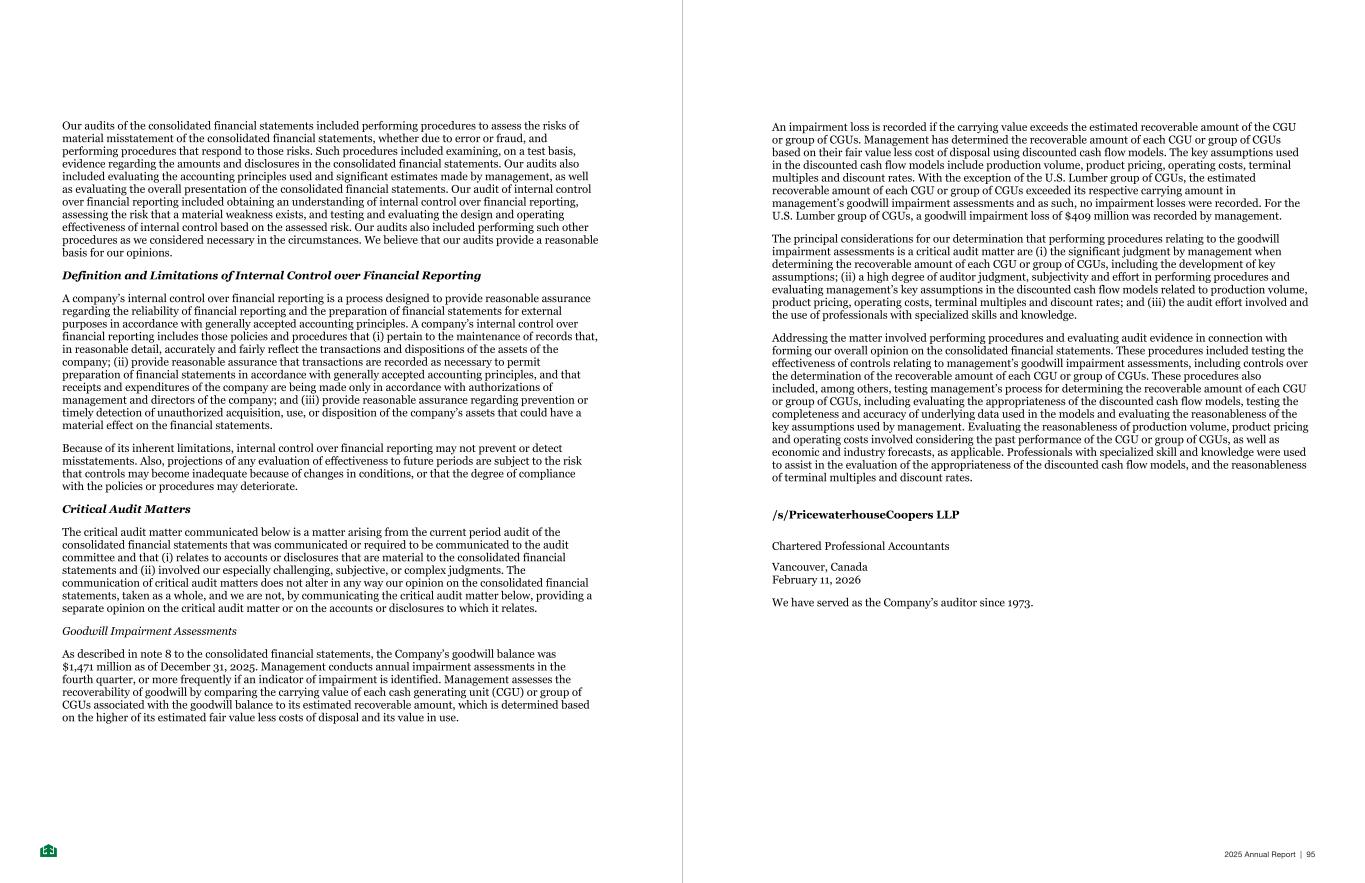 Our audits of the consolidated financial statements included performing procedures to assess the risks of material misstatement of the consolidated financial statements, whether due to error or fraud, and performing procedures that respond to those risks. Such procedures included examining, on a test basis, evidence regarding the amounts and disclosures in the consolidated financial statements. Our audits also included evaluating the accounting principles used and significant estimates made by management, as well as evaluating the overall presentation of the consolidated financial statements. Our audit of internal control over financial reporting included obtaining an understanding of internal control over financial reporting, assessing the risk that a material weakness exists, and testing and evaluating the design and operating effectiveness of internal control based on the assessed risk. Our audits also included performing such other procedures as we considered necessary in the circumstances. We believe that our audits provide a reasonable basis for our opinions. Definition and Limitations of Internal Control over Financial Reporting A company’s internal control over financial reporting is a process designed to provide reasonable assurance regarding the reliability of financial reporting and the preparation of financial statements for external purposes in accordance with generally accepted accounting principles. A company’s internal control over financial reporting includes those policies and procedures that (i) pertain to the maintenance of records that, in reasonable detail, accurately and fairly reflect the transactions and dispositions of the assets of the company; (ii) provide reasonable assurance that transactions are recorded as necessary to permit preparation of financial statements in accordance with generally accepted accounting principles, and that receipts and expenditures of the company are being made only in accordance with authorizations of management and directors of the company; and (iii) provide reasonable assurance regarding prevention or timely detection of unauthorized acquisition, use, or disposition of the company’s assets that could have a material effect on the financial statements. Because of its inherent limitations, internal control over financial reporting may not prevent or detect misstatements. Also, projections of any evaluation of effectiveness to future periods are subject to the risk that controls may become inadequate because of changes in conditions, or that the degree of compliance with the policies or procedures may deteriorate. Critical Audit Matters The critical audit matter communicated below is a matter arising from the current period audit of the consolidated financial statements that was communicated or required to be communicated to the audit committee and that (i) relates to accounts or disclosures that are material to the consolidated financial statements and (ii) involved our especially challenging, subjective, or complex judgments. The communication of critical audit matters does not alter in any way our opinion on the consolidated financial statements, taken as a whole, and we are not, by communicating the critical audit matter below, providing a separate opinion on the critical audit matter or on the accounts or disclosures to which it relates. Goodwill Impairment Assessments As described in note 8 to the consolidated financial statements, the Company’s goodwill balance was $1,471 million as of December 31, 2025. Management conducts annual impairment assessments in the fourth quarter, or more frequently if an indicator of impairment is identified. Management assesses the recoverability of goodwill by comparing the carrying value of each cash generating unit (CGU) or group of CGUs associated with the goodwill balance to its estimated recoverable amount, which is determined based on the higher of its estimated fair value less costs of disposal and its value in use. An impairment loss is recorded if the carrying value exceeds the estimated recoverable amount of the CGU or group of CGUs. Management has determined the recoverable amount of each CGU or group of CGUs based on their fair value less cost of disposal using discounted cash flow models. The key assumptions used in the discounted cash flow models include production volume, product pricing, operating costs, terminal multiples and discount rates. With the exception of the U.S. Lumber group of CGUs, the estimated recoverable amount of each CGU or group of CGUs exceeded its respective carrying amount in management’s goodwill impairment assessments and as such, no impairment losses were recorded. For the U.S. Lumber group of CGUs, a goodwill impairment loss of $409 million was recorded by management. The principal considerations for our determination that performing procedures relating to the goodwill impairment assessments is a critical audit matter are (i) the significant judgment by management when determining the recoverable amount of each CGU or group of CGUs, including the development of key assumptions; (ii) a high degree of auditor judgment, subjectivity and effort in performing procedures and evaluating management’s key assumptions in the discounted cash flow models related to production volume, product pricing, operating costs, terminal multiples and discount rates; and (iii) the audit effort involved and the use of professionals with specialized skills and knowledge. Addressing the matter involved performing procedures and evaluating audit evidence in connection with forming our overall opinion on the consolidated financial statements. These procedures included testing the effectiveness of controls relating to management’s goodwill impairment assessments, including controls over the determination of the recoverable amount of each CGU or group of CGUs. These procedures also included, among others, testing management’s process for determining the recoverable am