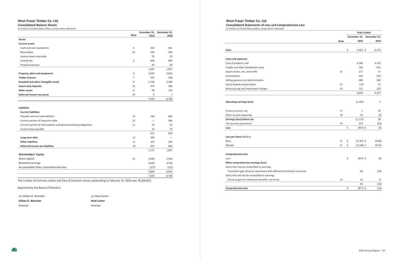 West Fraser Timber Co. Ltd. Consolidated Balance Sheets (in millions of United States dollars, except where indicated) December 31, December 31, Note 2025 2024 Assets Current assets Cash and cash equivalents 4 202 641 Receivables 22 244 294 Income taxes receivable 79 22 Inventories 5 828 844 Prepaid expenses 34 36 1,387 1,837 Property, plant and equipment 6 3,593 3,842 Timber licences 7 335 358 Goodwill and other intangible assets 8 1,726 2,180 Export duty deposits 25 474 408 Other assets 9 99 129 Deferred income tax assets 19 6 7 7,620 8,760 Liabilities Current liabilities Payables and accrued liabilities 10 584 604 Current portion of long-term debt 12 — 200 Current portion of reforestation and decommissioning obligations 11 52 55 Income taxes payable 14 75 651 934 Long-term debt 12 300 — Other liabilities 11 423 264 Deferred income tax liabilities 19 397 609 1,771 1,807 Shareholders’ Equity Share capital 14 2,496 2,549 Retained earnings 3,630 4,726 Accumulated other comprehensive loss (277) (321) 5,849 6,954 7,620 8,760 The number of Common shares and Class B Common shares outstanding at February 10, 2026 was 78,299,822. Approved by the Board of Directors /s/ Gillian D. Winckler /s/ Reid Carter Gillian D. Winckler Reid Carter Director Director -6- West Fraser Timber Co. Ltd. Consolidated Statements of Loss and Comprehensive Loss (in millions of United States dollars, except where indicated) Years Ended December 31, December 31, Note 2025 2024 Sales $ 5,462 $ 6,174 Costs and expenses Cost of products sold 4,184 4,333 Freight and other distribution costs 766 815 Export duties, net, and tariffs 25 177 72 Amortization 544 549 Selling, general and administration 280 282 Equity-based compensation 15 (14) 14 Restructuring and impairment charges 16 712 102 6,649 6,167 Operating earnings (loss) (1,187) 7 Finance income, net 17 1 34 Other income (expense) 18 15 (2) Earnings (loss) before tax (1,171) 38 Tax recovery (provision) 19 233 (43) Loss $ (937) $ (5) Loss per share (dollars) Basic 21 $ (11.87) $ (0.06) Diluted 21 $ (12.08) $ (0.07) Comprehensive loss Loss $ (937) $ (5) Other comprehensive earnings (loss) Items that may be reclassified to earnings Translation gain (loss) on operations with different functional currencies 44 (24) Items that will not be reclassified to earnings Actuarial gain on retirement benefits, net of tax 13 16 8 60 (16) Comprehensive loss $ (877) $ (21) -7- 2025 Annual Report | 97