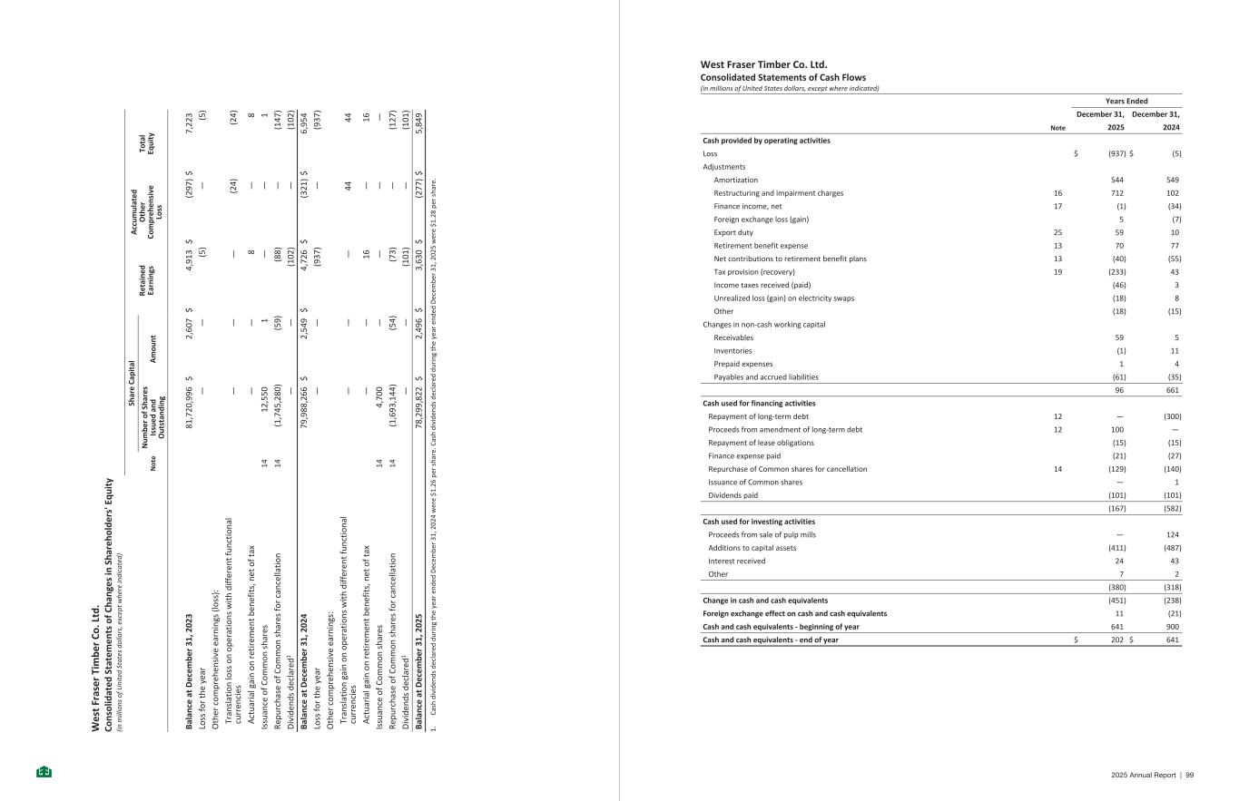 W es t Fr as er T im be r Co . L td . Co ns ol id at ed S ta te m en ts o f C ha ng es in S ha re ho ld er s' E qu it y (in m ill io ns o f U ni te d St at es d ol la rs , e xc ep t w he re in di ca te d) Sh ar e Ca pi ta l Re ta in ed Ea rn in gs A cc um ul at ed O th er Co m pr eh en si ve Lo ss To ta l Eq ui ty N ot e N um be r of S ha re s Is su ed a nd O ut st an di ng A m ou nt Ba la nc e at D ec em be r 31 , 2 02 3 81 ,7 20 ,9 96 $ 2, 60 7 $ 4, 91 3 $ (2 97 ) $ 7, 22 3 Lo ss fo r th e ye ar — — (5 ) — (5 ) O th er c om pr eh en si ve e ar ni ng s (lo ss ): Tr an sl at io n lo ss o n op er at io ns w ith d iff er en t f un ct io na l cu rr en ci es — — — (2 4) (2 4) A ct ua ri al g ai n on r et ir em en t b en ef its , n et o f t ax — — 8 — 8 Is su an ce o f C om m on s ha re s 14 12 ,5 50 1 — — 1 Re pu rc ha se o f C om m on s ha re s fo r ca nc el la tio n 14 (1 ,7 45 ,2 80 ) (5 9) (8 8) — (1 47 ) D iv id en ds d ec la re d1 — — (1 02 ) — (1 02 ) Ba la nc e at D ec em be r 31 , 2 02 4 79 ,9 88 ,2 66 $ 2, 54 9 $ 4, 72 6 $ (3 21 ) $ 6, 95 4 Lo ss fo r th e ye ar — — (9 37 ) — (9 37 ) O th er c om pr eh en si ve e ar ni ng s: Tr an sl at io n ga in o n op er at io ns w ith d iff er en t f un ct io na l cu rr en ci es — — — 44 44 A ct ua ri al g ai n on r et ir em en t b en ef its , n et o f t ax — — 16 — 16 Is su an ce o f C om m on s ha re s 14 4, 70 0 — — — — Re pu rc ha se o f C om m on s ha re s fo r ca nc el la tio n 14 (1 ,6 93 ,1 44 ) (5 4) (7 3) — (1 27 ) D iv id en ds d ec la re d1 — — (1 01 ) — (1 01 ) Ba la nc e at D ec em be r 31 , 2 02 5 78 ,2 99 ,8 22 $ 2, 49 6 $ 3, 63 0 $ (2 77 ) $ 5, 84 9 1. Ca sh d iv id en ds d ec la re d du ri ng th e ye ar e nd ed D ec em be r 3 1, 2 02 4 w er e $1 .2 6 pe r s ha re . C as h di vi de nd s de cl ar ed d ur in g th e ye ar e nd ed D ec em be r 3 1, 2 02 5 w er e $1 .2 8 pe r s ha re . -8 - West Fraser Timber Co. Ltd. Consolidated Statements of Cash Flows (in millions of United States dollars, except where indicated) Years Ended December 31, December 31, Note 2025 2024 Cash provided by operating activities Loss S E $ (937) $ (5) Adjustments Amortization S E 544 549 Restructuring and impairment charges 16 S E 712 102 Finance income, net 17 S E (1) (34) Foreign exchange loss (gain) S E 5 (7) Export duty 25 S E 59 10 Retirement benefit expense 13 S E 70 77 Net contributions to retirement benefit plans 13 S E (40) (55) Tax provision (recovery) 19 S E (233) 43 Income taxes received (paid) S E (46) 3 Unrealized loss (gain) on electricity swaps S E (18) 8 Other S E (18) (15) Changes in non-cash working capital Receivables S E 59 5 Inventories S E (1) 11 Prepaid expenses S E 1 4 Payables and accrued liabilities S E (61) (35) 96 661 Cash used for financing activities Repayment of long-term debt 12 — (300) Proceeds from amendment of long-term debt 12 S E 100 — Repayment of lease obligations S E (15) (15) Finance expense paid S E (21) (27) Repurchase of Common shares for cancellation 14 S E (129) (140) Issuance of Common shares S E — 1 Dividends paid S E (101) (101) (167) (582) Cash used for investing activities Proceeds from sale of pulp mills S E — 124 Additions to capital assets S E (411) (487) Interest received S E 24 43 Other S E 7 2 (380) (318) Change in cash and cash equivalents — (451) (238) Foreign exchange effect on cash and cash equivalents — 11 (21) Cash and cash equivalents - beginning of year — 641 900 Cash and cash equivalents - end of year $ 202 $ 641 -9- 2025 Annual Report | 99