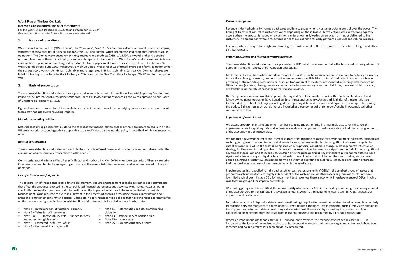 West Fraser Timber Co. Ltd. Notes to Consolidated Financial Statements For the years ended December 31, 2025 and December 31, 2024 (figures are in millions of United States dollars, except where indicated) 1. Nature of operations West Fraser Timber Co. Ltd. ("West Fraser", the “Company”, "we", "us" or "our") is a diversified wood products company with more than 50 facilities in Canada, the U.S., the U.K., and Europe, which promotes sustainable forest practices in its operations. The Company produces lumber, engineered wood products (OSB, LVL, MDF, plywood, and particleboard), northern bleached softwood kraft pulp, paper, wood chips, and other residuals. West Fraser's products are used in home construction, repair and remodelling, industrial applications, papers and tissue. Our executive office is located at 885 West Georgia Street, Suite 1500, Vancouver, British Columbia. West Fraser was formed by articles of amalgamation under the Business Corporations Act (British Columbia) and is registered in British Columbia, Canada. Our Common shares are listed for trading on the Toronto Stock Exchange (“TSX”) and on the New York Stock Exchange (“NYSE”) under the symbol WFG. 2. Basis of presentation These consolidated financial statements are prepared in accordance with International Financial Reporting Standards as issued by the International Accounting Standards Board (“IFRS Accounting Standards”) and were approved by our Board of Directors on February 11, 2026. Figures have been rounded to millions of dollars to reflect the accuracy of the underlying balances and as a result certain tables may not add due to rounding impacts. Material accounting policies Material accounting policies that relate to the consolidated financial statements as a whole are incorporated in this note. Where a material accounting policy is applicable to a specific note disclosure, the policy is described within the respective note. Basis of consolidation These consolidated financial statements include the accounts of West Fraser and its wholly-owned subsidiaries after the elimination of intercompany transactions and balances. Our material subsidiaries are West Fraser Mills Ltd. and Norbord Inc. Our 50%-owned joint operation, Alberta Newsprint Company, is accounted for by recognizing our share of the assets, liabilities, revenues, and expenses related to the joint operation. Use of estimates and judgments The preparation of these consolidated financial statements requires management to make estimates and assumptions that affect the amounts reported in the consolidated financial statements and accompanying notes. Actual amounts could differ materially from these and other estimates, the impact of which would be recorded in future periods. Management is also required to exercise judgment in the process of applying accounting policies. Information about areas of estimation uncertainty and critical judgments in applying accounting policies that have the most significant effect on the amounts recognized in the consolidated financial statements is included in the following notes: • Note 2 – Determination of functional currency • Note 5 – Valuation of inventories • Note 6-8, 16 – Recoverability of PPE, timber licences, and other intangible assets • Note 6 – Estimated useful lives of PPE • Note 8 – Recoverability of goodwill • Note 11 – Reforestation and decommissioning obligations • Note 13 – Defined benefit pension plans • Note 19 – Income taxes • Note 25 – CVD and ADD duty dispute -10- Revenue recognition Revenue is derived primarily from product sales and is recognized when a customer obtains control over the goods. The timing of transfer of control to customers varies depending on the individual terms of the sales contract and typically occurs when the product is loaded on a common carrier at our mill, loaded on an ocean carrier, or delivered to the customer. The amount of revenue recognized is net of our estimate for early payment discounts and volume rebates. Revenue includes charges for freight and handling. The costs related to these revenues are recorded in freight and other distribution costs. Reporting currency and foreign currency translation The consolidated financial statements are presented in USD, which is determined to be the functional currency of our U.S. operations and the majority of our Canadian operations. For these entities, all transactions not denominated in our U.S. functional currency are considered to be foreign currency transactions. Foreign currency denominated monetary assets and liabilities are translated using the rate of exchange prevailing at the reporting date. Gains or losses on translation of these items are included in earnings and reported as Other income (expense). Foreign currency denominated non-monetary assets and liabilities, measured at historic cost, are translated at the rate of exchange at the transaction date. Our European operations have British pound sterling and Euro functional currencies. Our Cochrane lumber mill and jointly-owned paper operation have Canadian dollar functional currency. Assets and liabilities of these entities are translated at the rate of exchange prevailing at the reporting date, and revenues and expenses at average rates during the period. Gains or losses on translation are included as a component of shareholders’ equity in Accumulated other comprehensive loss. Impairment of capital assets We assess property, plant and equipment, timber licences, and other finite-life intangible assets for indicators of impairment at each reporting date and whenever events or changes in circumstances indicate that the carrying amount of the asset may not be recoverable. We conduct a review of external and internal sources of information to assess for any impairment indicators. Examples of such triggering events related to our capital assets include, but are not limited to: a significant adverse change in the extent or 