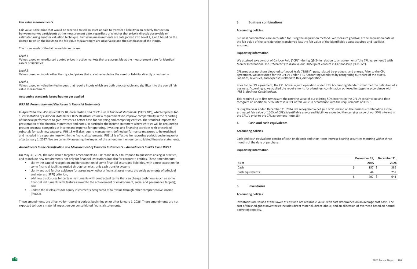 Fair value measurements Fair value is the price that would be received to sell an asset or paid to transfer a liability in an orderly transaction between market participants at the measurement date, regardless of whether that price is directly observable or estimated using another valuation technique. Fair value measurements are categorized into Level 1, 2 or 3 based on the degree to which the inputs to the fair value measurement are observable and the significance of the inputs. The three levels of the fair value hierarchy are: Level 1 Values based on unadjusted quoted prices in active markets that are accessible at the measurement date for identical assets or liabilities. Level 2 Values based on inputs other than quoted prices that are observable for the asset or liability, directly or indirectly. Level 3 Values based on valuation techniques that require inputs which are both unobservable and significant to the overall fair value measurement. Accounting standards issued but not yet applied IFRS 18, Presentation and Disclosure in Financial Statements In April 2024, the IASB issued IFRS 18, Presentation and Disclosure in Financial Statements ("IFRS 18"), which replaces IAS 1, Presentation of Financial Statements. IFRS 18 introduces new requirements to improve comparability in the reporting of financial performance to give investors a better basis for analyzing and comparing entities. The standard impacts the presentation of the financial statements and notes, in particular the income statement where entities will be required to present separate categories of income and expense for operating, investing, and financing activities with prescribed subtotals for each new category. IFRS 18 will also require management-defined performance measures to be explained and included in a separate note within the financial statements. IFRS 18 is effective for reporting periods beginning on or after January 1, 2027. We are currently assessing the impact of this amendment on our consolidated financial statements. Amendments to the Classification and Measurement of Financial Instruments – Amendments to IFRS 9 and IFRS 7 On May 30, 2024, the IASB issued targeted amendments to IFRS 9 and IFRS 7 to respond to questions arising in practice, and to include new requirements not only for financial institutions but also for corporate entities. These amendments: • clarify the date of recognition and derecognition of some financial assets and liabilities, with a new exception for some financial liabilities settled through an electronic cash transfer system; • clarify and add further guidance for assessing whether a financial asset meets the solely payments of principal and interest (SPPI) criterion; • add new disclosures for certain instruments with contractual terms that can change cash flows (such as some financial instruments with features linked to the achievement of environment, social and governance targets); and • update the disclosures for equity instruments designated at fair value through other comprehensive income (FVOCI). These amendments are effective for reporting periods beginning on or after January 1, 2026. These amendments are not expected to have a material impact on our consolidated financial statements. -12- 3. Business combinations Accounting policies Business combinations are accounted for using the acquisition method. We measure goodwill at the acquisition date as the fair value of the consideration transferred less the fair value of the identifiable assets acquired and liabilities assumed. Supporting information We attained sole control of Cariboo Pulp (“CPL”) during Q1-24 in relation to an agreement (“the CPL agreement”) with Mercer International Inc. (“Mercer”) to dissolve our 50/50 joint venture in Cariboo Pulp (“CPL JV”). CPL produces northern bleached softwood kraft (“NBSK”) pulp, related by-products, and energy. Prior to the CPL agreement, we accounted for the CPL JV under IFRS Accounting Standards by recognizing our share of the assets, liabilities, revenues, and expenses related to this joint operation. Prior to the CPL agreement, the CPL JV was a joint operation under IFRS Accounting Standards that met the definition of a business. Accordingly, we applied the requirements for a business combination achieved in stages in accordance with IFRS 3, Business Combinations. This required us to first remeasure the carrying value of our existing 50% interest in the CPL JV to fair value and then recognize an additional 50% interest in CPL at fair value in accordance with the requirements of IFRS 3. During the year ended December 31, 2024, we recognized a net gain of $1 million on the business combination as the estimated fair value of 100% of CPL’s identifiable assets and liabilities exceeded the carrying value of our 50% interest in the CPL JV prior to the CPL agreement (note 18). 4. Cash and cash equivalents Accounting policies Cash and cash equivalents consist of cash on deposit and short-term interest-bearing securities maturing within three months of the date of purchase. Supporting information December 31, December 31, As at 2025 2024 Cash $ 157 $ 389 Cash equivalents 44 252 $ 202 $ 641 5. Inventories Accounting policies Inventories are valued at the lower of cost and net realizable value, with cost determined on an average cost basis. The cost of finished goods inventories includes direct material, direct labour, and an allocation of overhead based on normal operating capacity. -13- 2025 Annual Report | 103